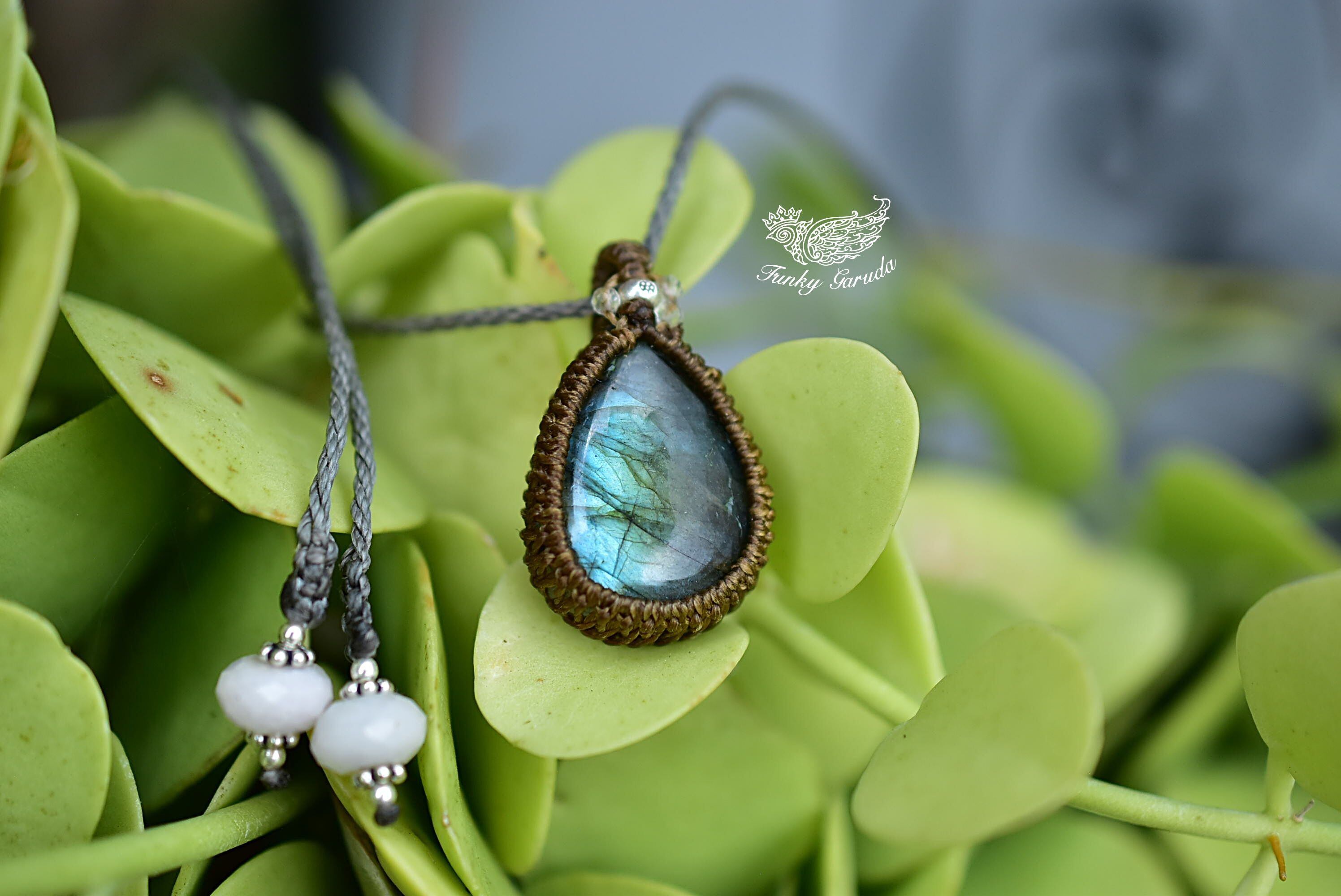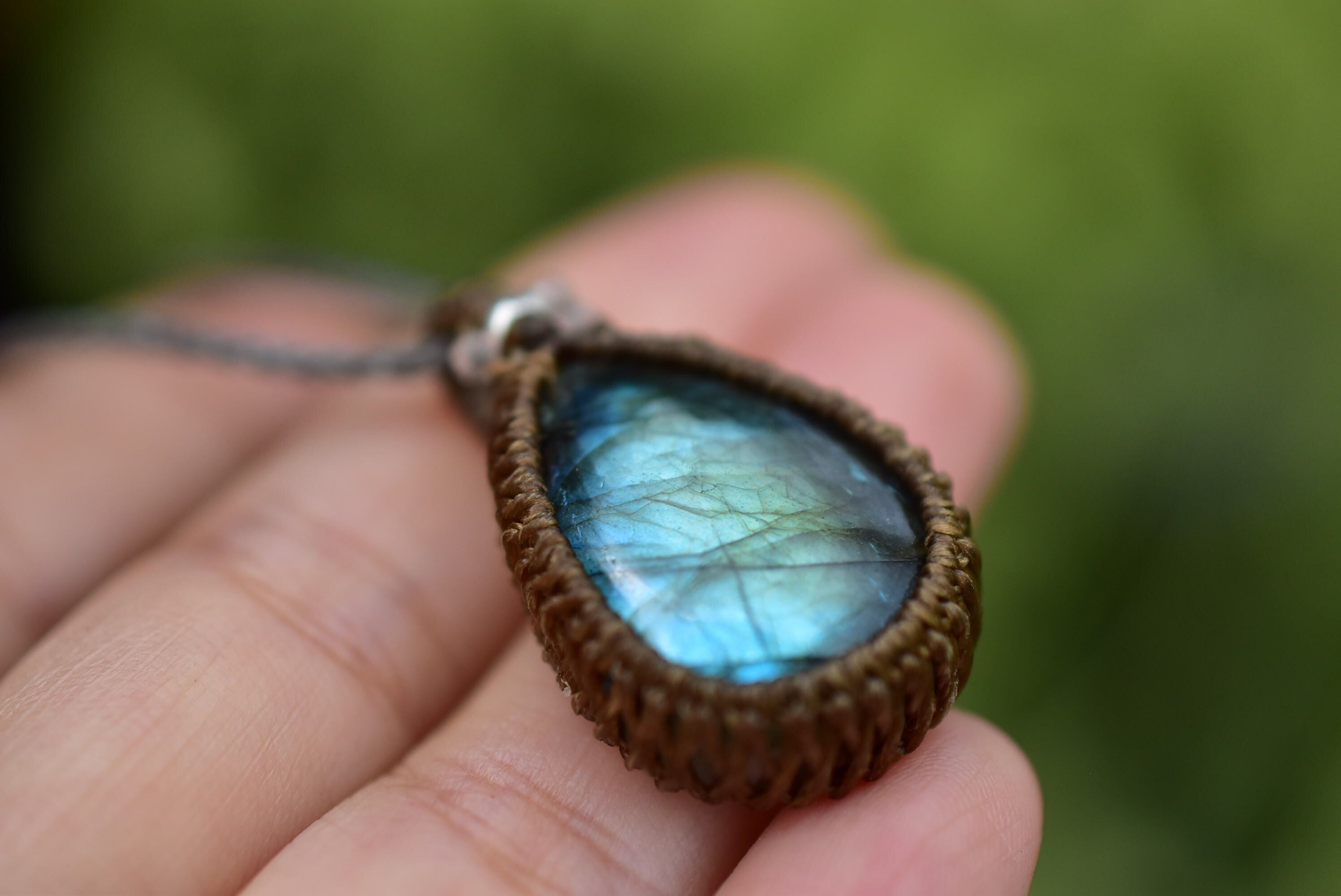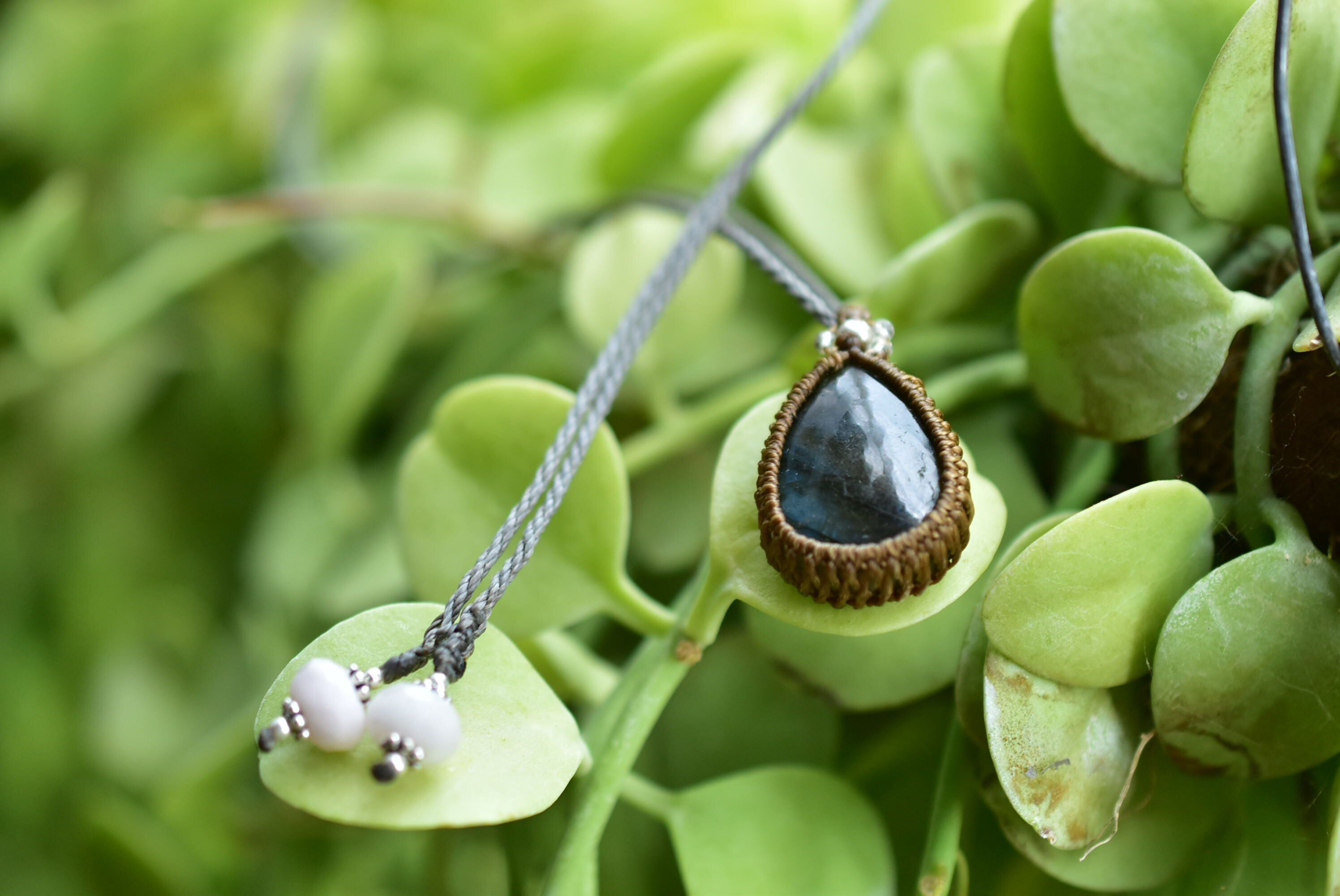 華やかさと上品さを兼ね備えたラブラドライトを、シンプルなマクラメペンダントに仕上げました。
