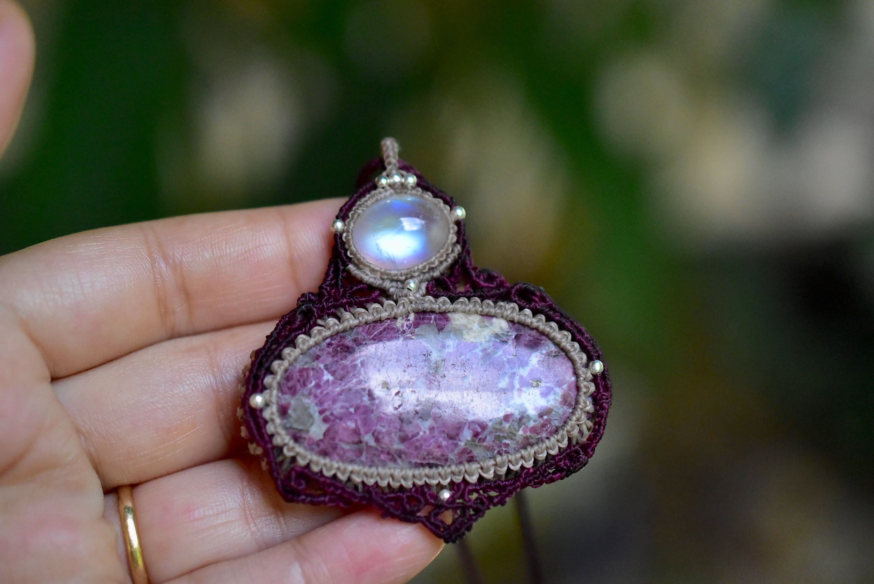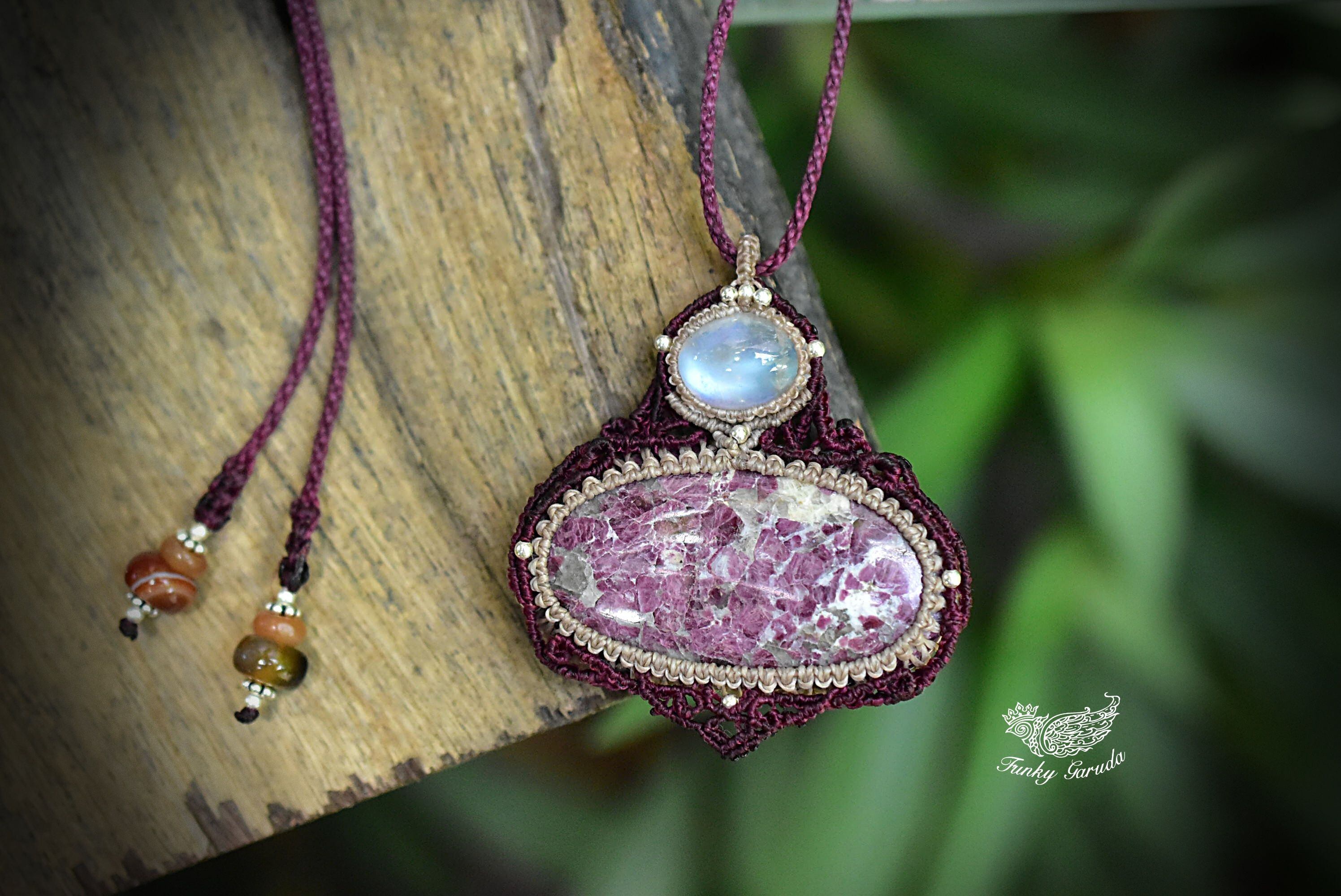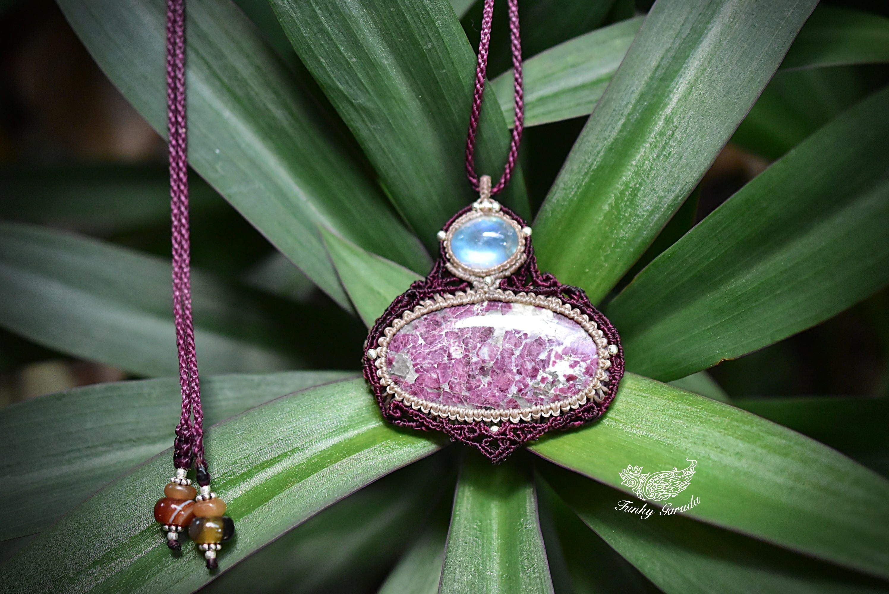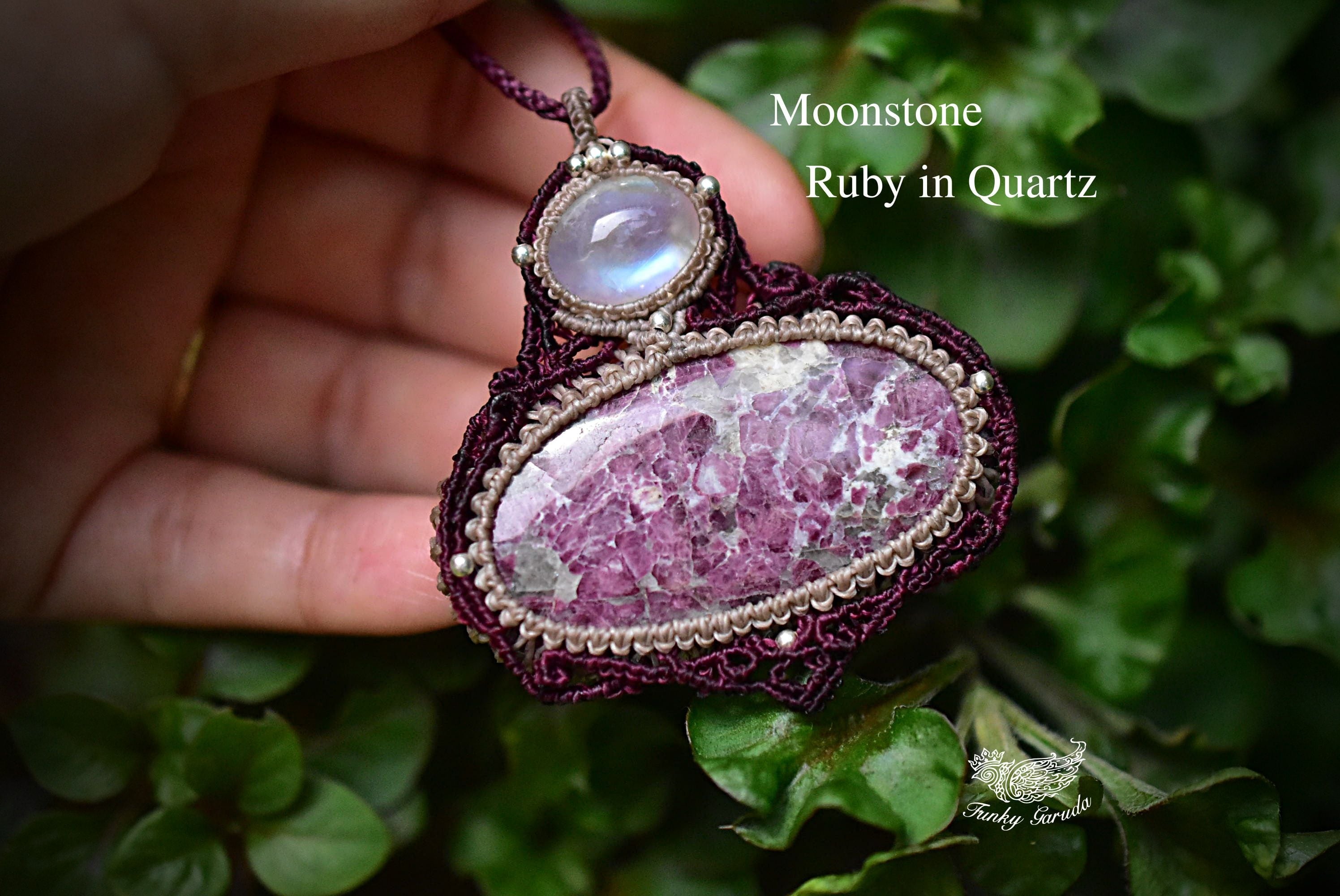 虹との重なり★ルビーインクォーツ ムーンストーン マクラメペンダント ruby030