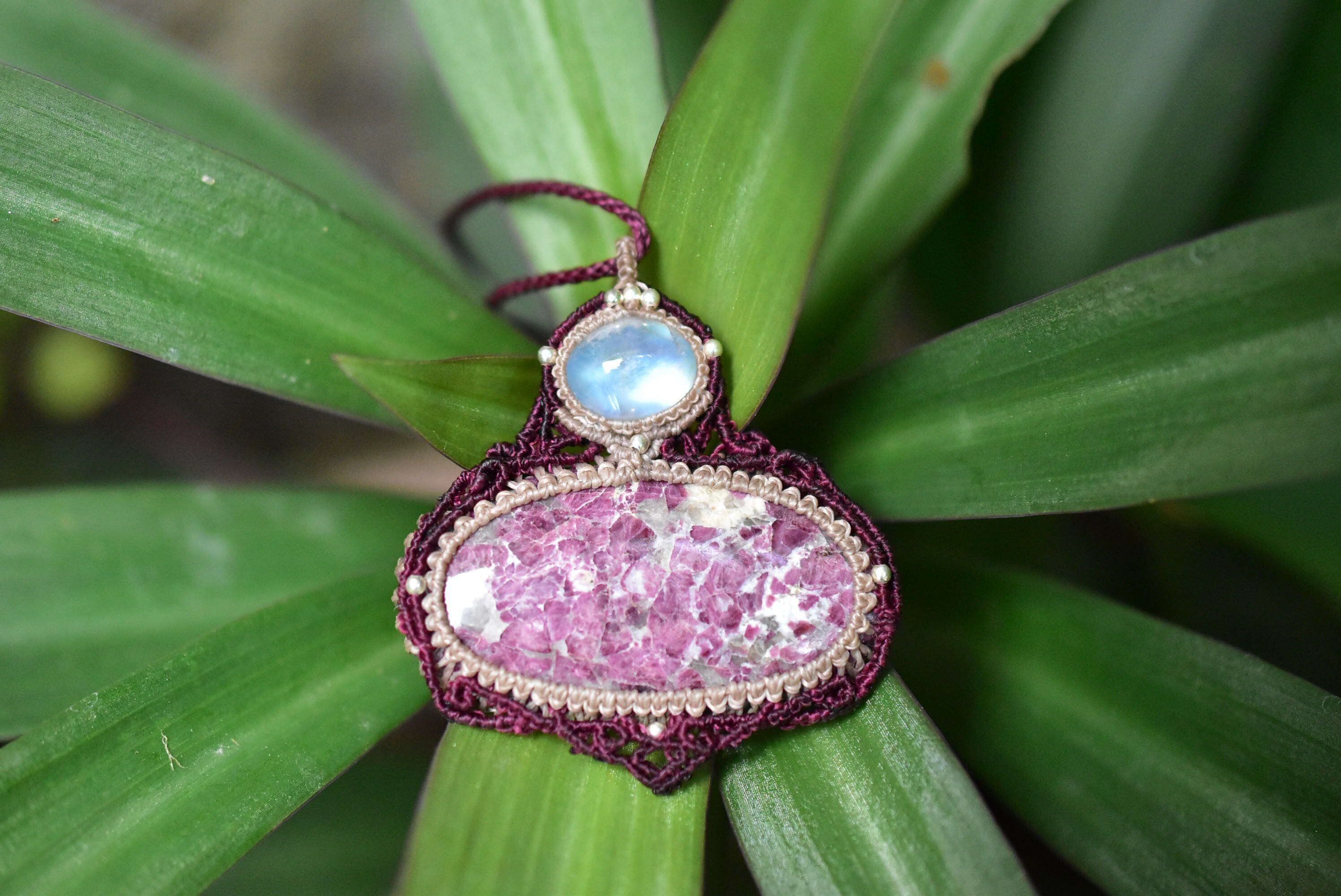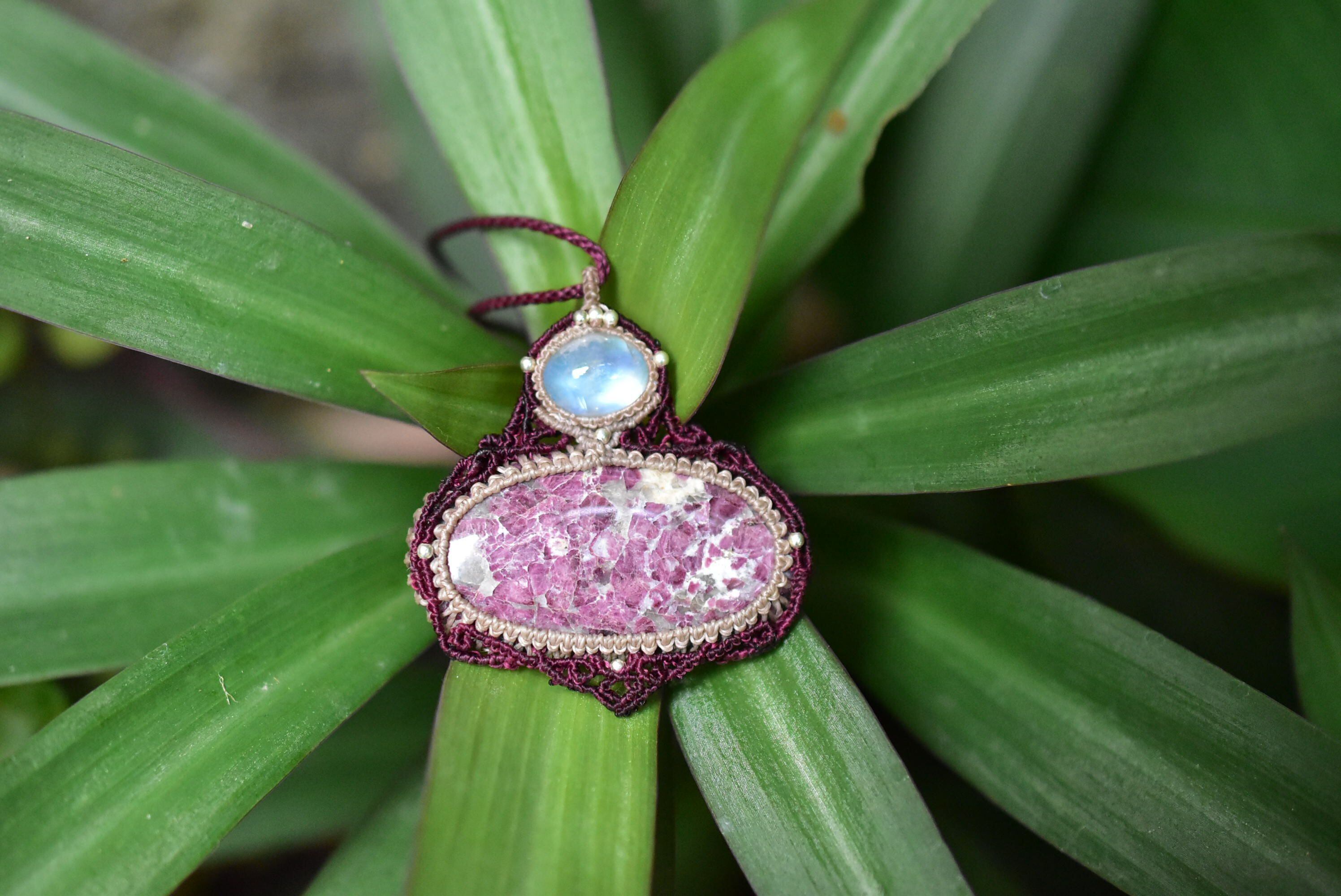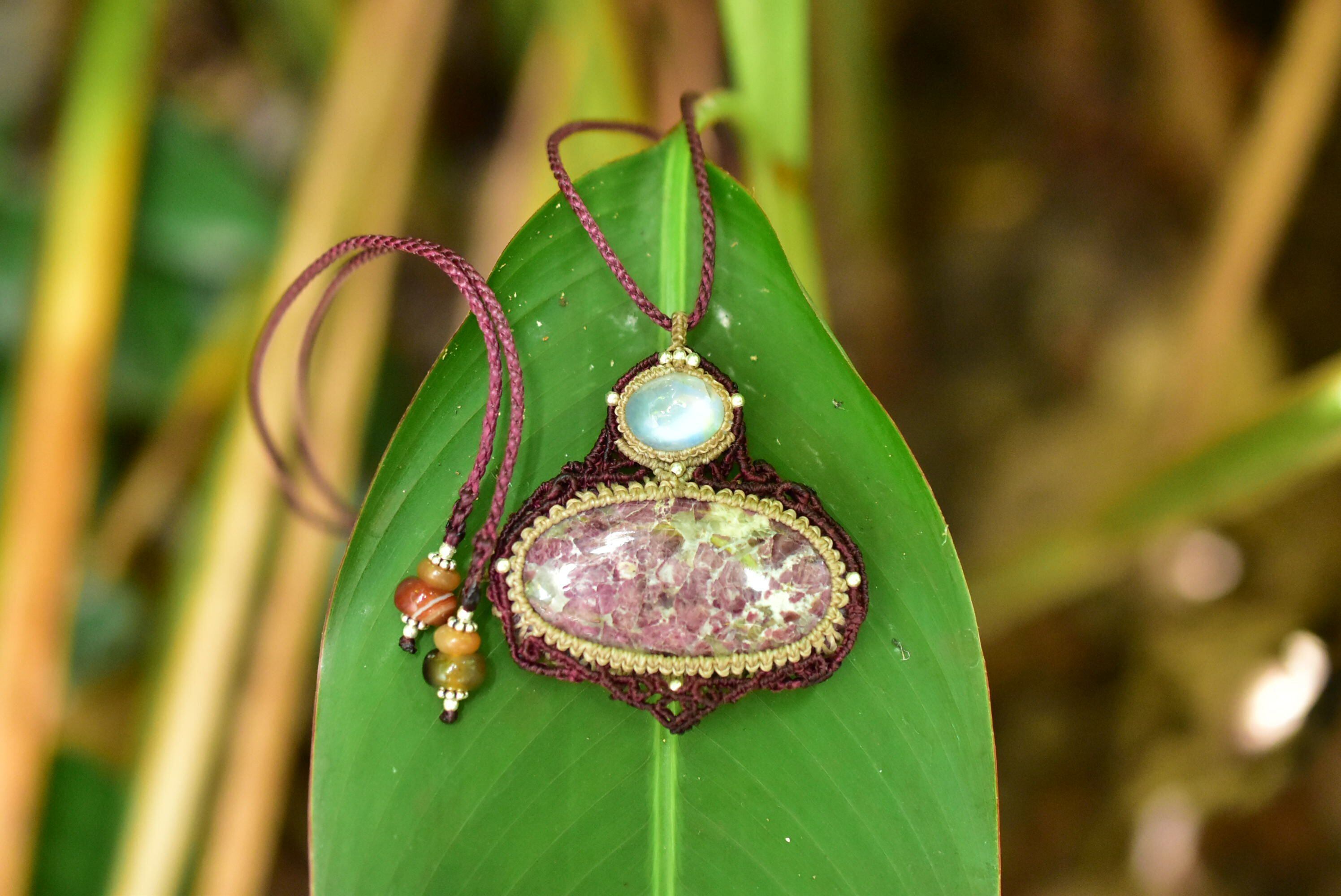 虹との重なり★ルビーインクォーツ ムーンストーン マクラメペンダント ruby030