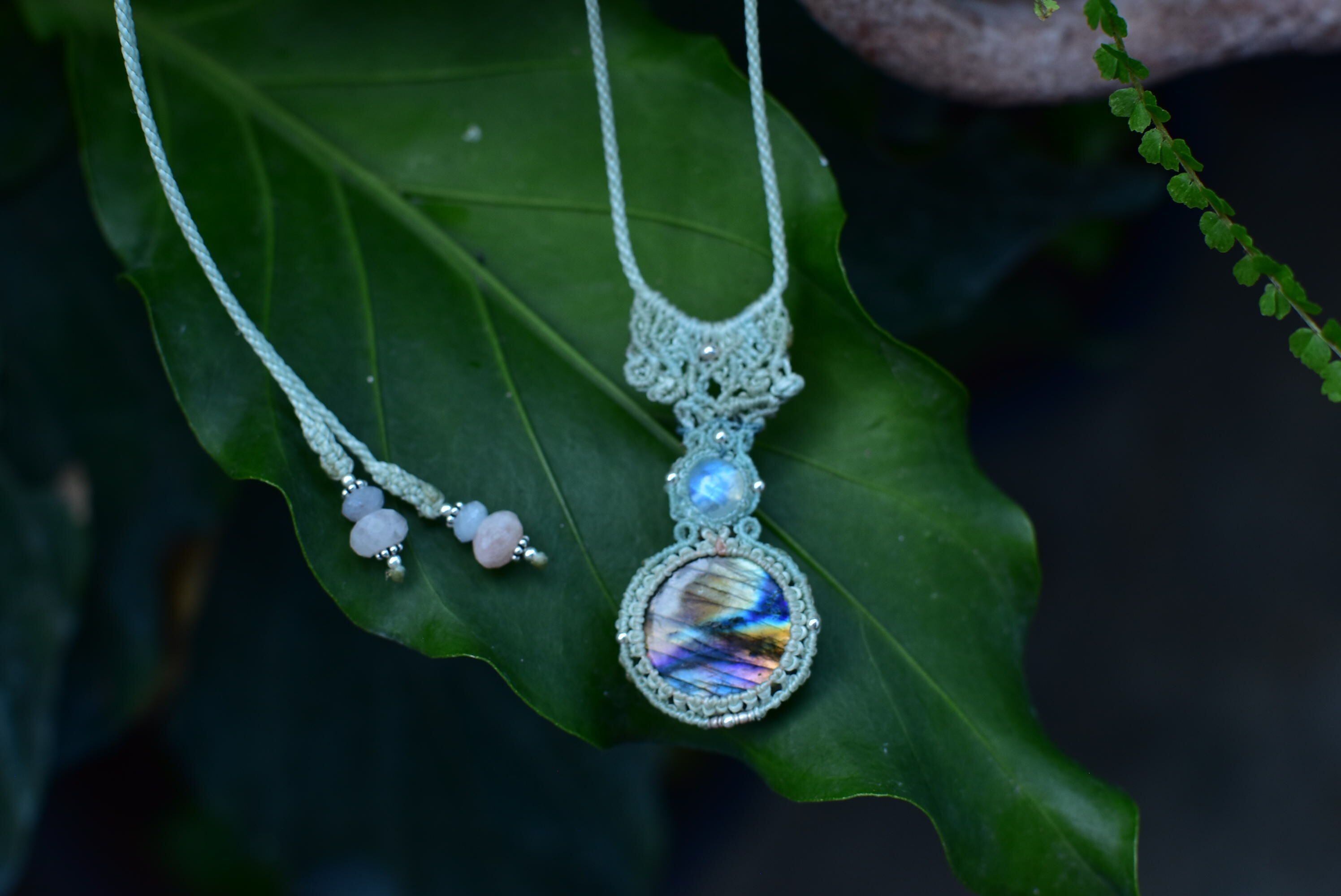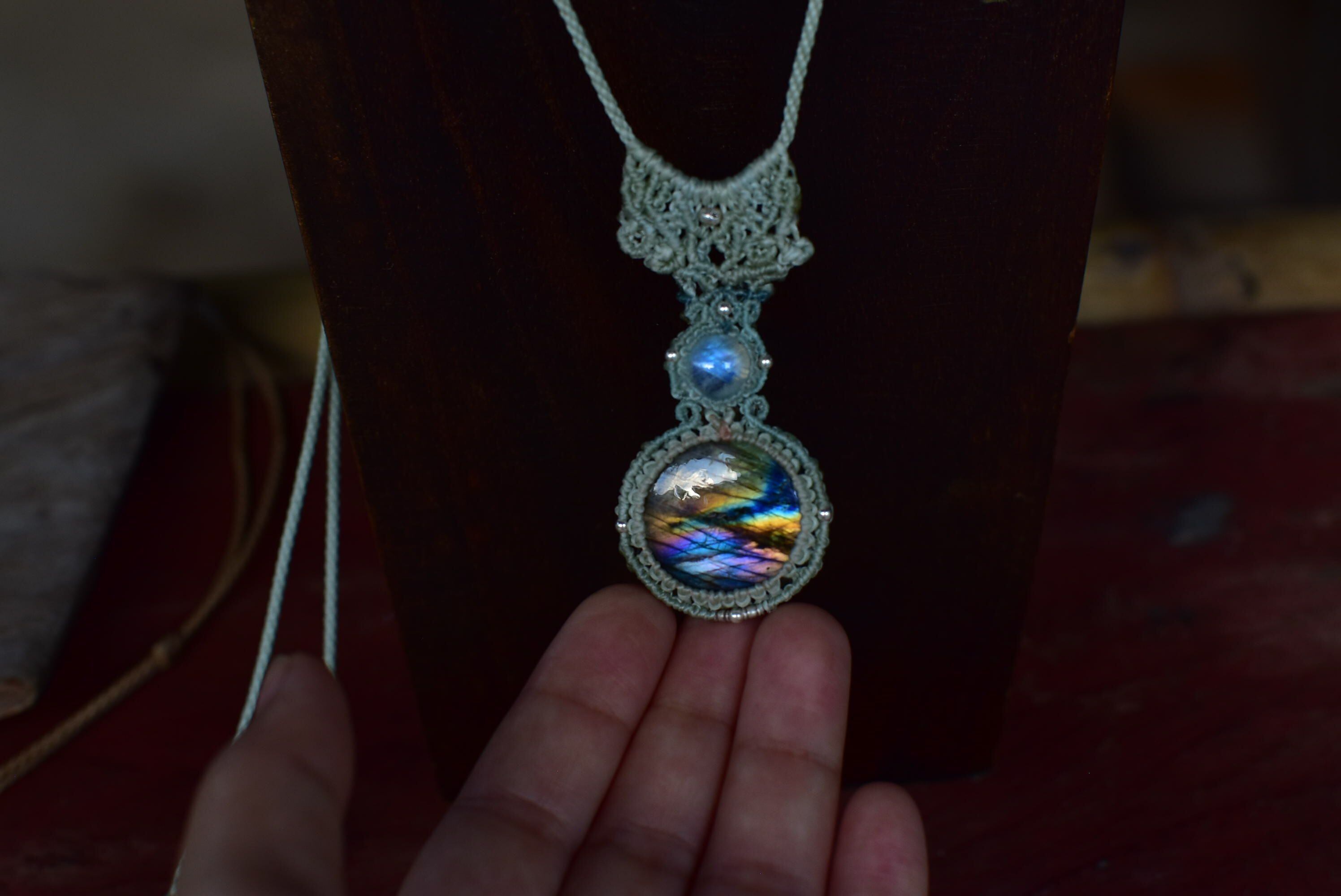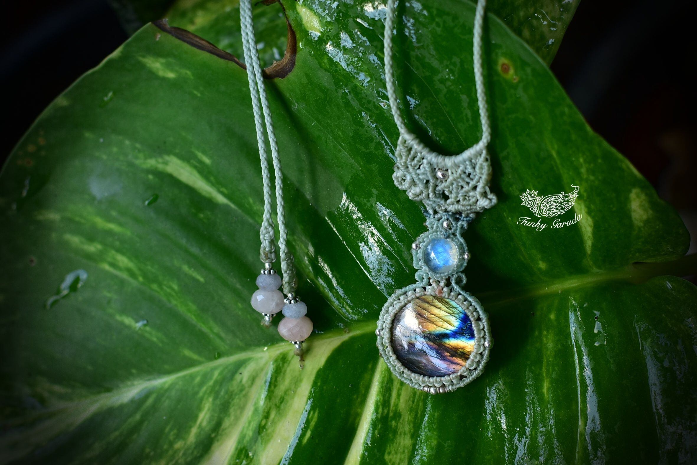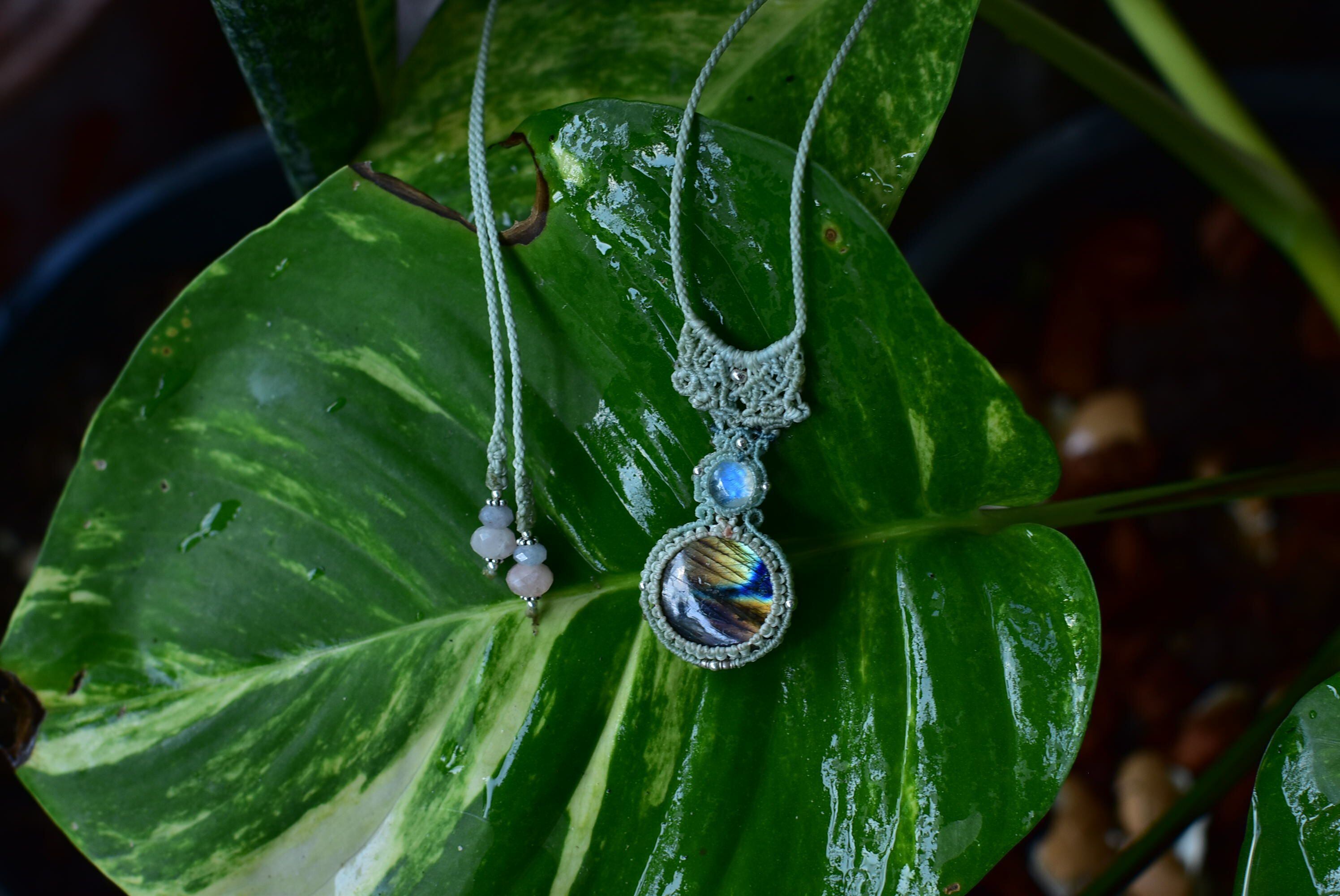 新月の紫★マルチカラー★パープルラブラドライト ムーンストーン マクラメペンダントlabb029
