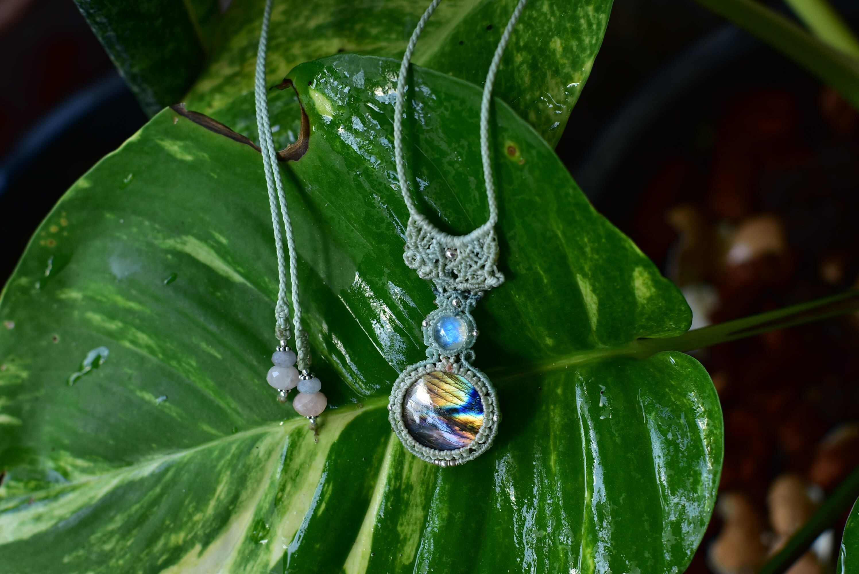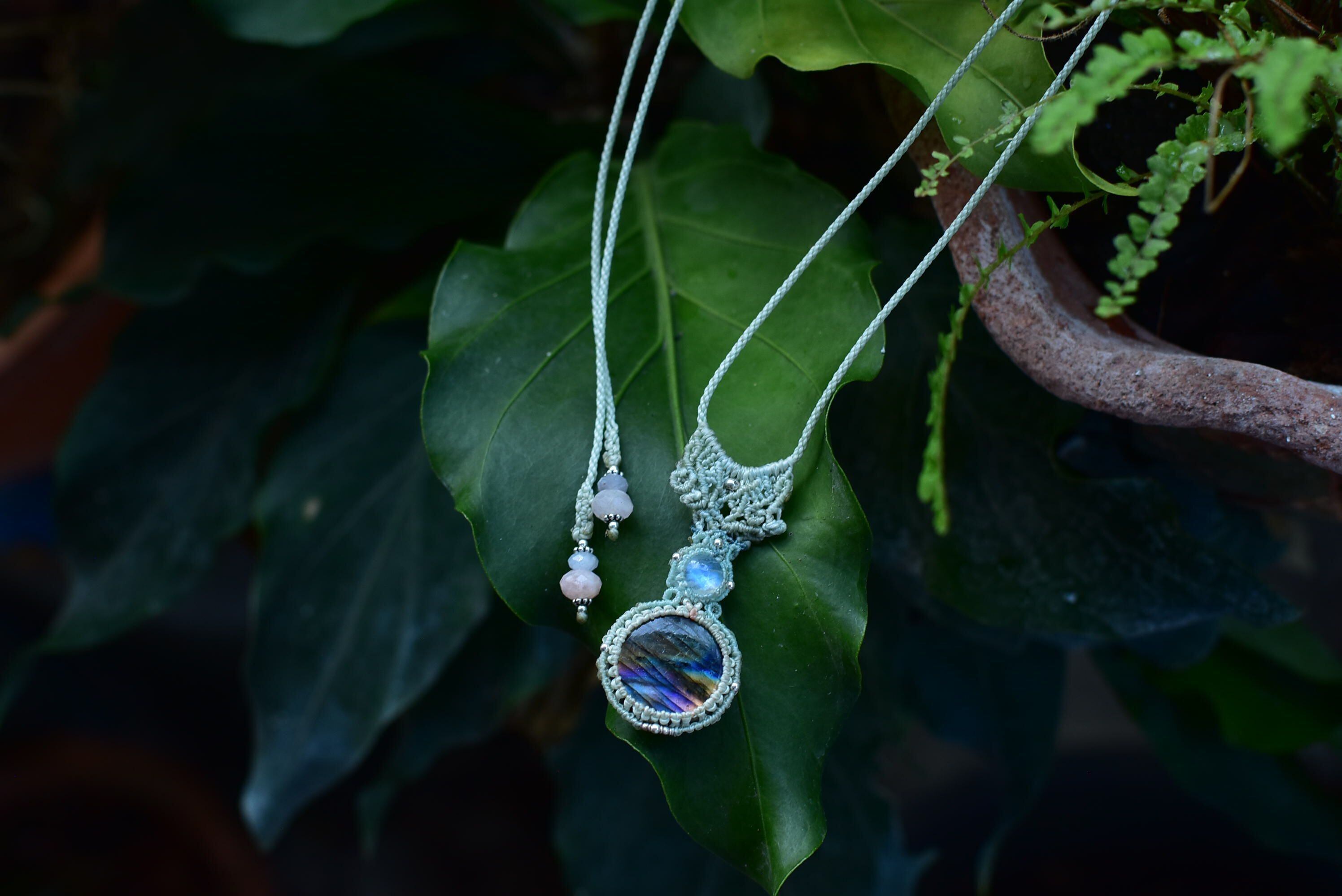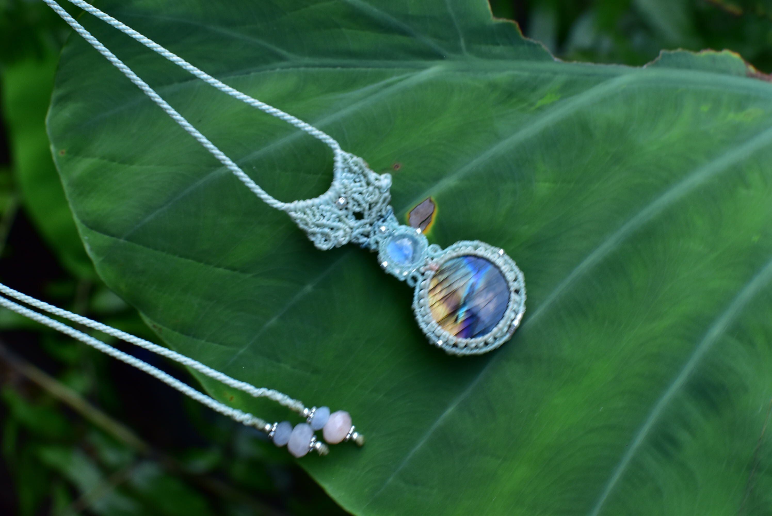 新月の紫★マルチカラー★パープルラブラドライト ムーンストーン マクラメペンダントlabb029