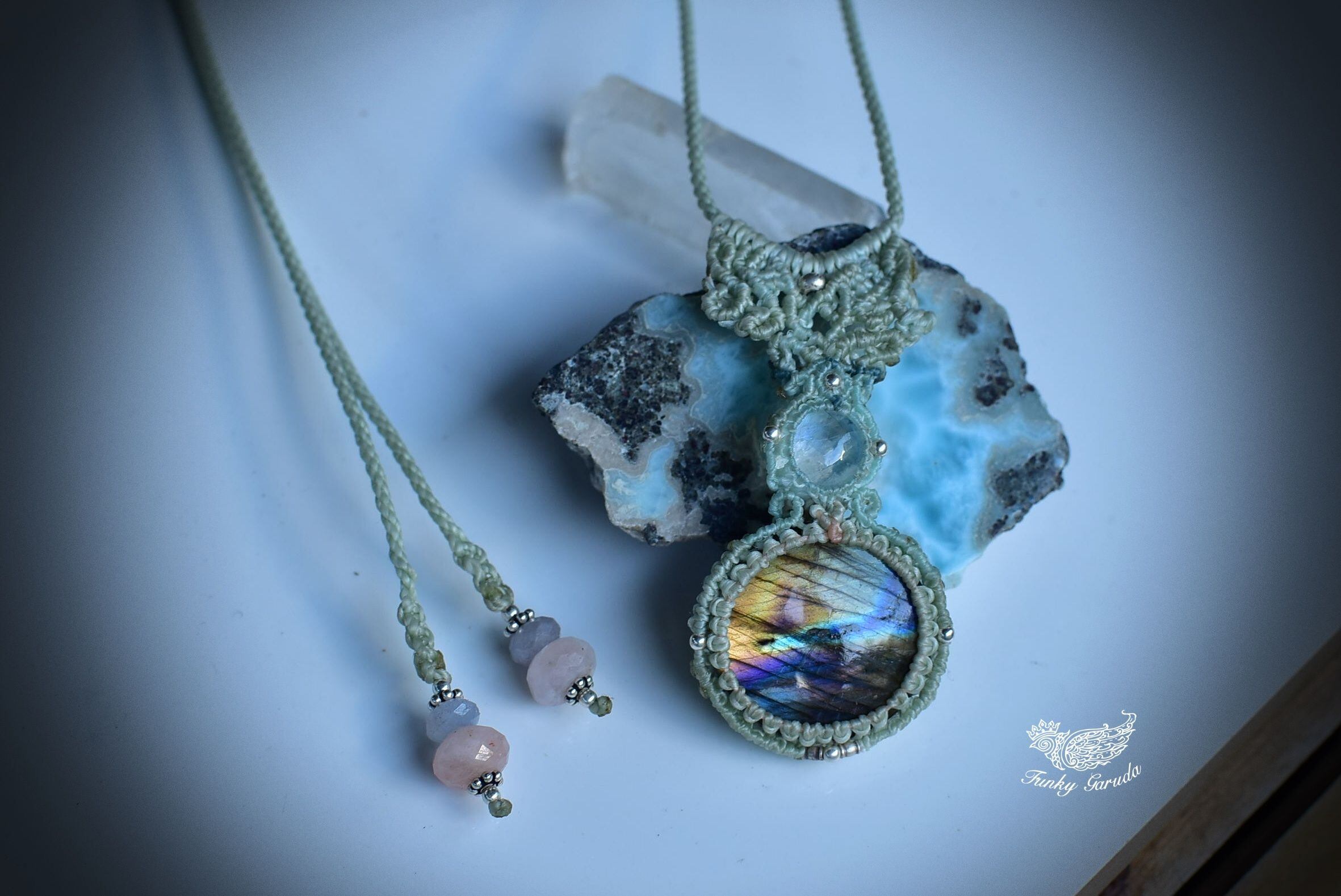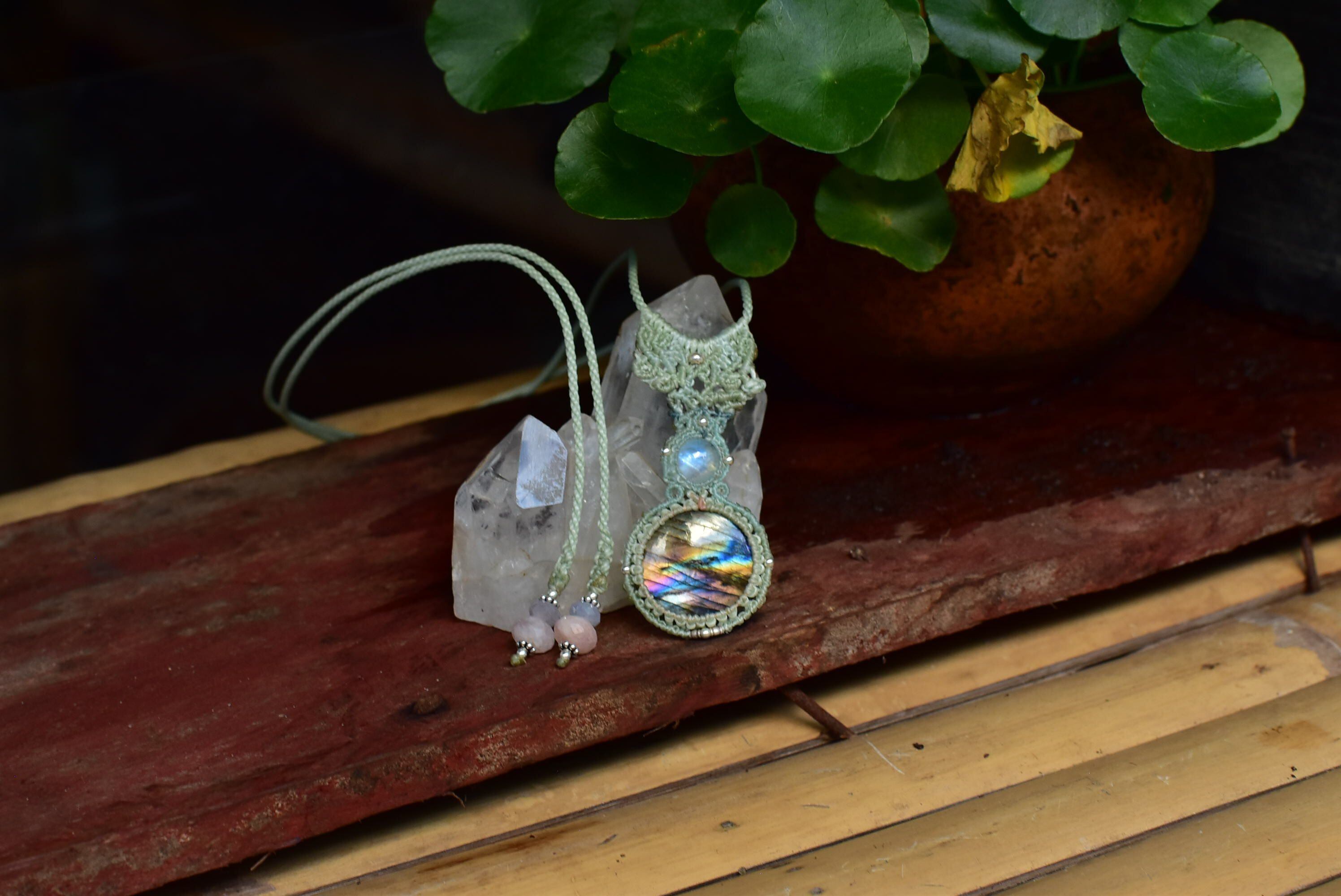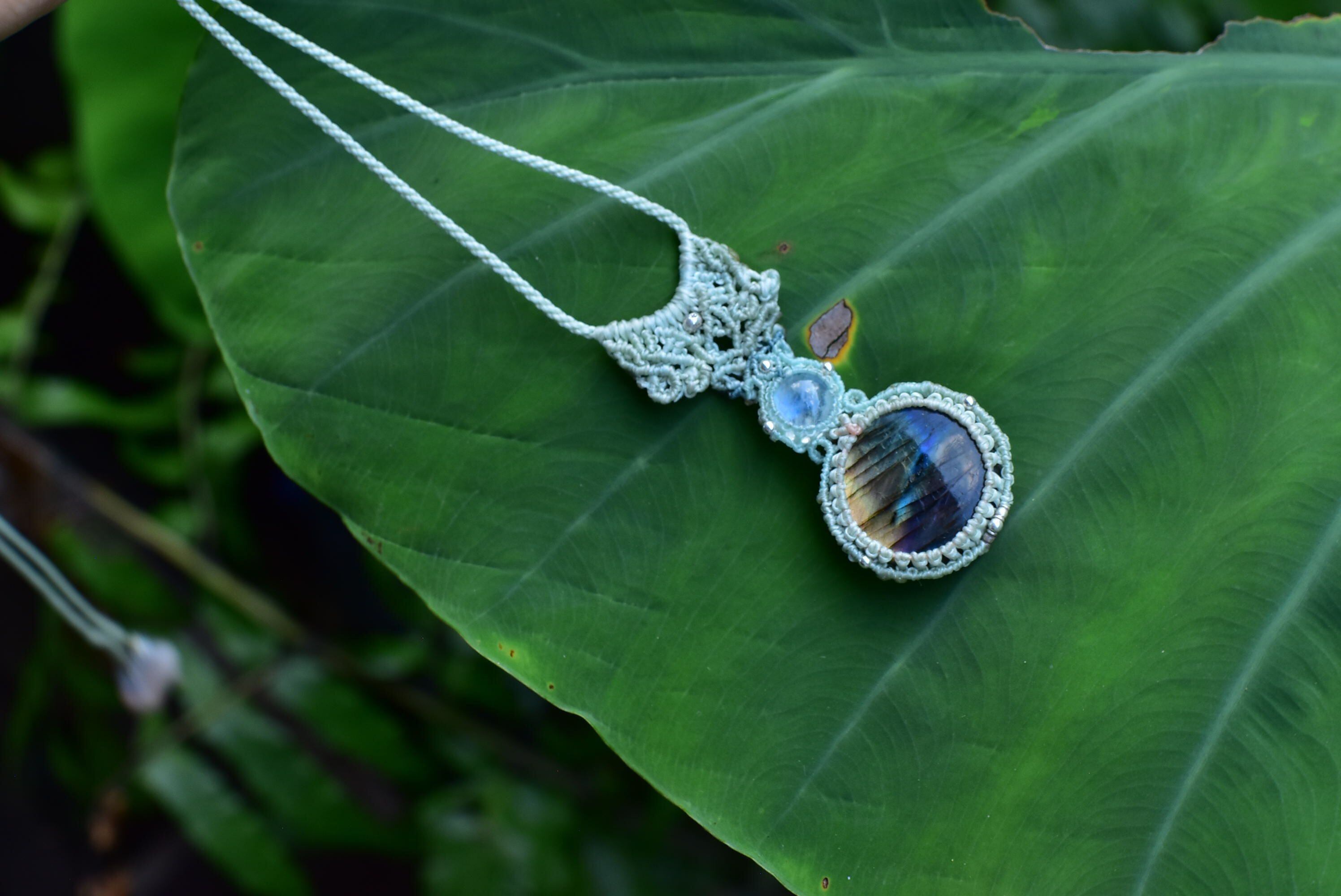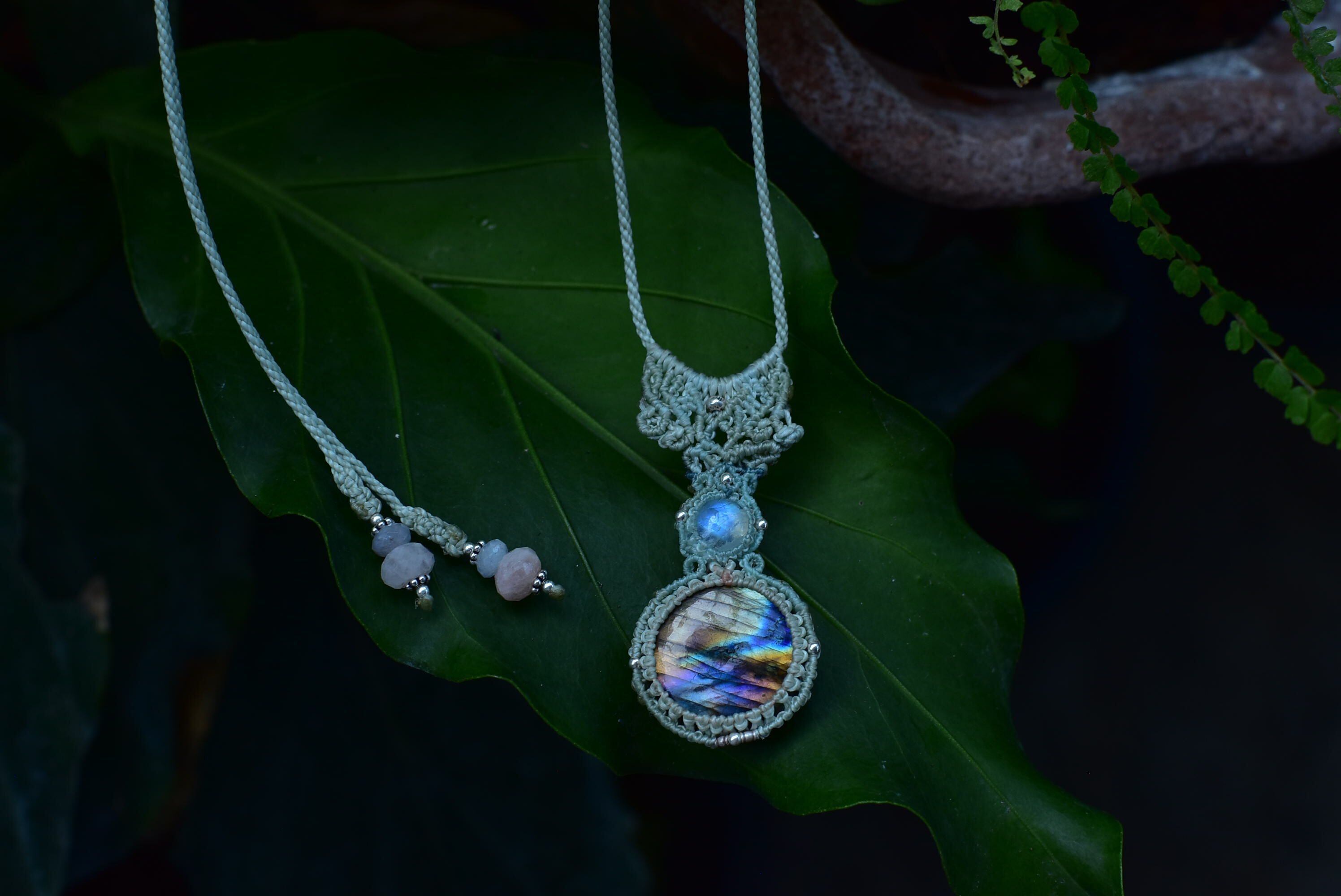 新月の紫★マルチカラー★パープルラブラドライト ムーンストーン マクラメペンダントlabb029
