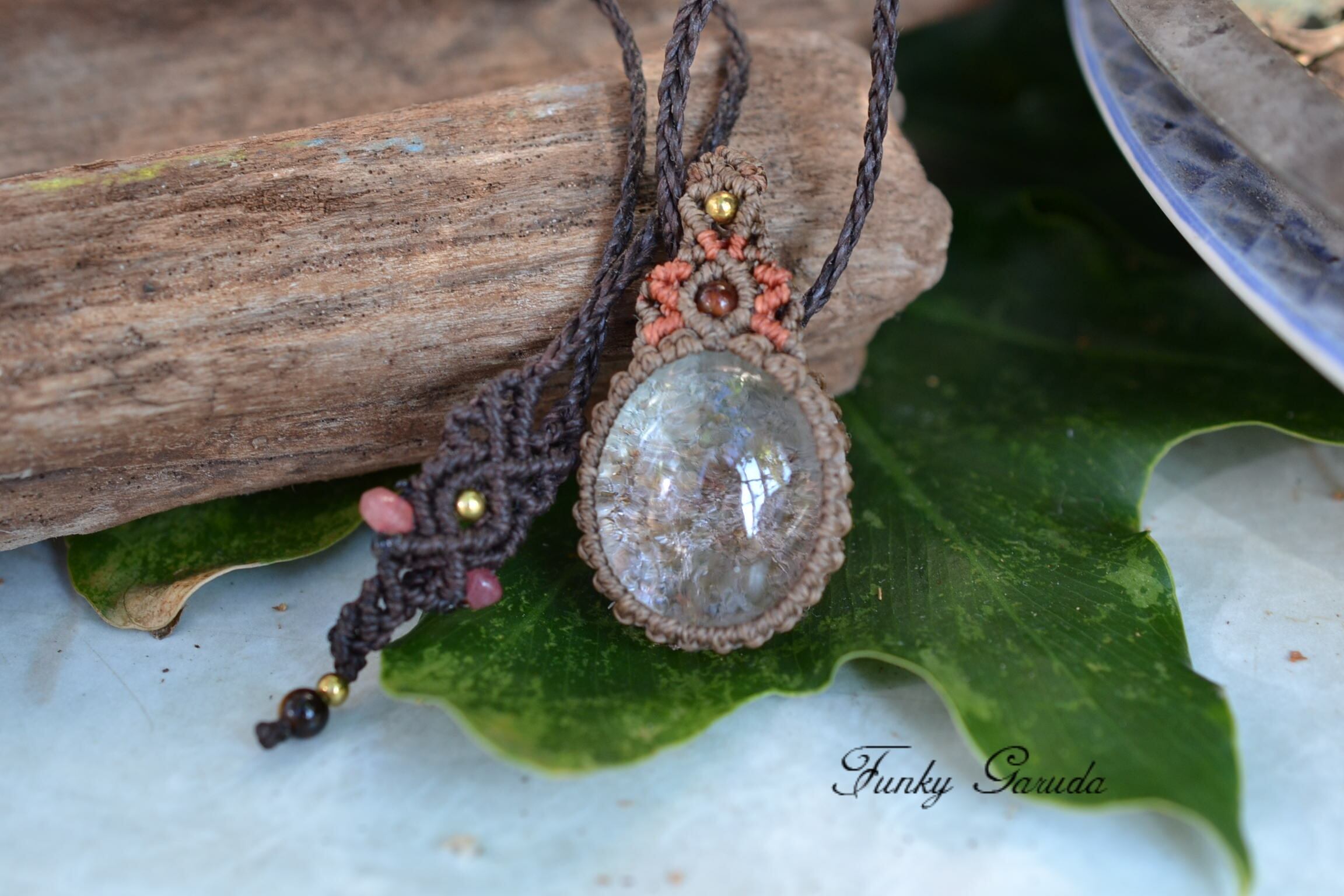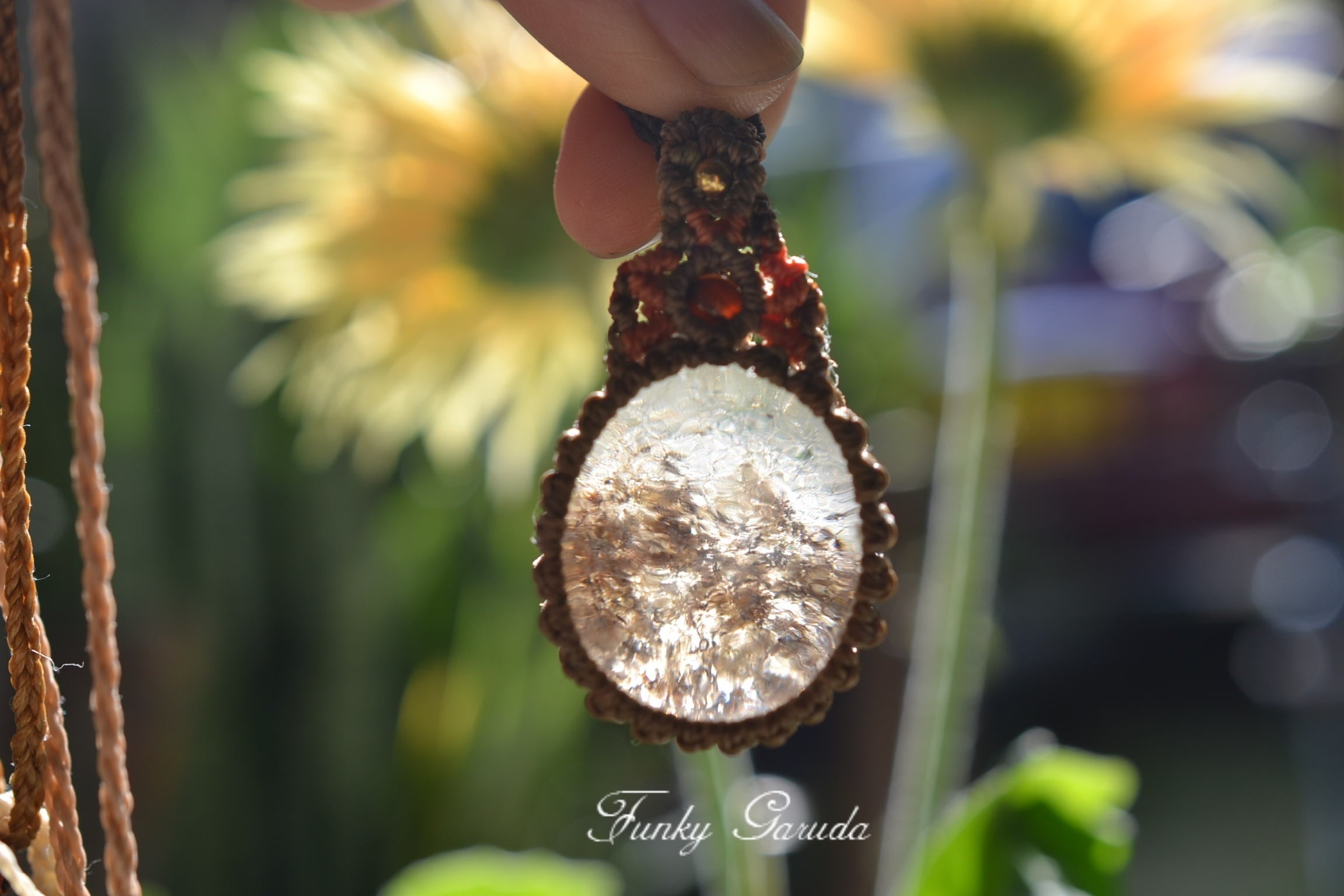 ウルウルとした地球の涙の一部のようなガーデン水晶をペンダントにマクラメ編み装飾して制作しました。