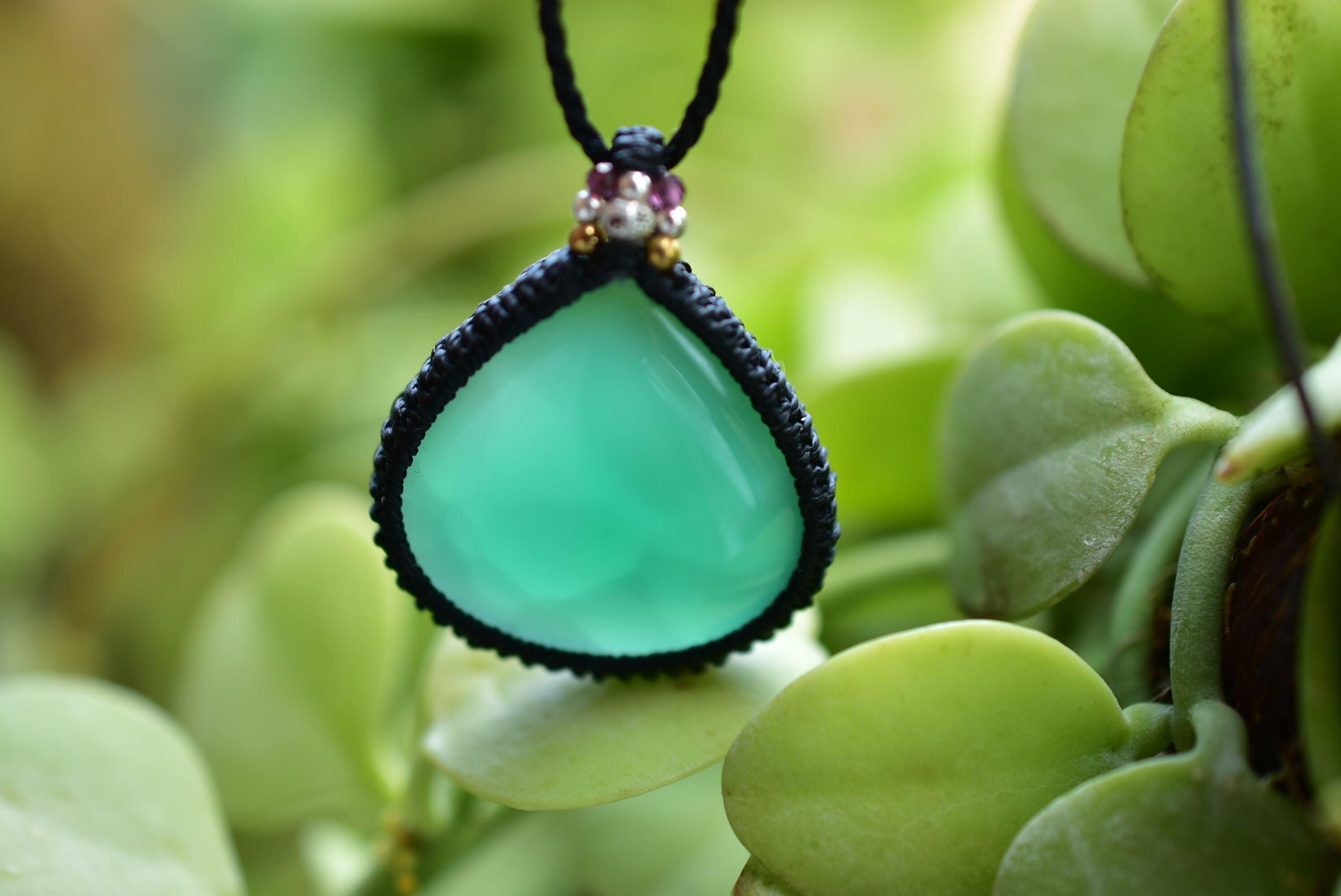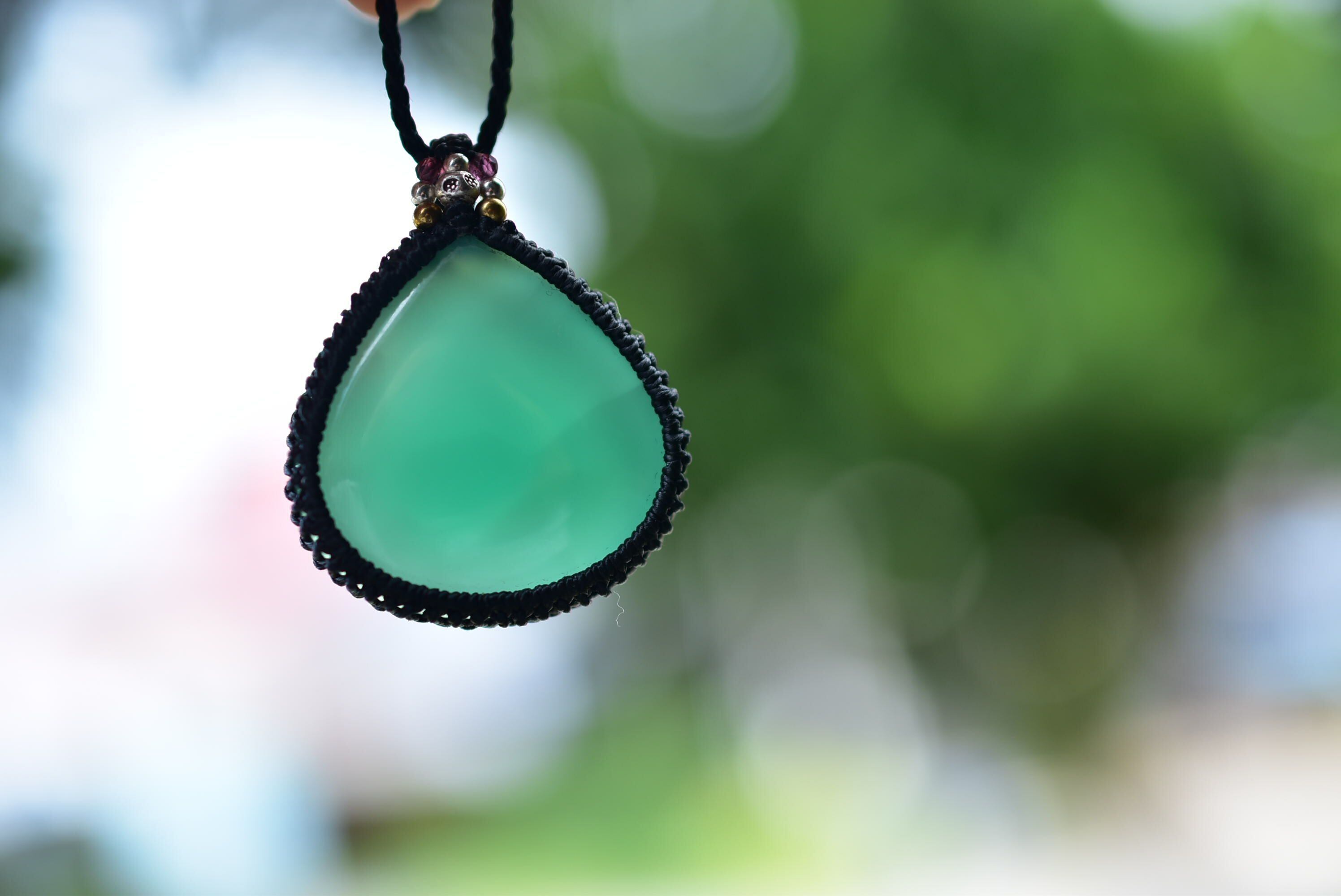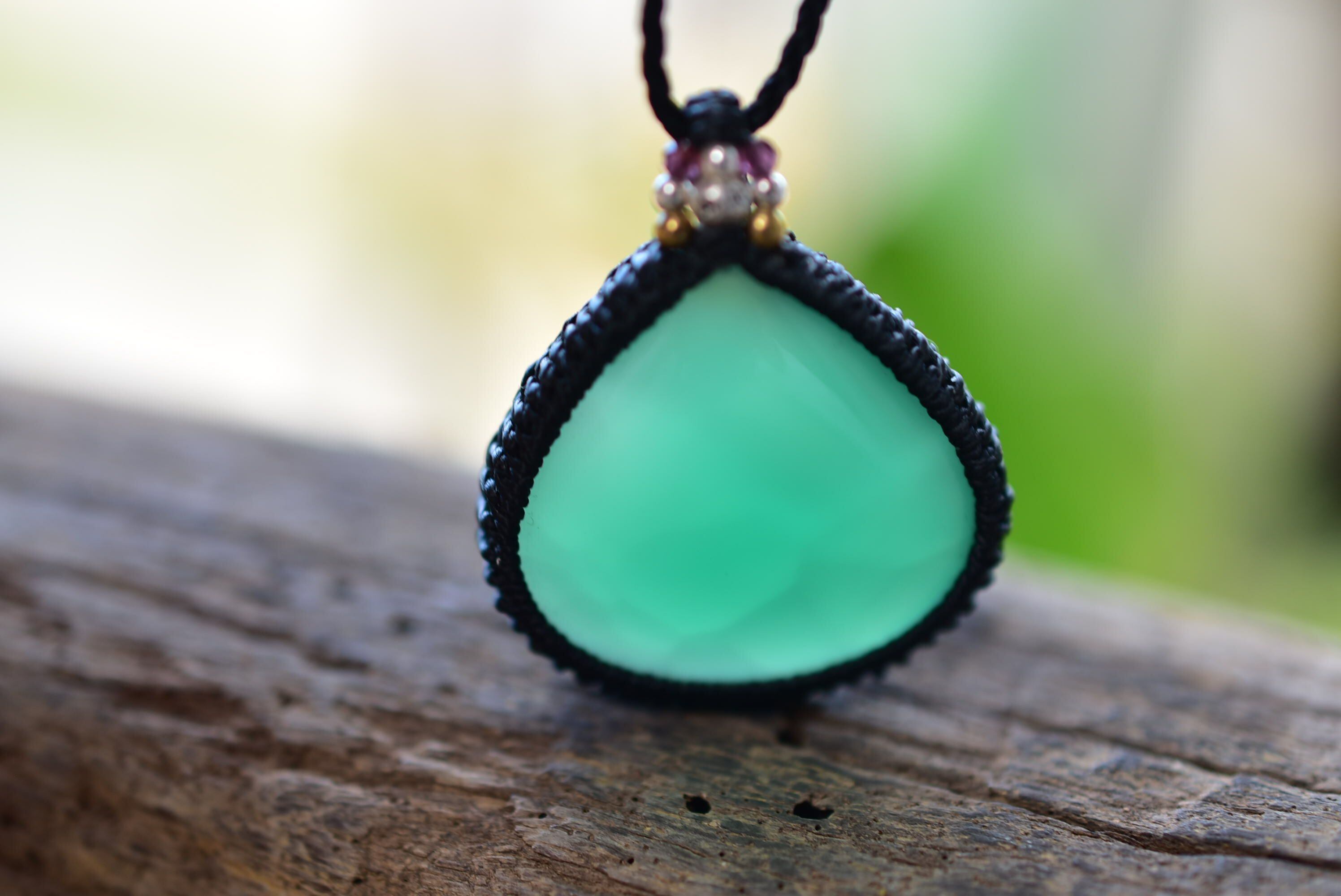 豊かな表情を魅せてくれるグリーンアゲートを、シンプルなマクラメペンダントに仕上げました。