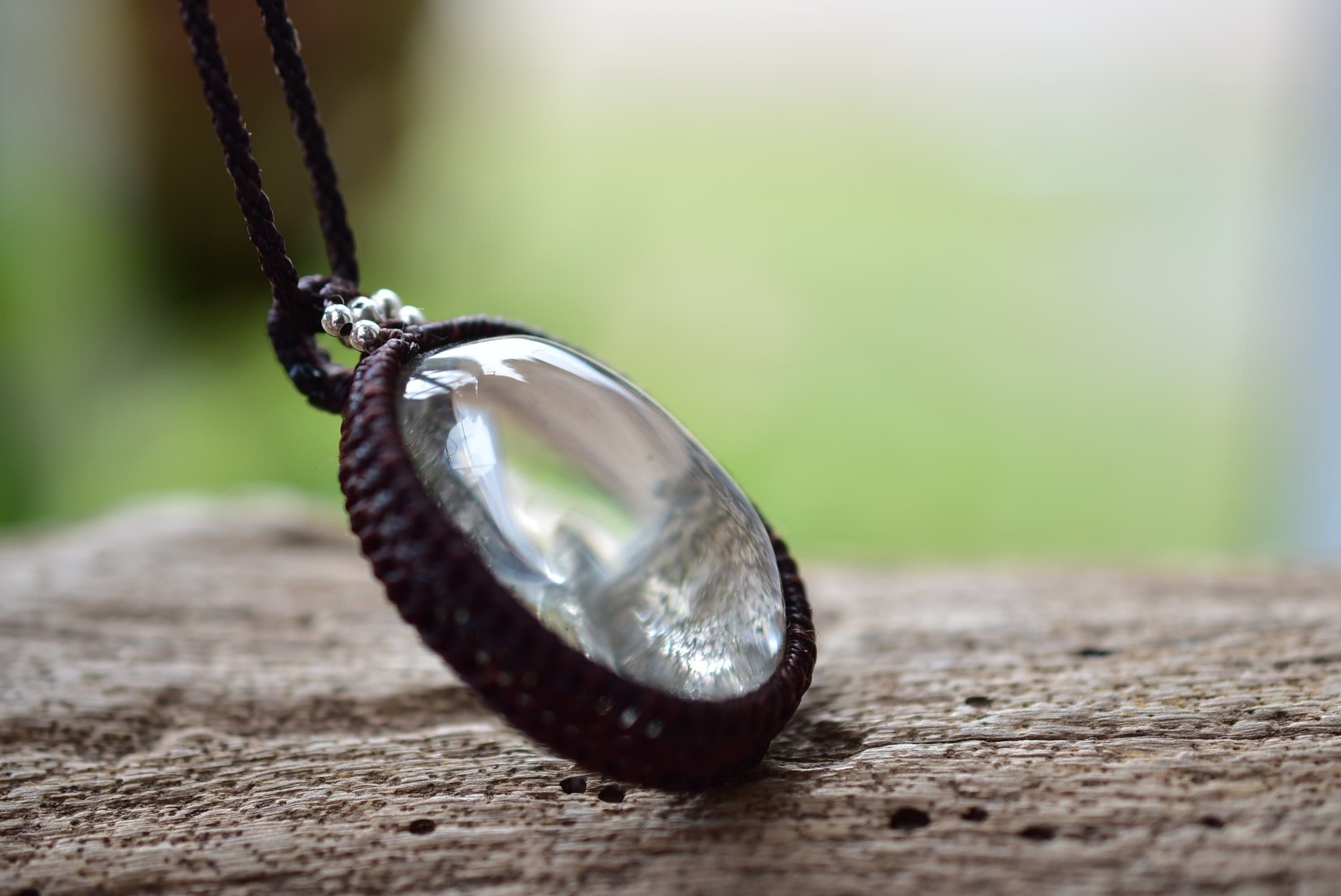 ◆このたびはダークブラウン色の蝋引き糸を使用しマクラメ編み装飾を施しました。