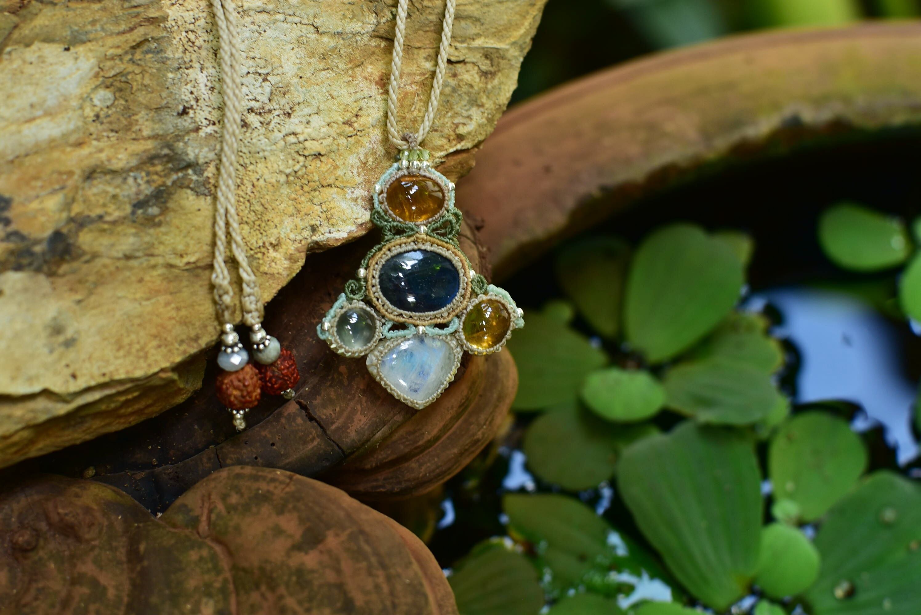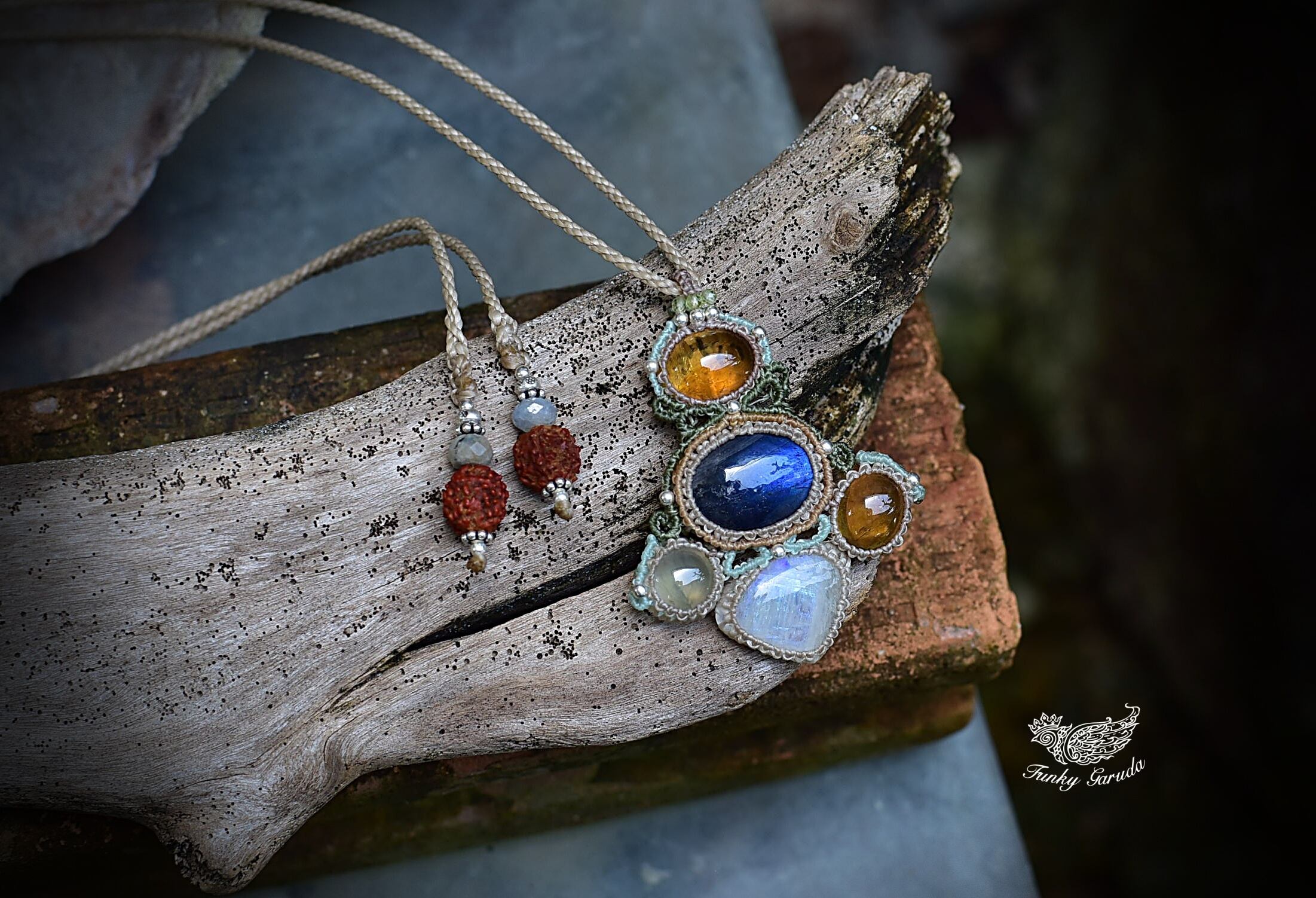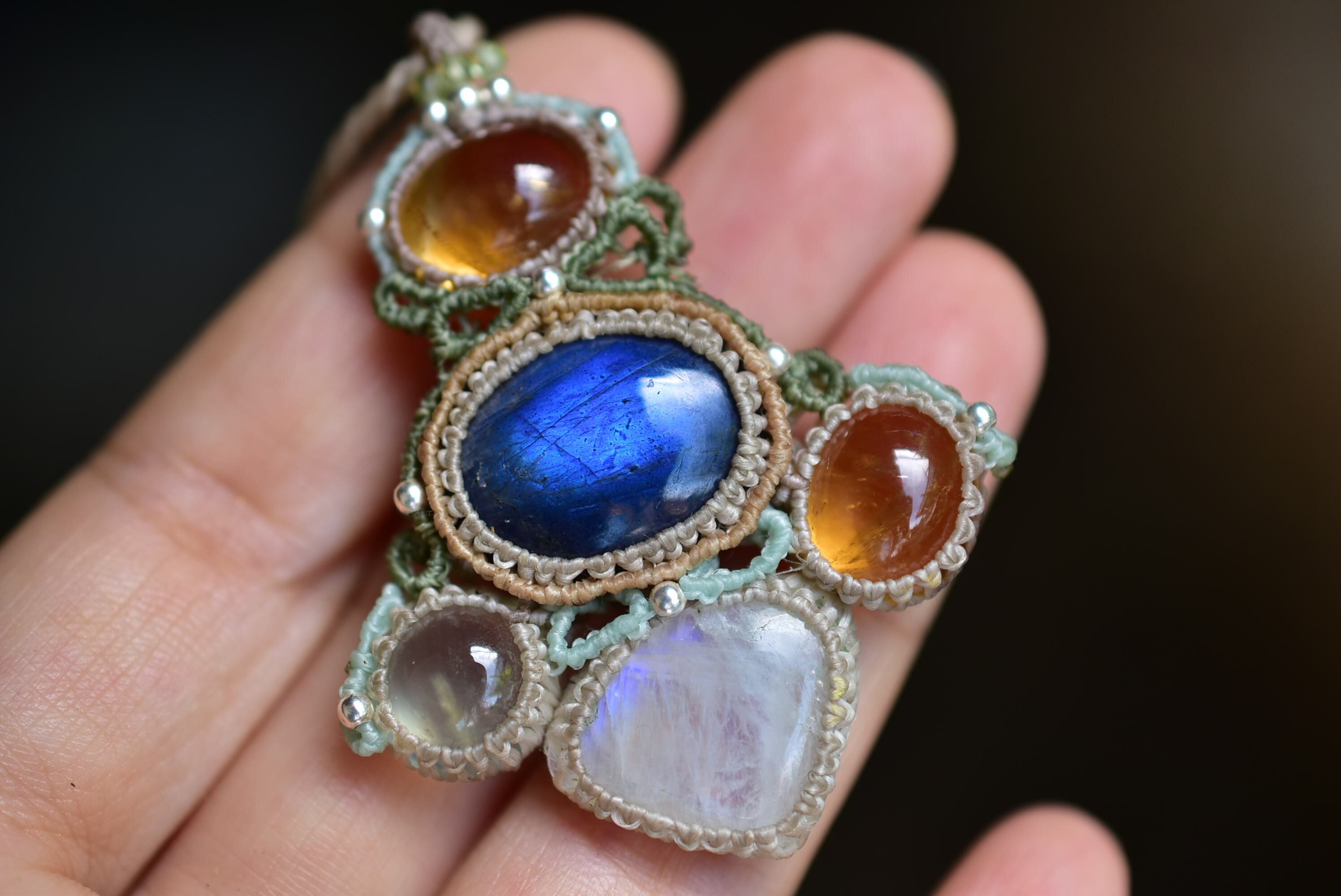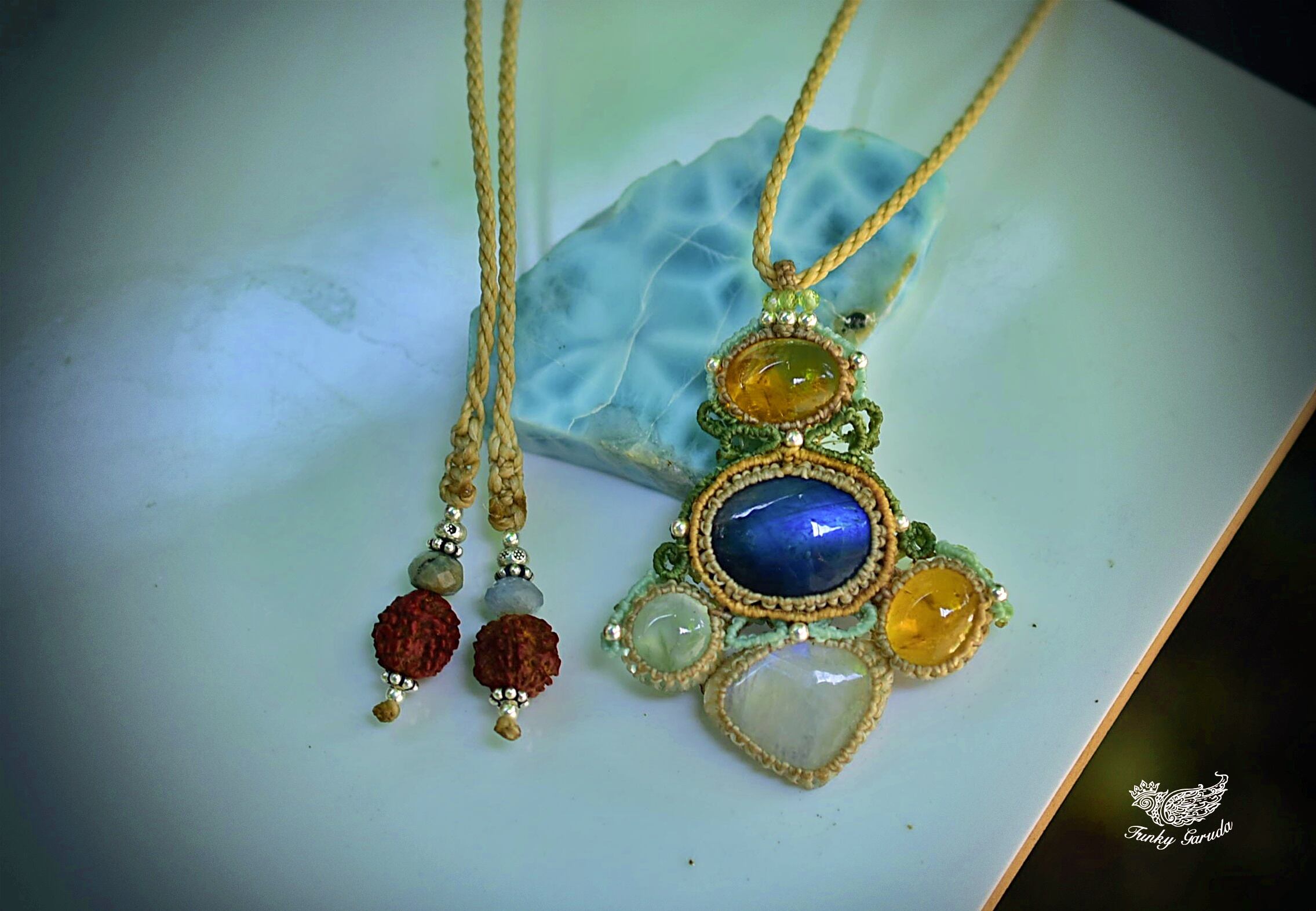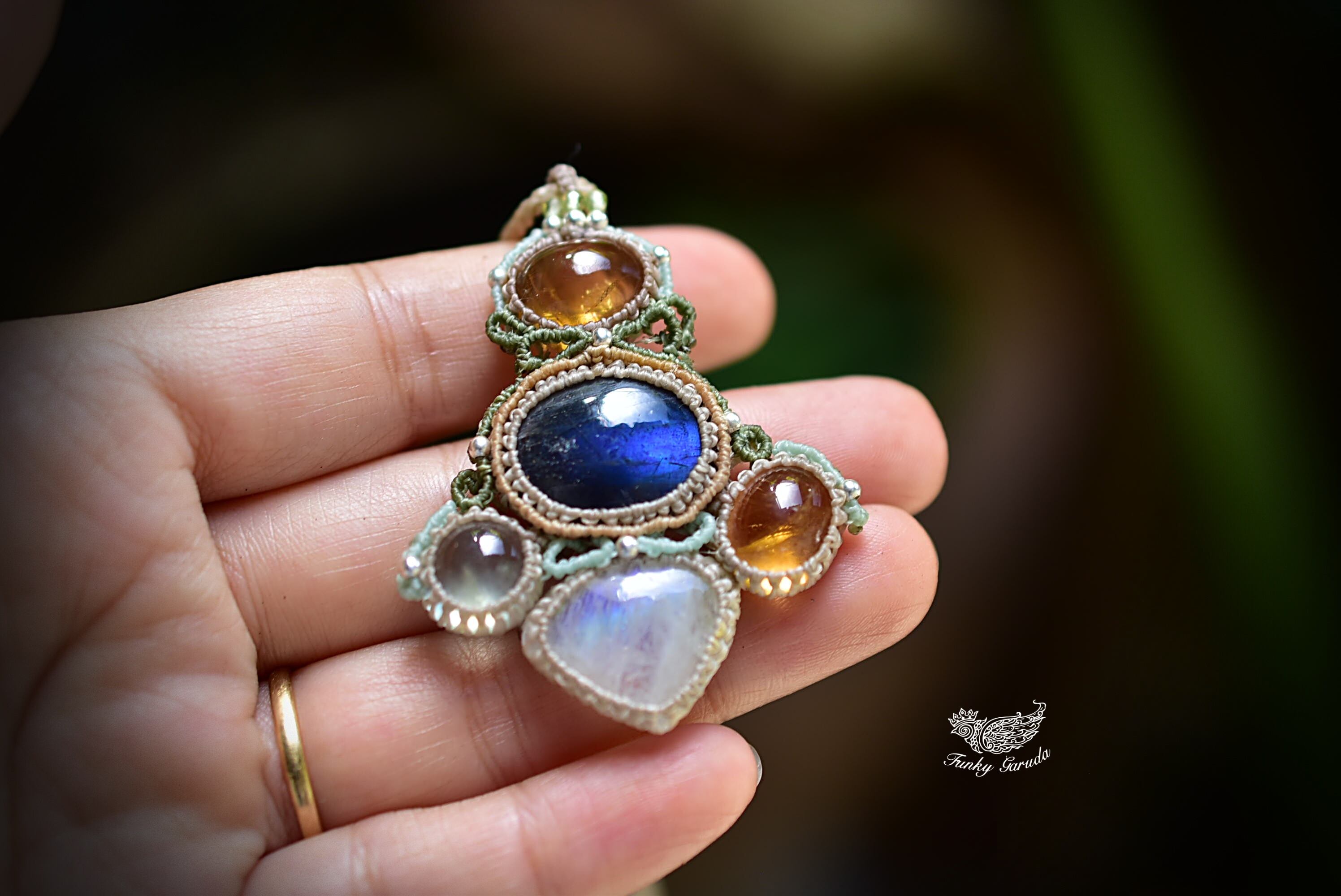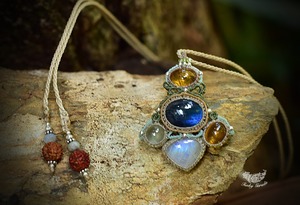 宇宙と地球★ラブラドライト シトリン プレナイト マクラメペンダントlabb030