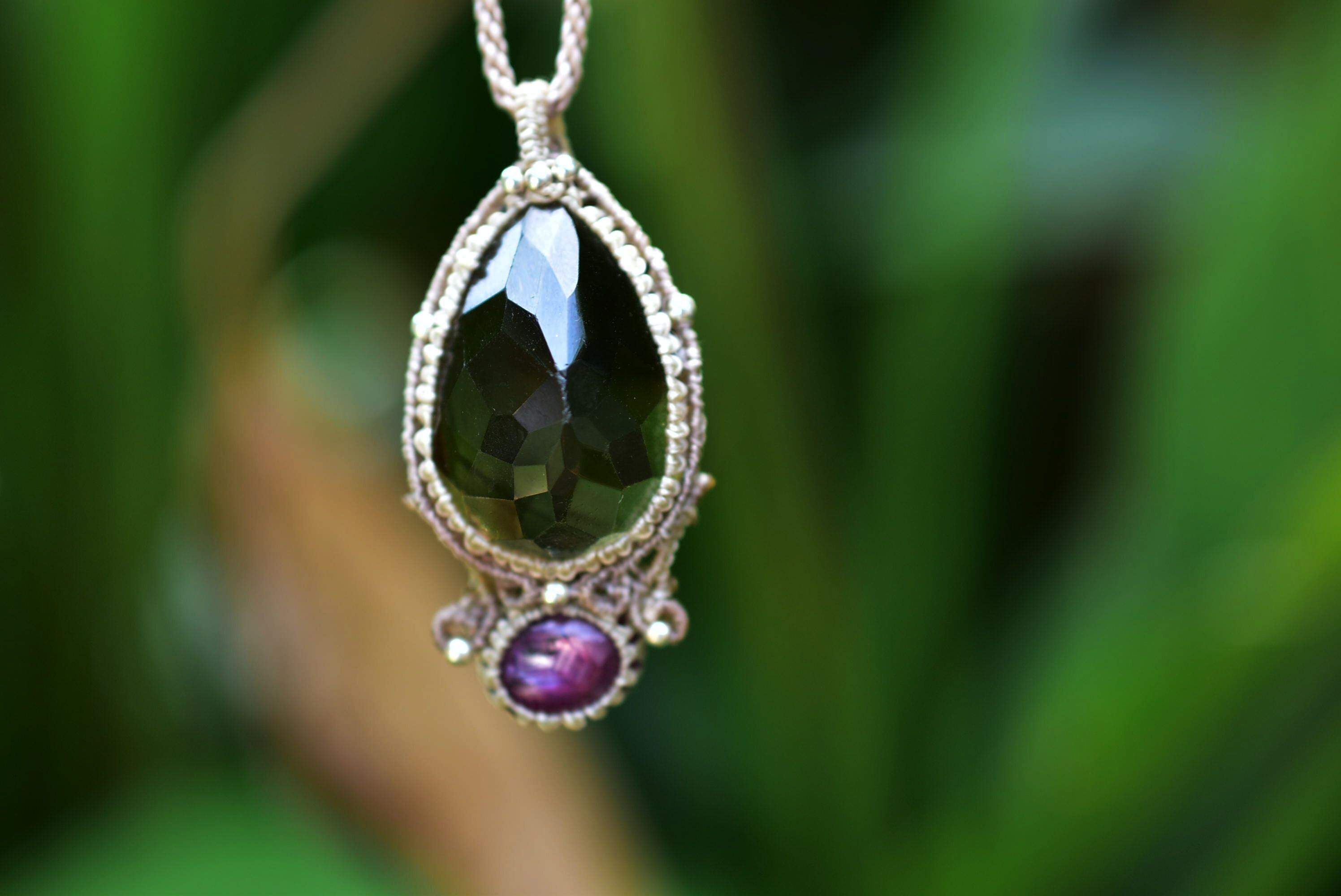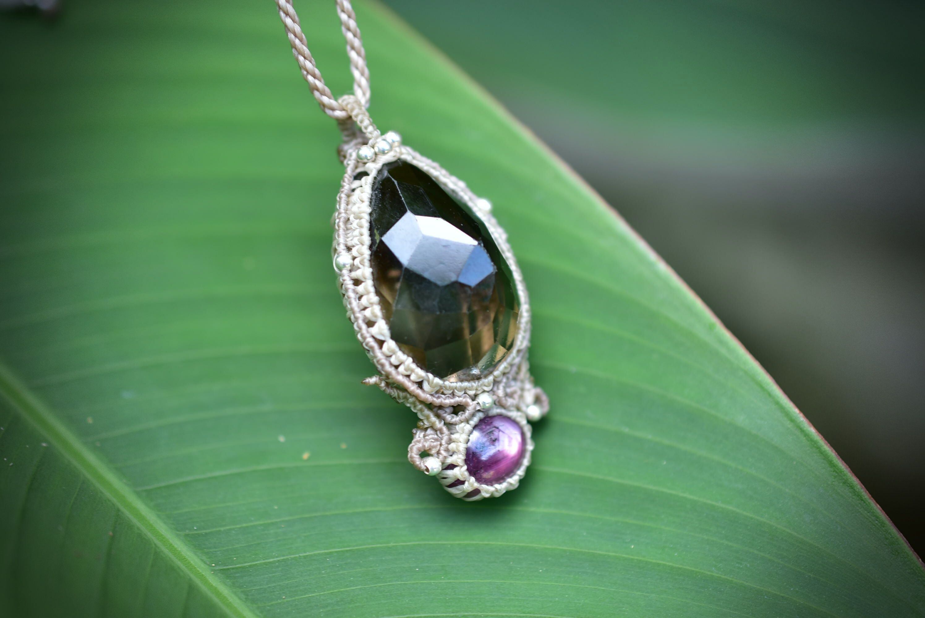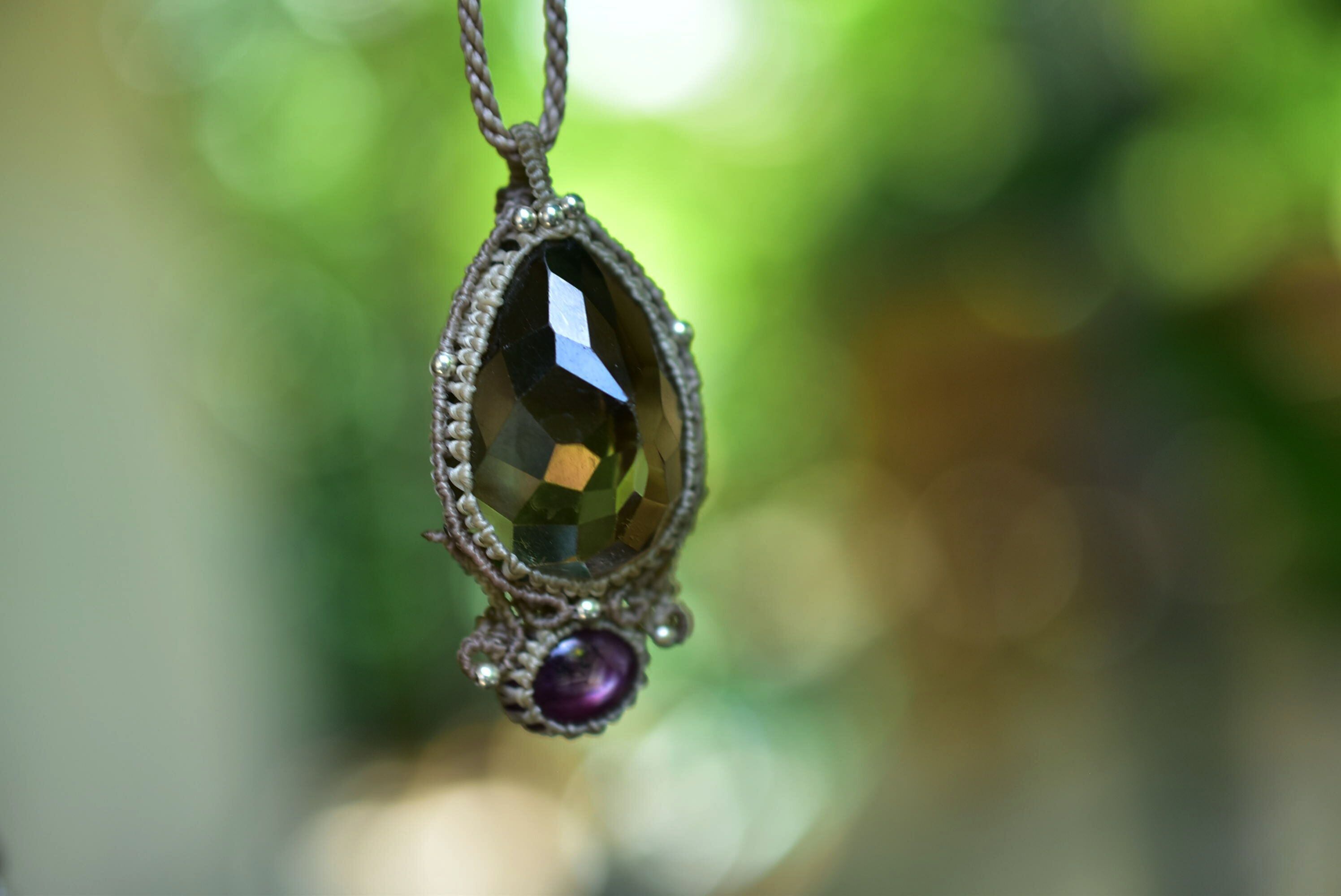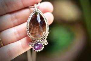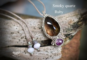ファセットカット スモーキークォーツ ルビー マクラメペンダントsmo005