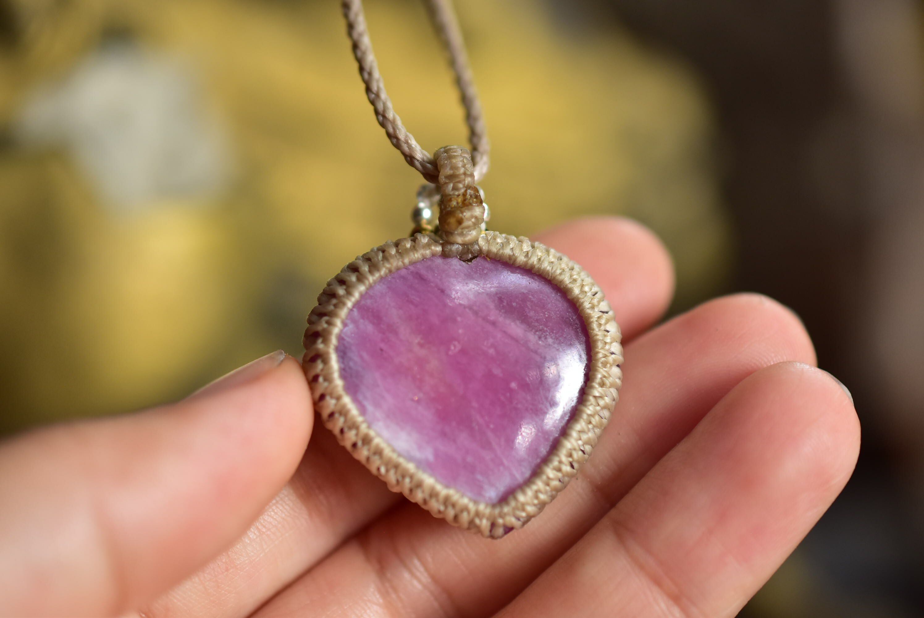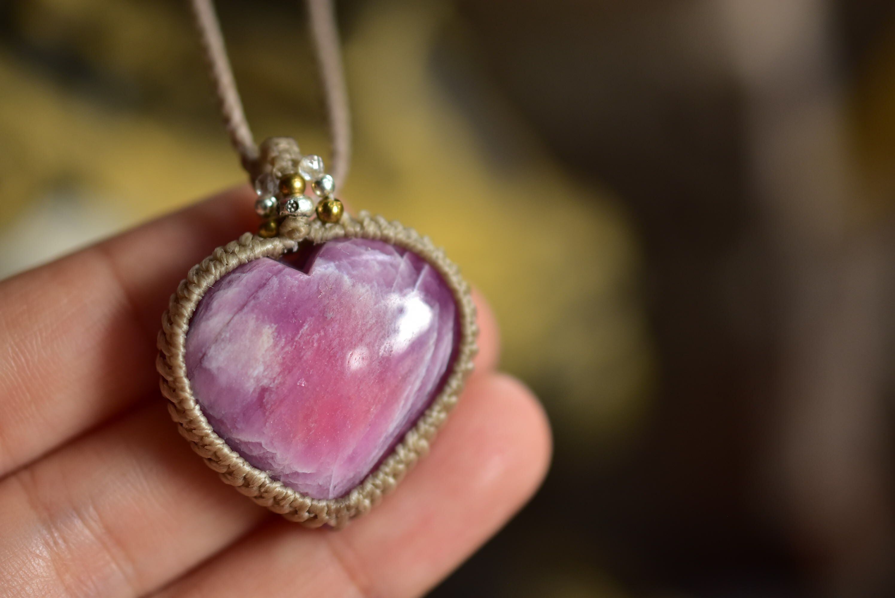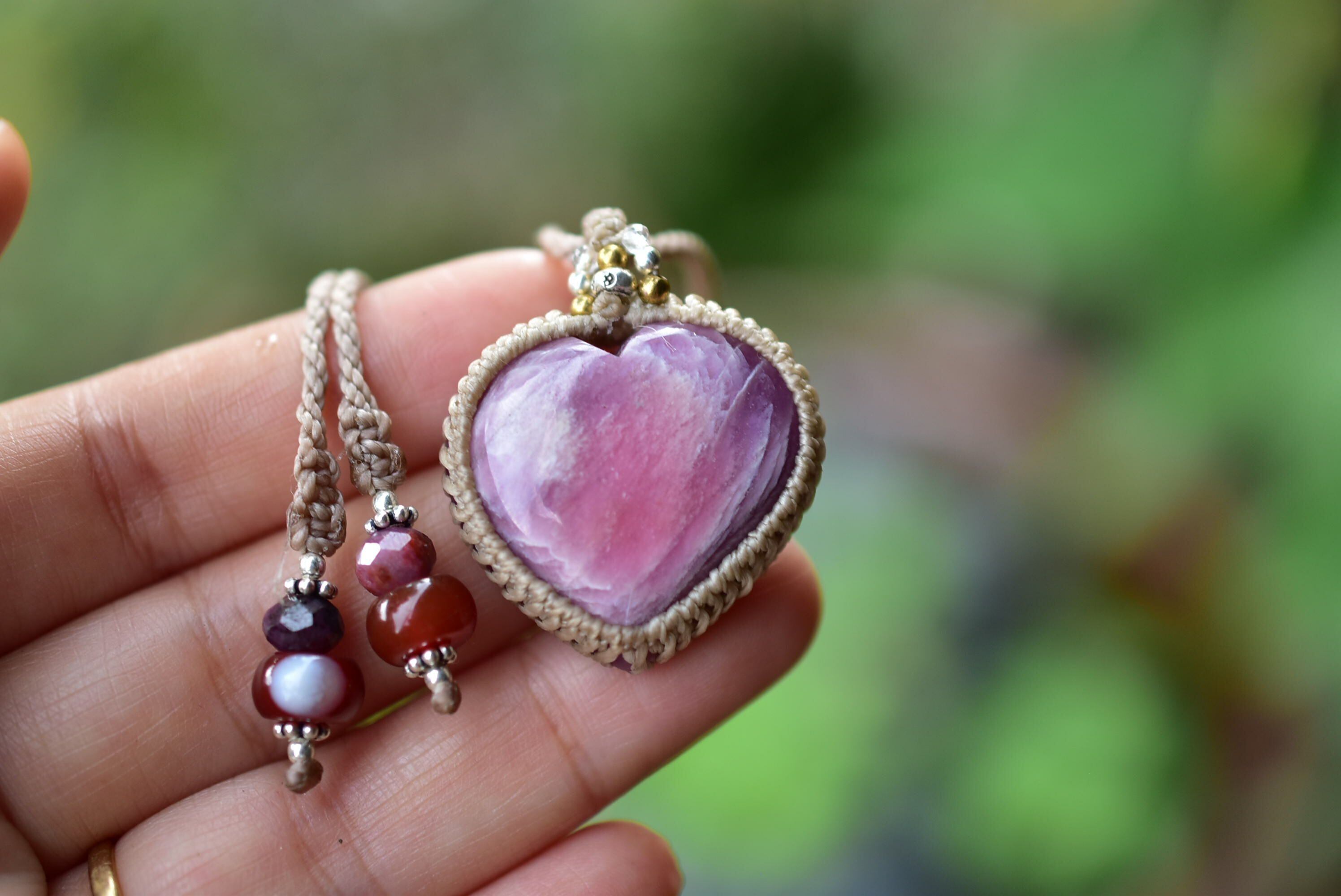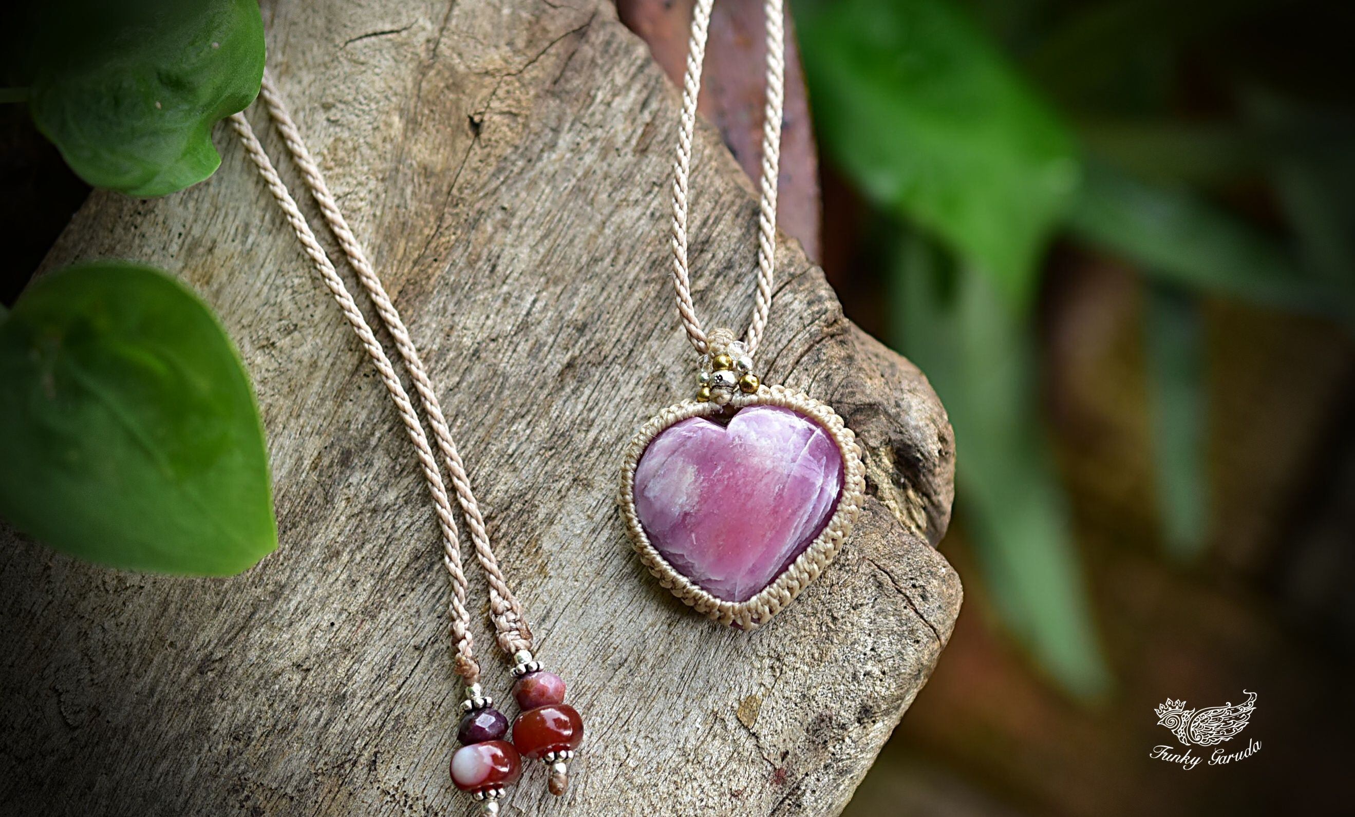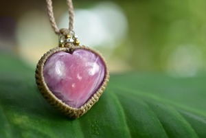 ハートシェイプに研磨されたローズルビーをマクラメ編みに仕上げました。