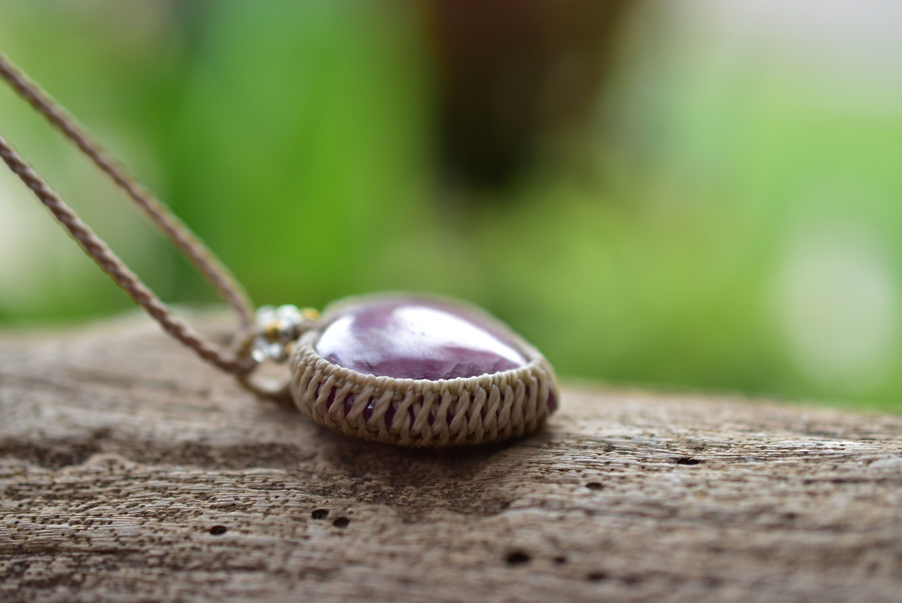 ◆このたびはキャラメル色の蝋引き糸を使用しマクラメ編み装飾を施しました。