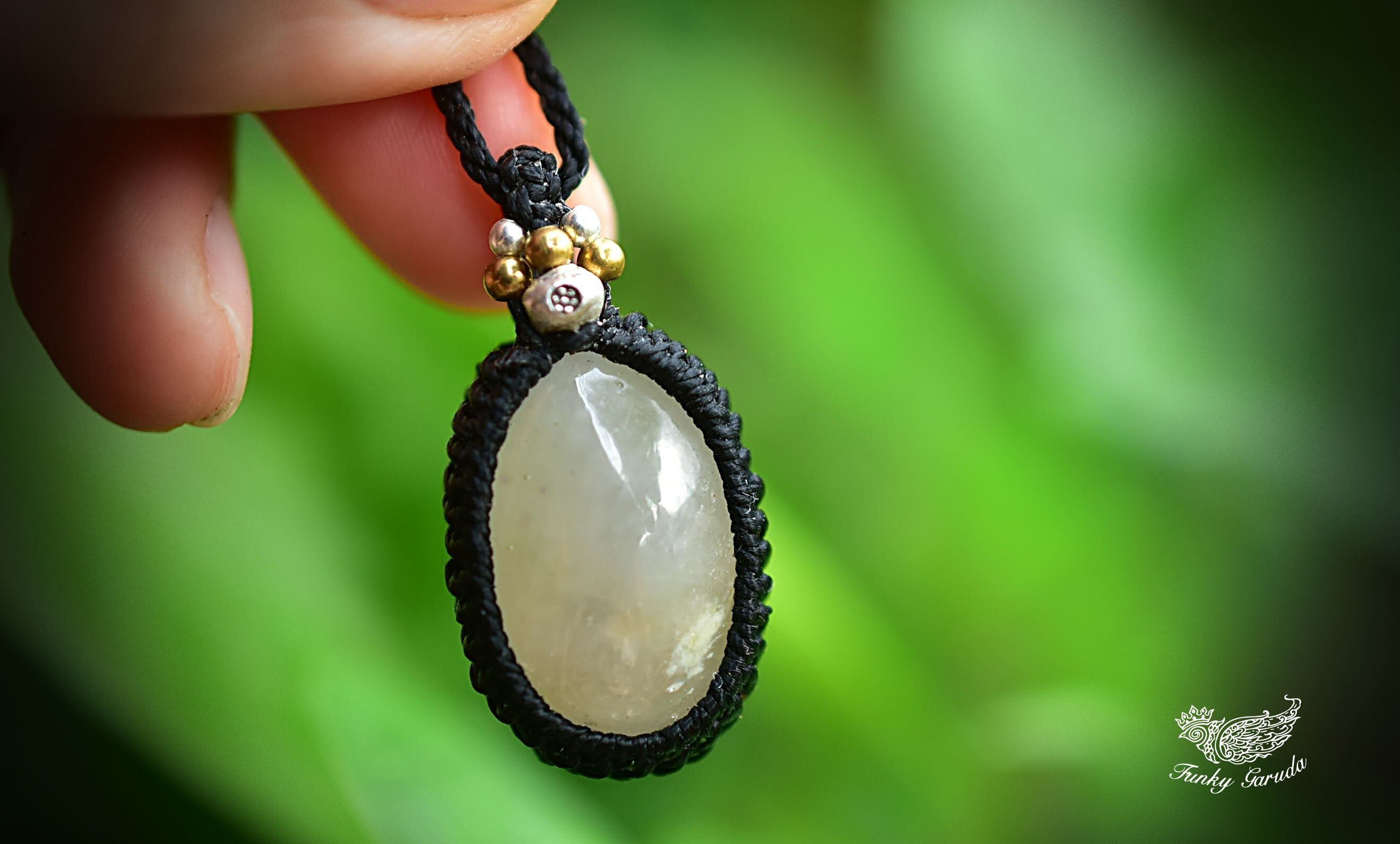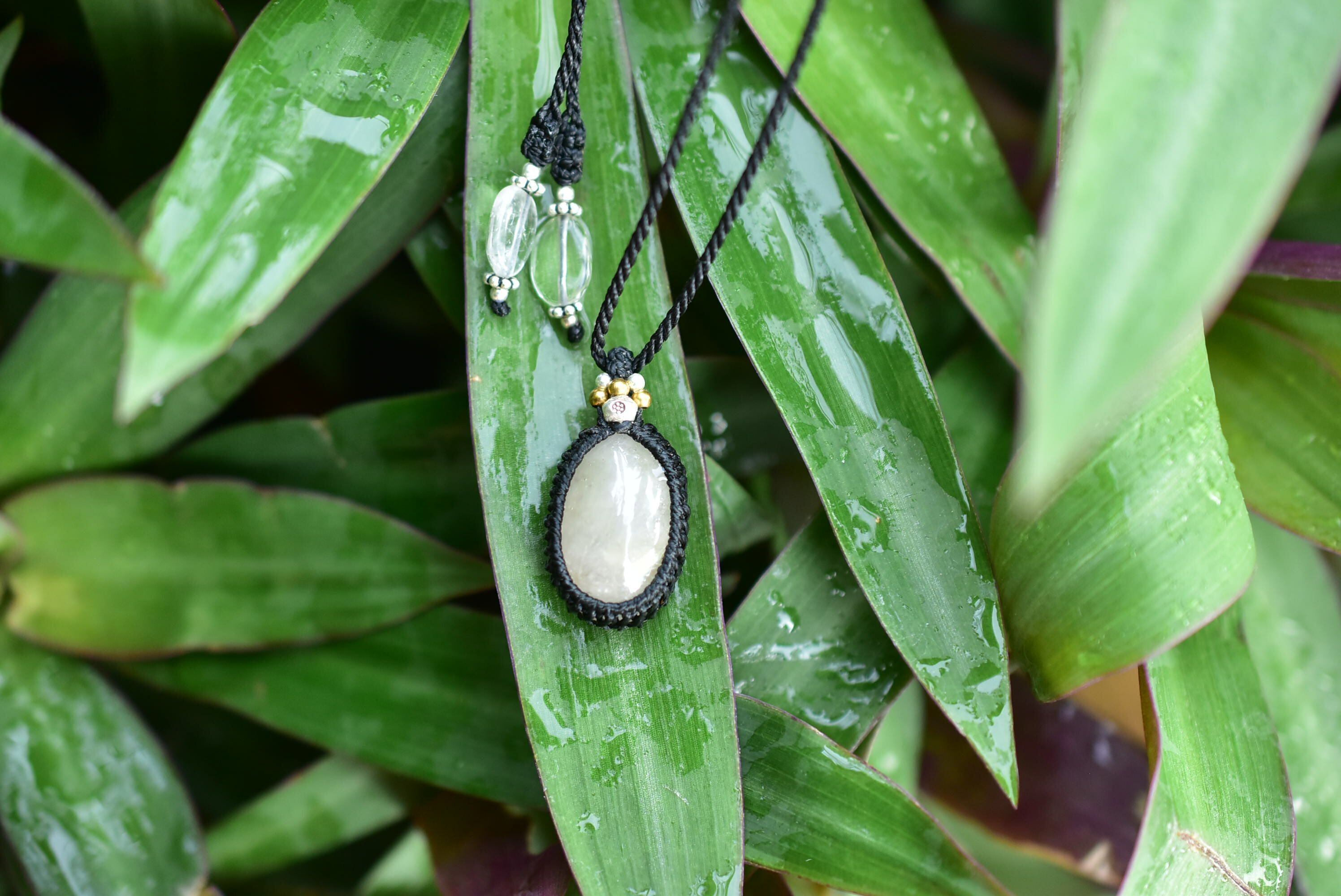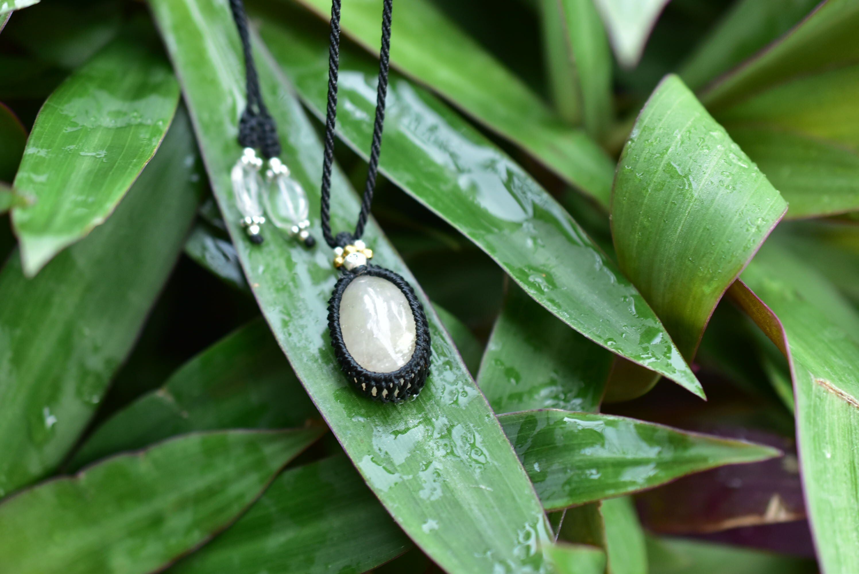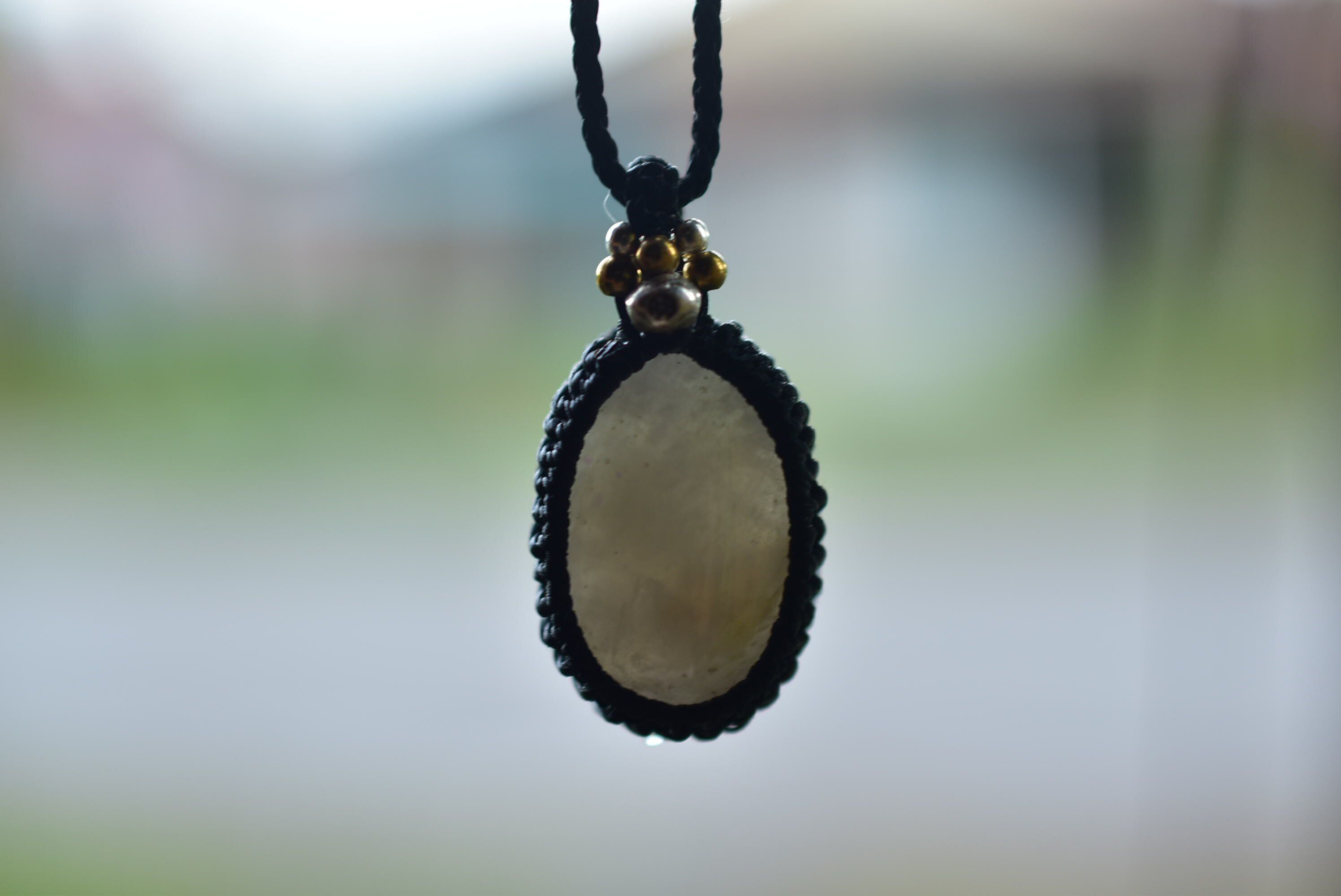 ブラック色の蝋引き糸を使用してマクラメペンダントに仕上がりました。