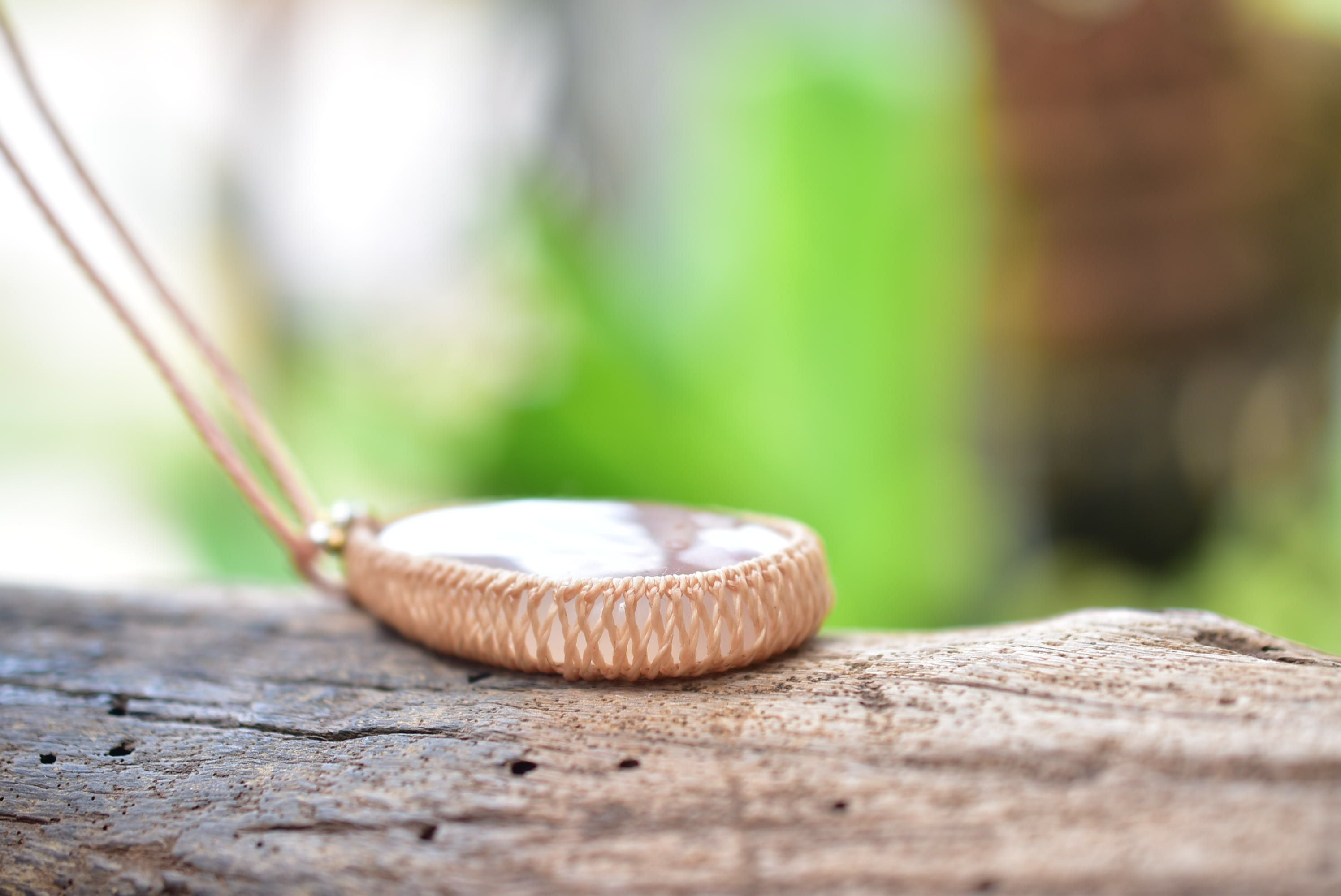 ◆このたびはキャラメル、ライトピーチ色の蝋引き糸を使用しマクラメ編み装飾を施しました。