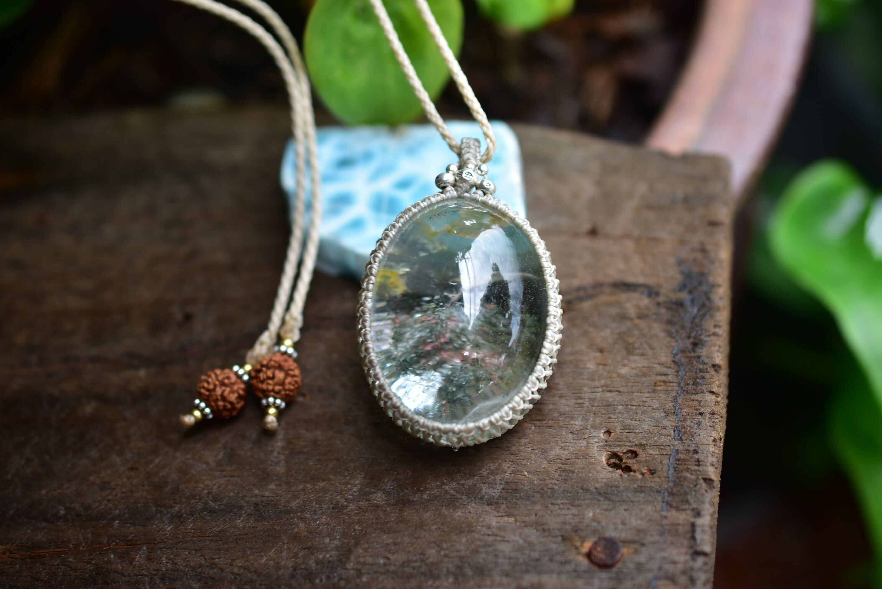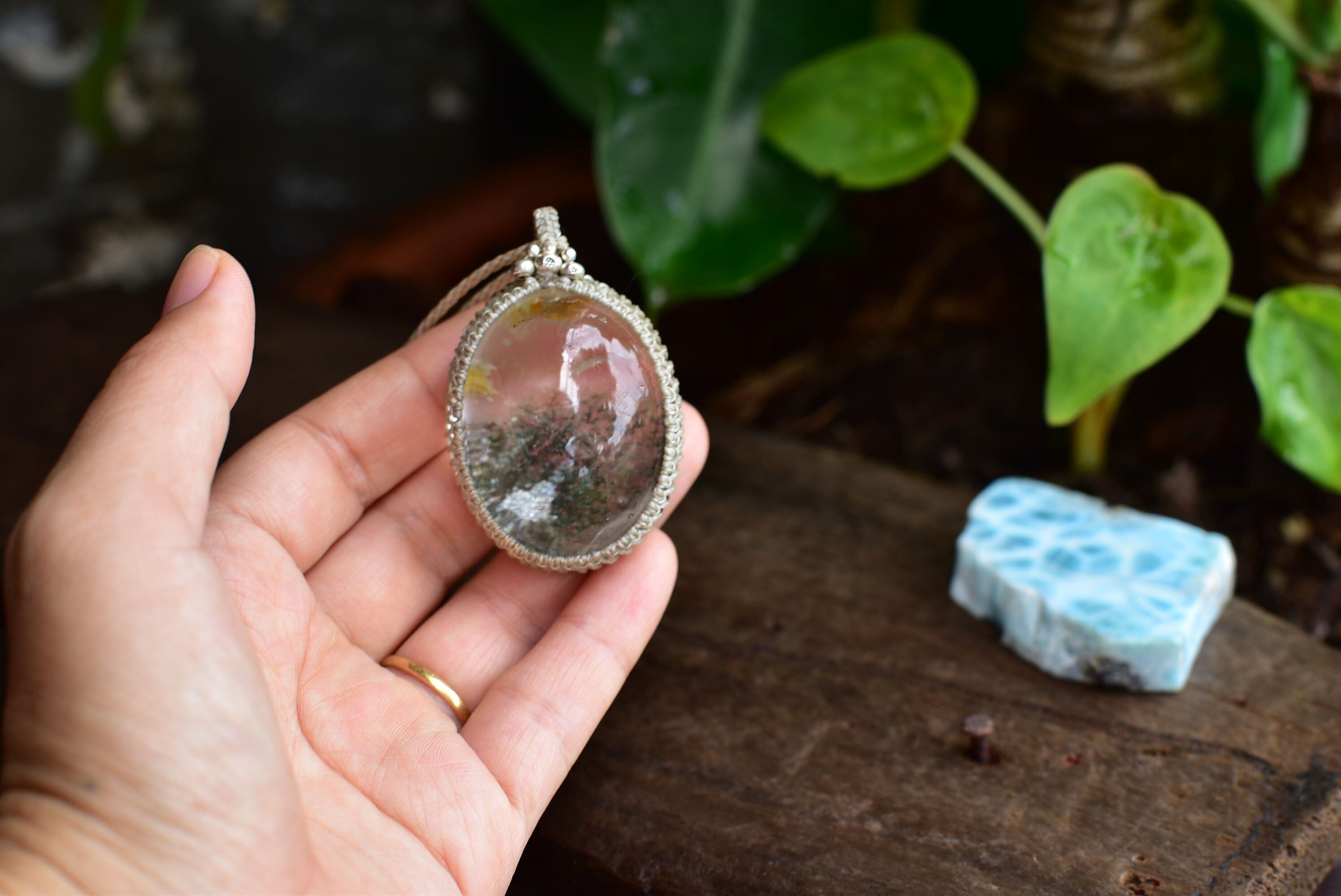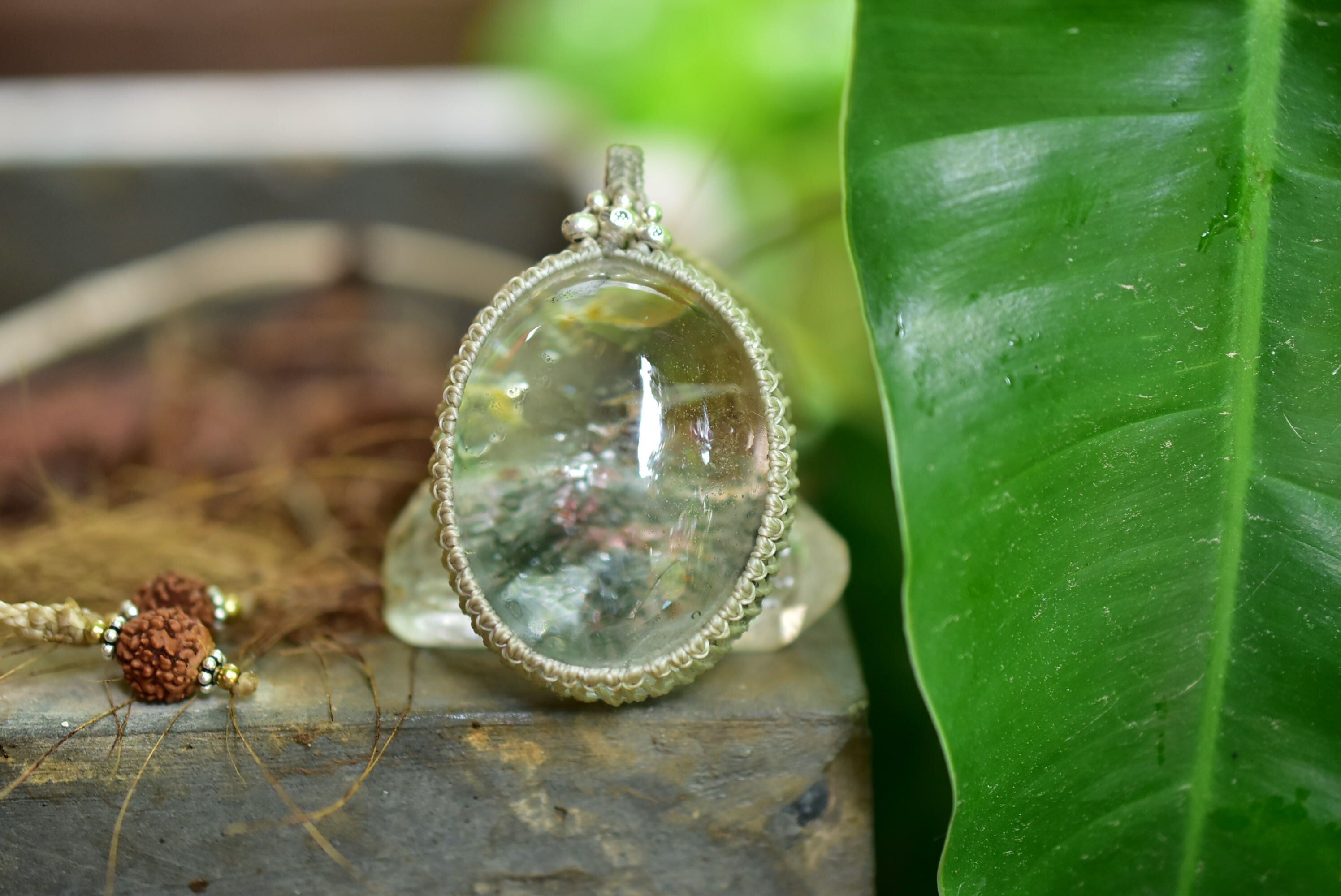 静かな緑★大粒ガーデンクォーツ シンプルマクラメペンダントgy051