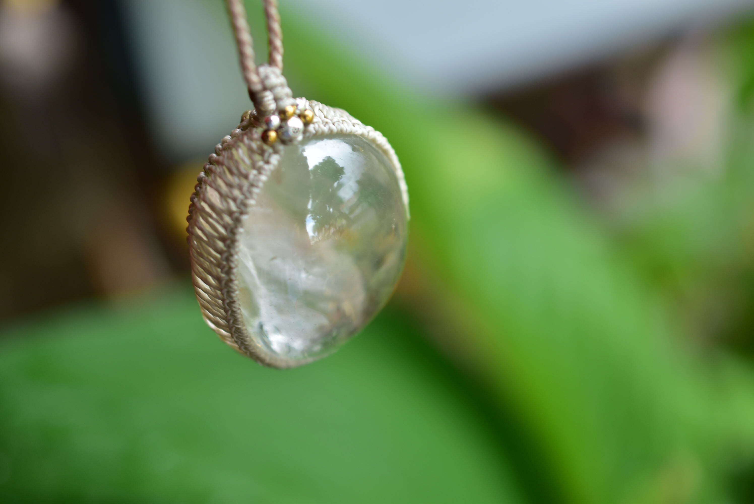 ◆このたびはヘンプ色の蝋引き糸を使用しマクラメ編み装飾を施しました。