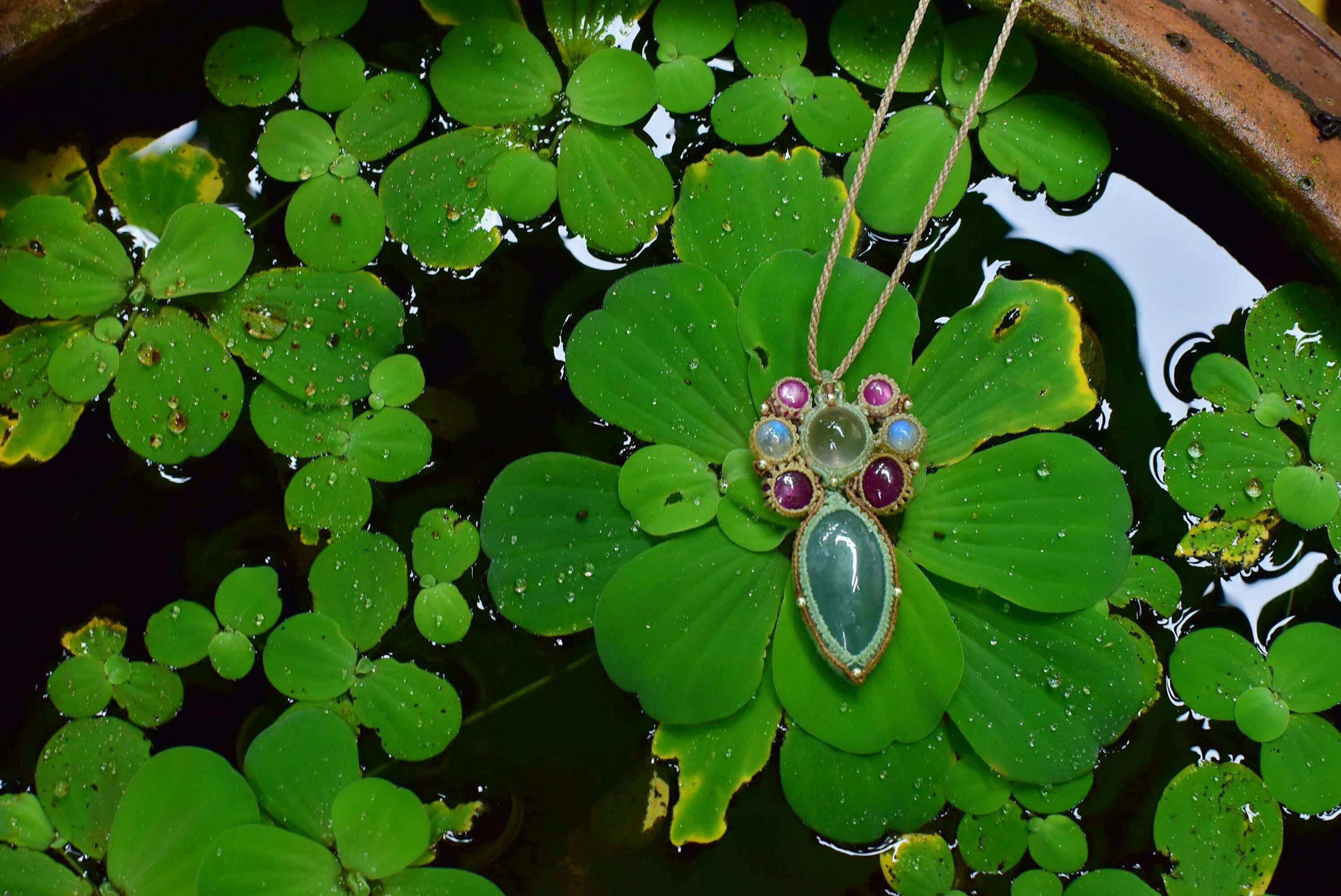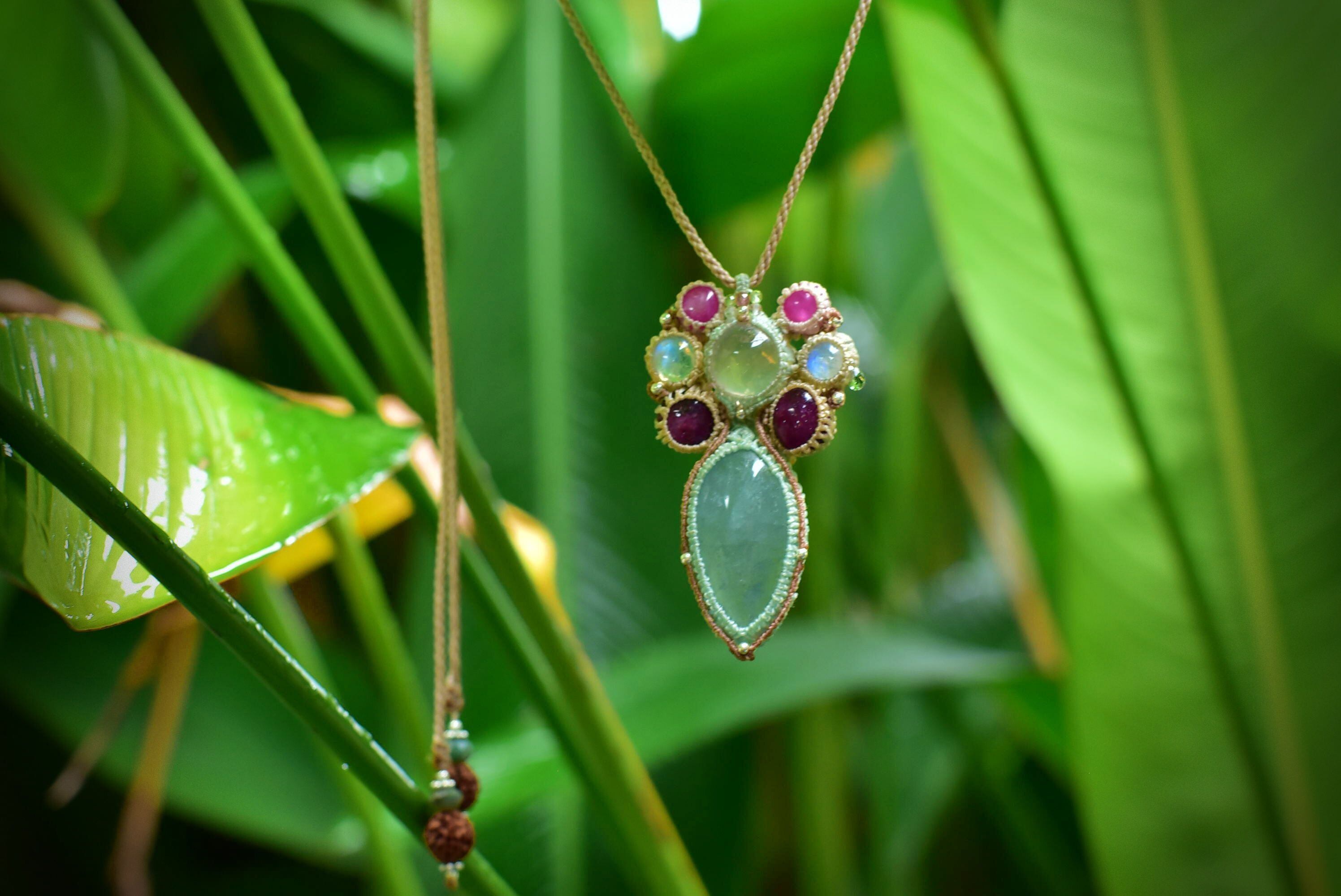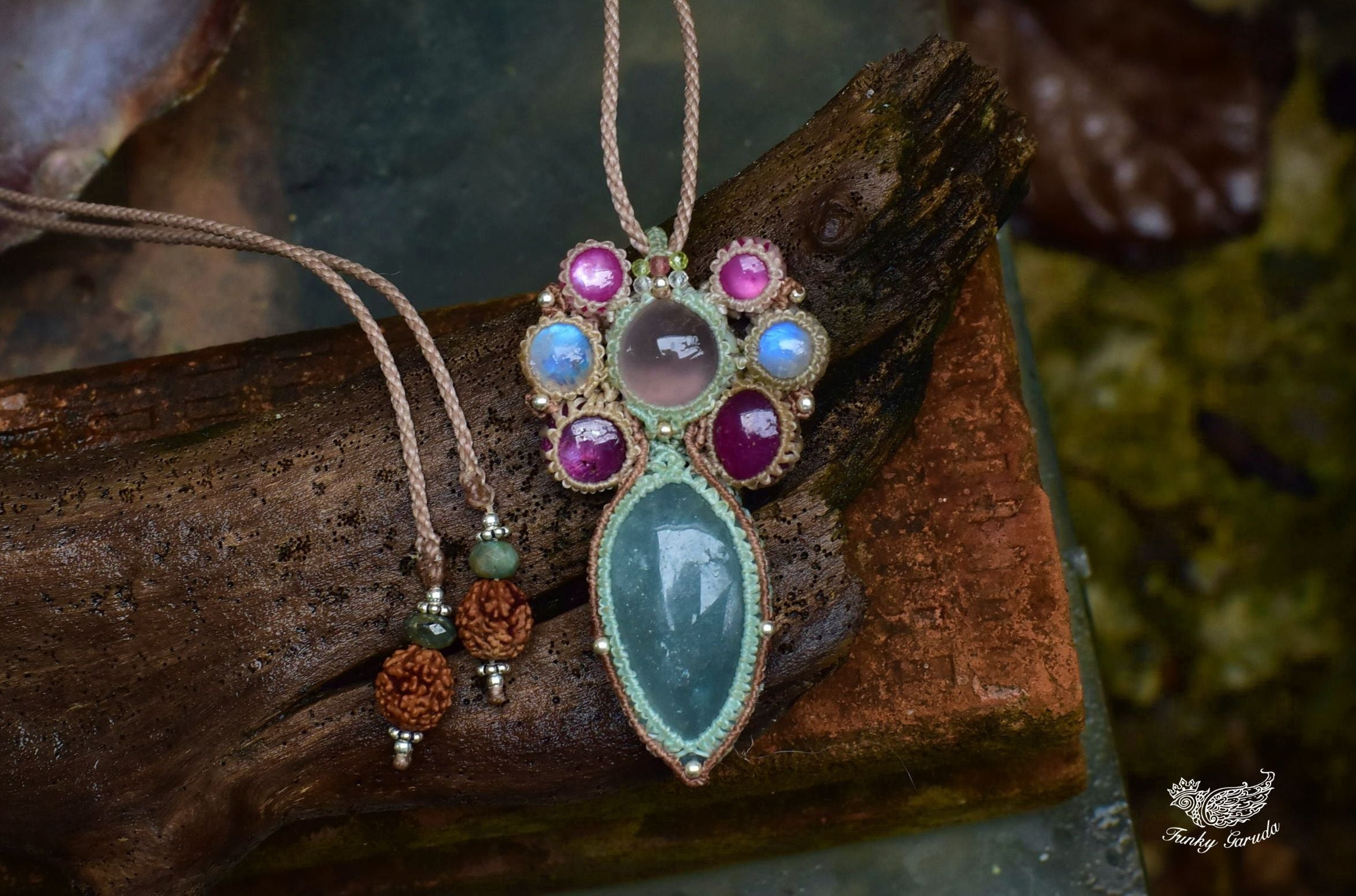 水の花ばな★アクアマリン スターローズクォーツ ムーンストーン ルビーマクラメペンダントaqua017