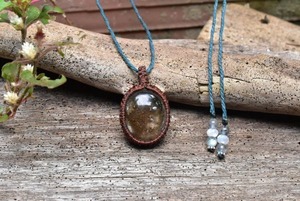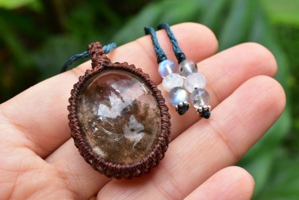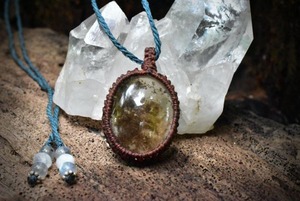 水晶の中にじつはもうひとつのシラーが鏡のように入り込んでいる内包物とシラーが入り乱れた不思議なガーデンクォーツをシンプルにマクラメペンダントに仕上げました。