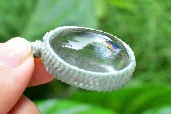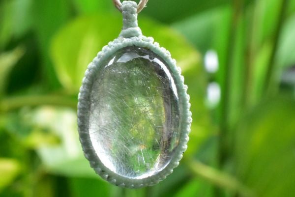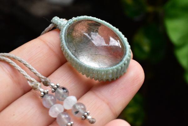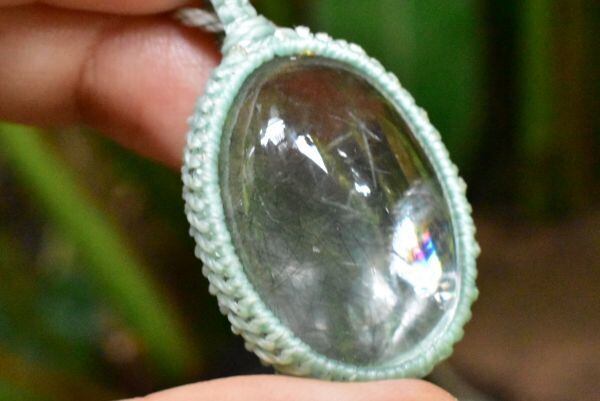 柔らかく細かいアンフィボールのようなルチルクォーツの中に虹インクルージョンを見ることができる透明感も高い高品質のルチルインクォーツをシンプルにマクラメペンダントに仕上げました。