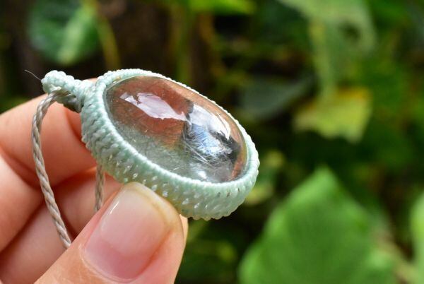 ◆このたびはミント、ヘンプ色の蝋引き糸を使用しマクラメ編み装飾を施しました。