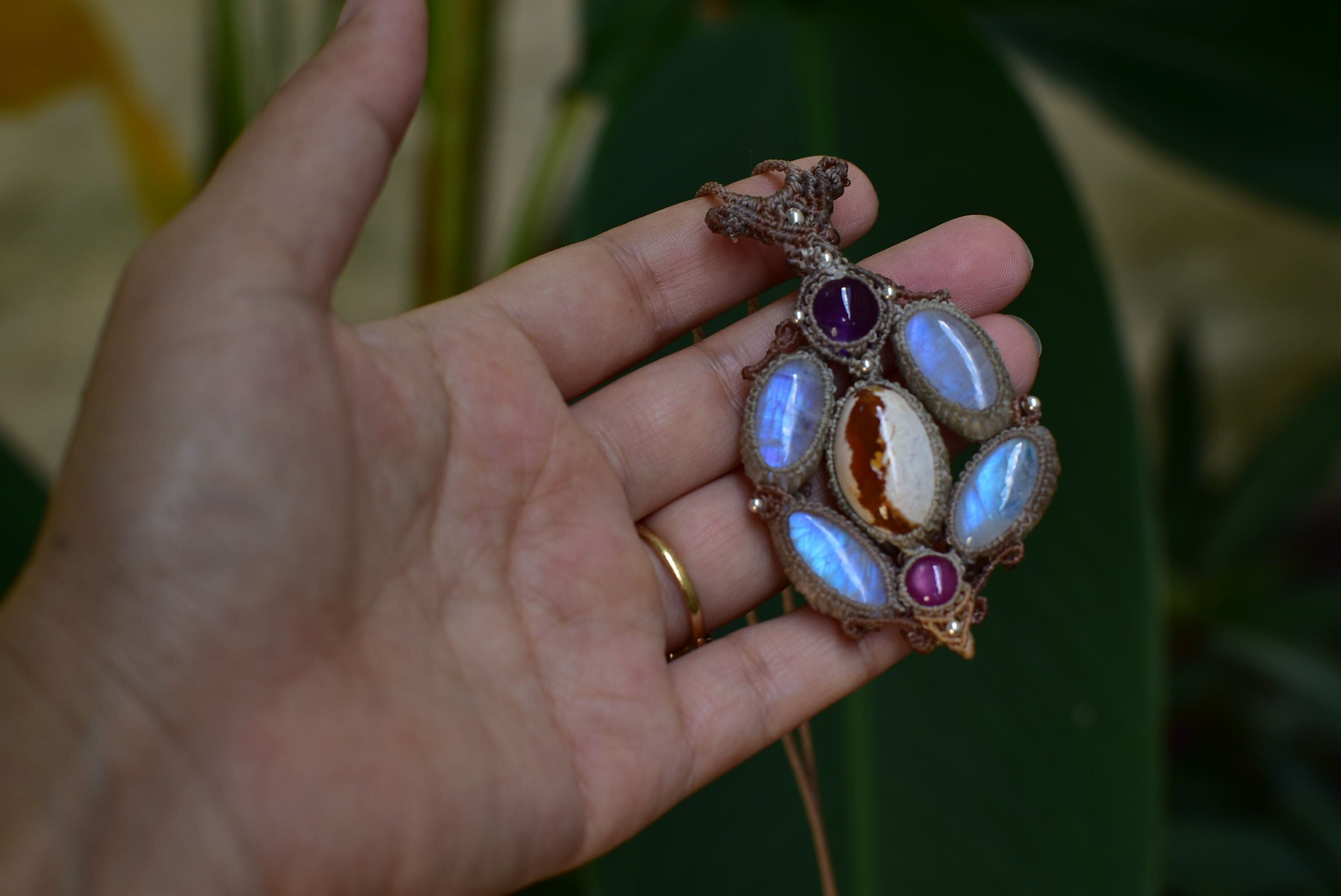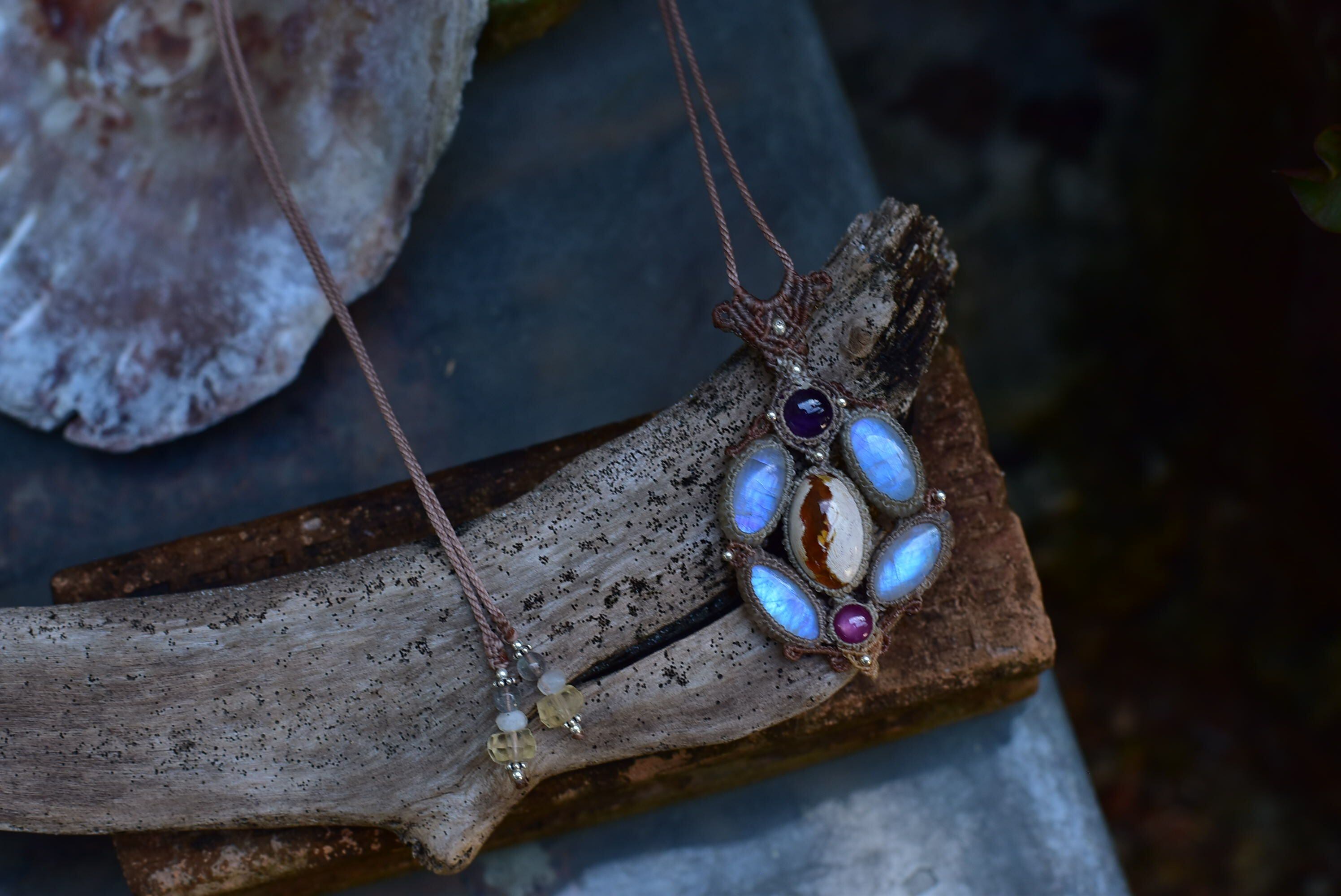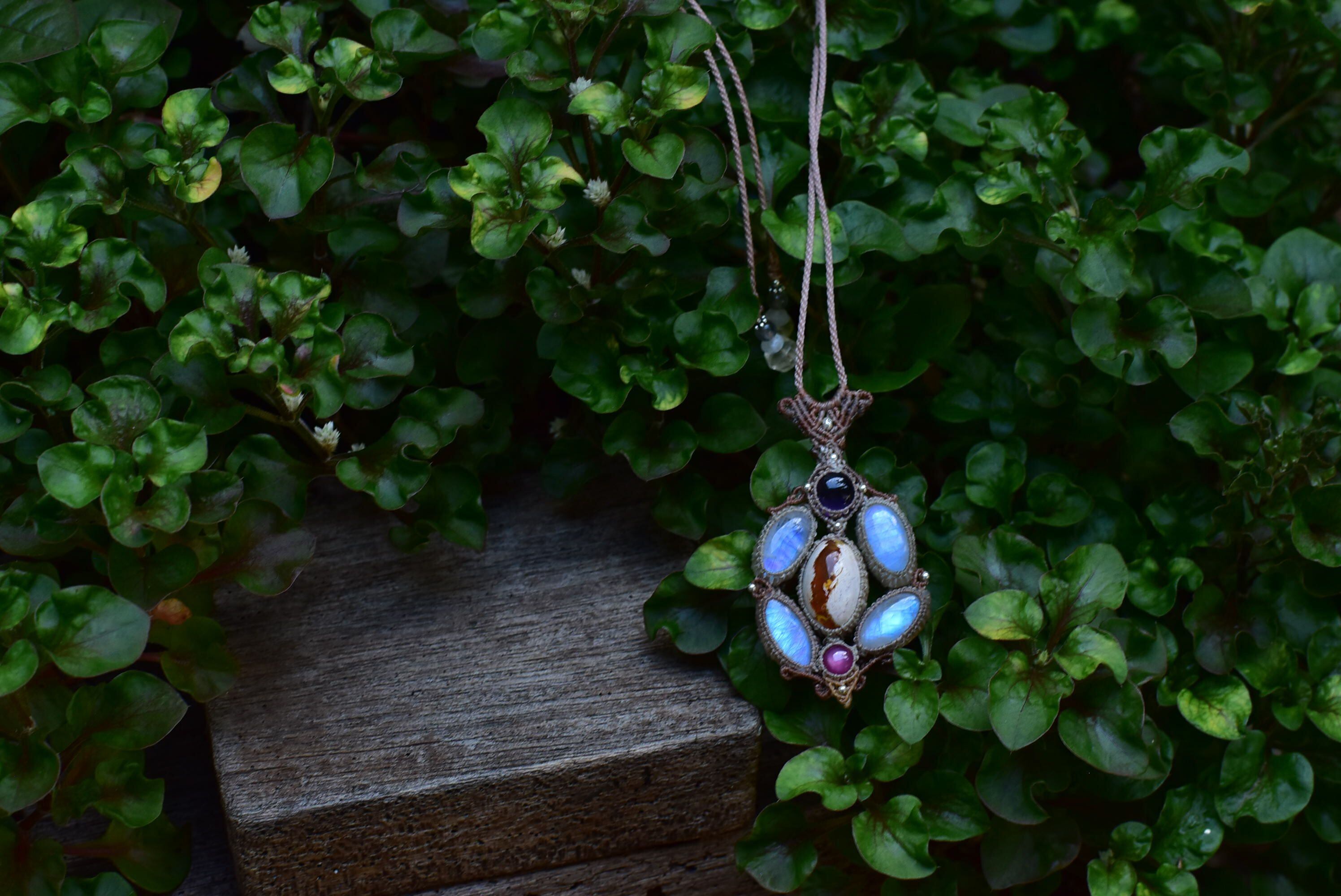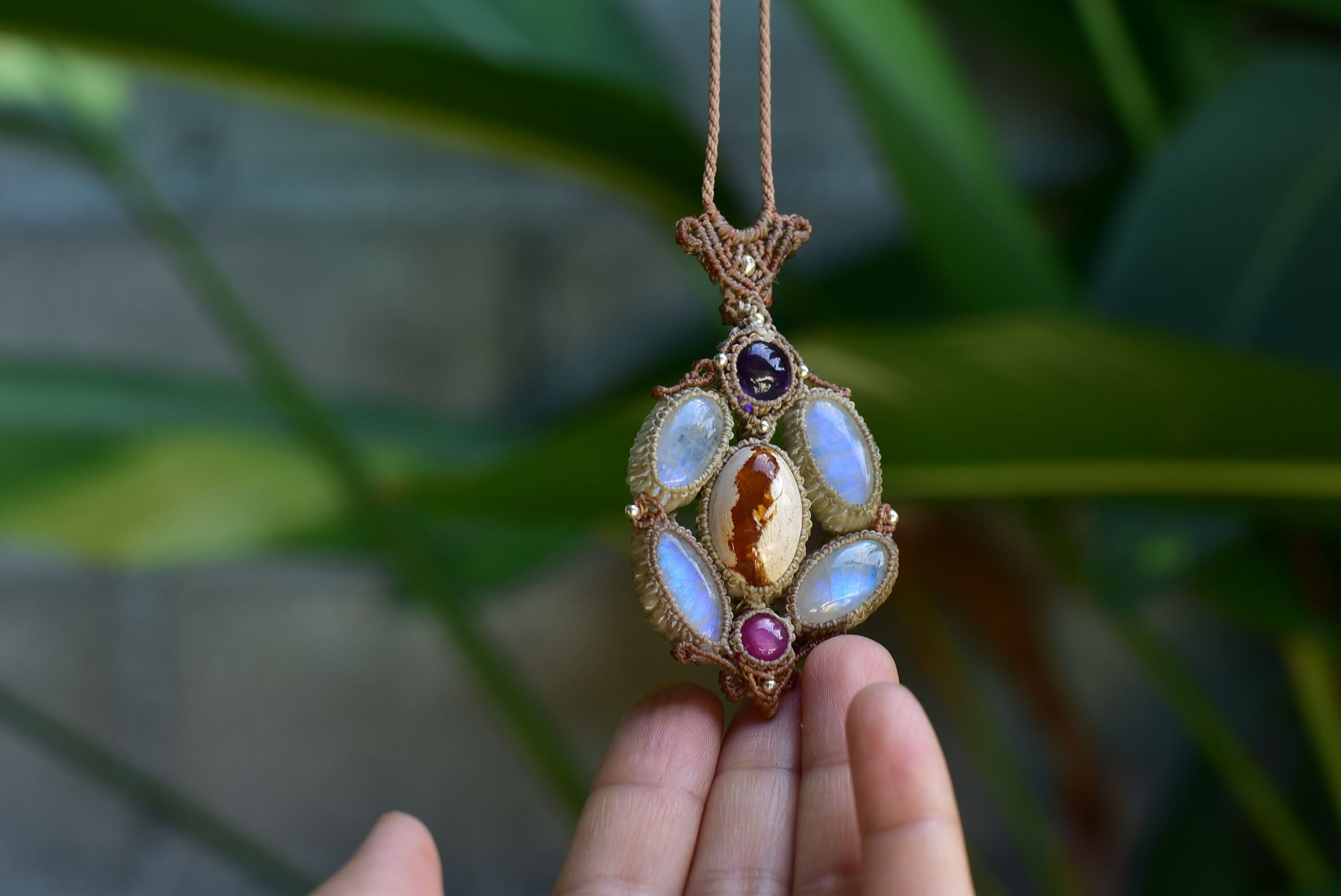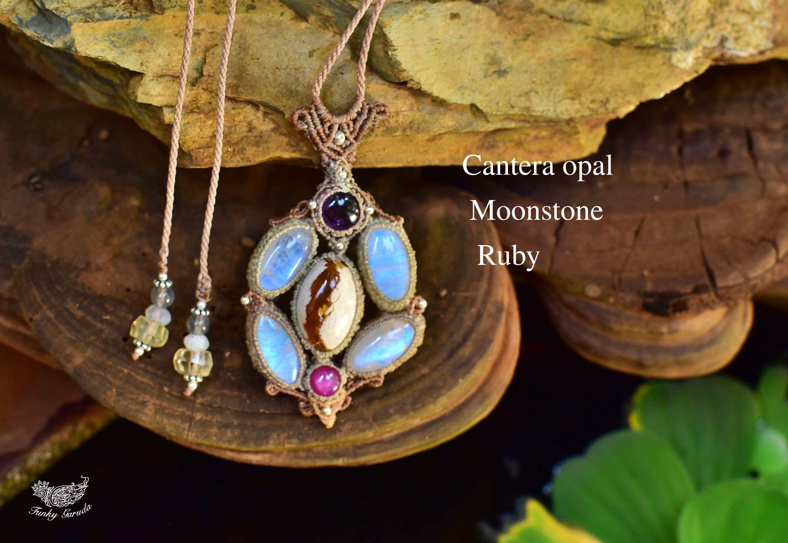 華と曼荼羅模様★カンテラオパール レインボームーンストーン ルビー マクラメペンダントopal021