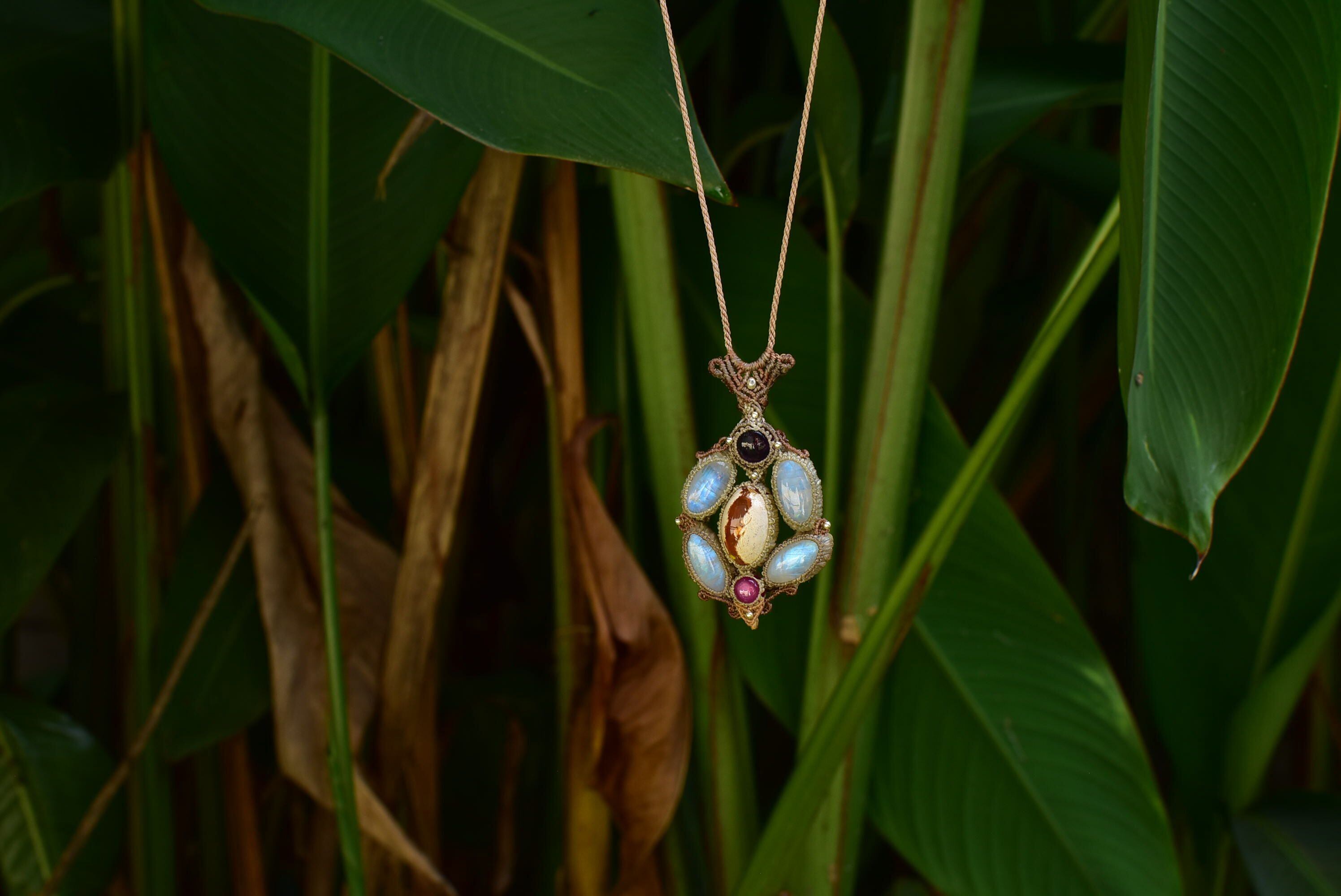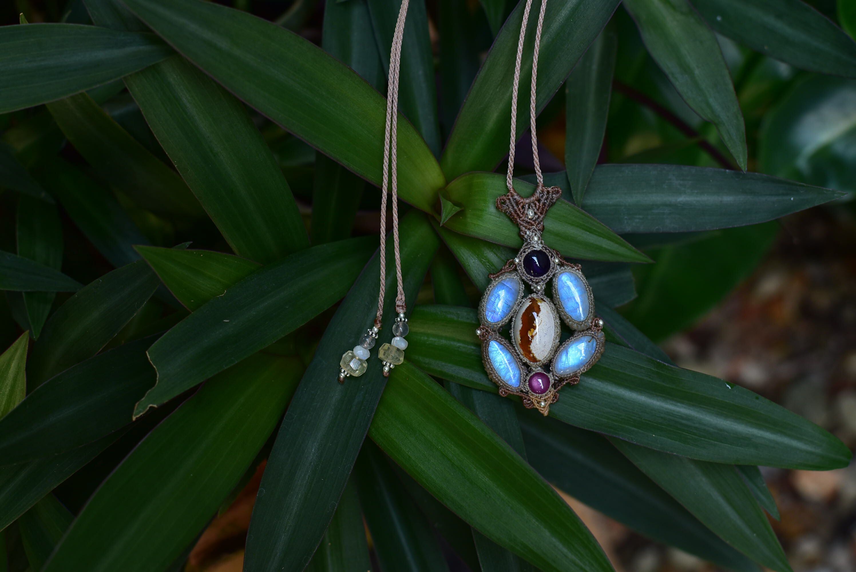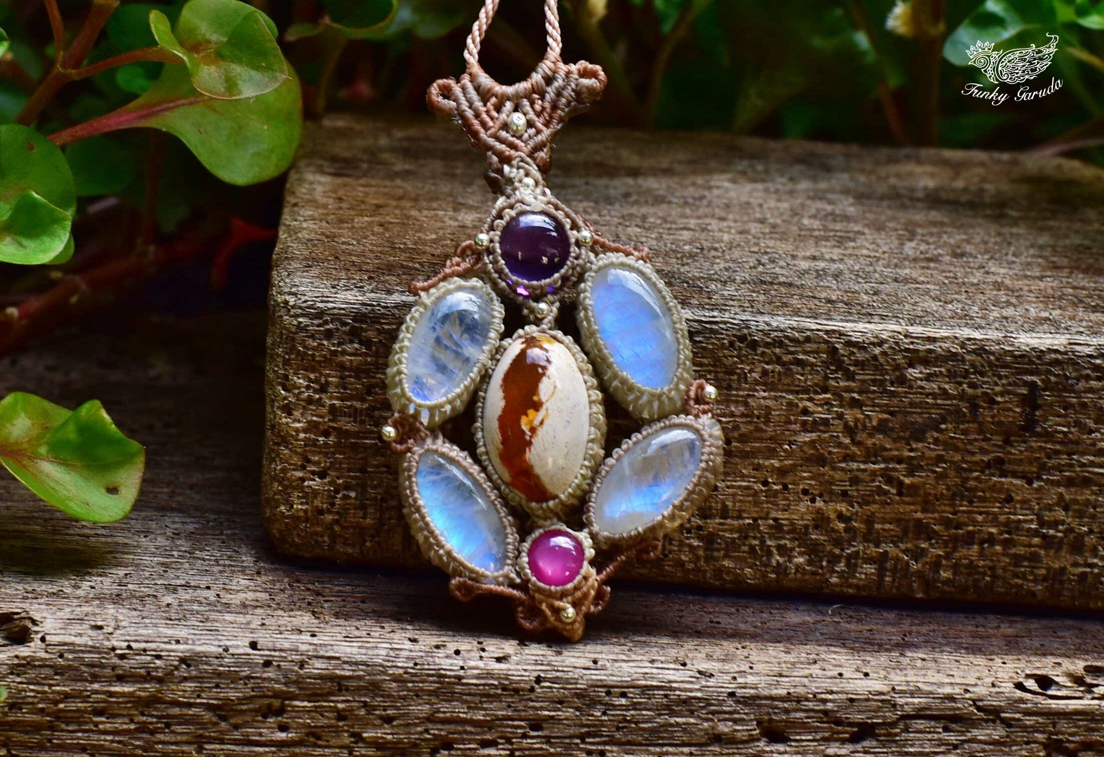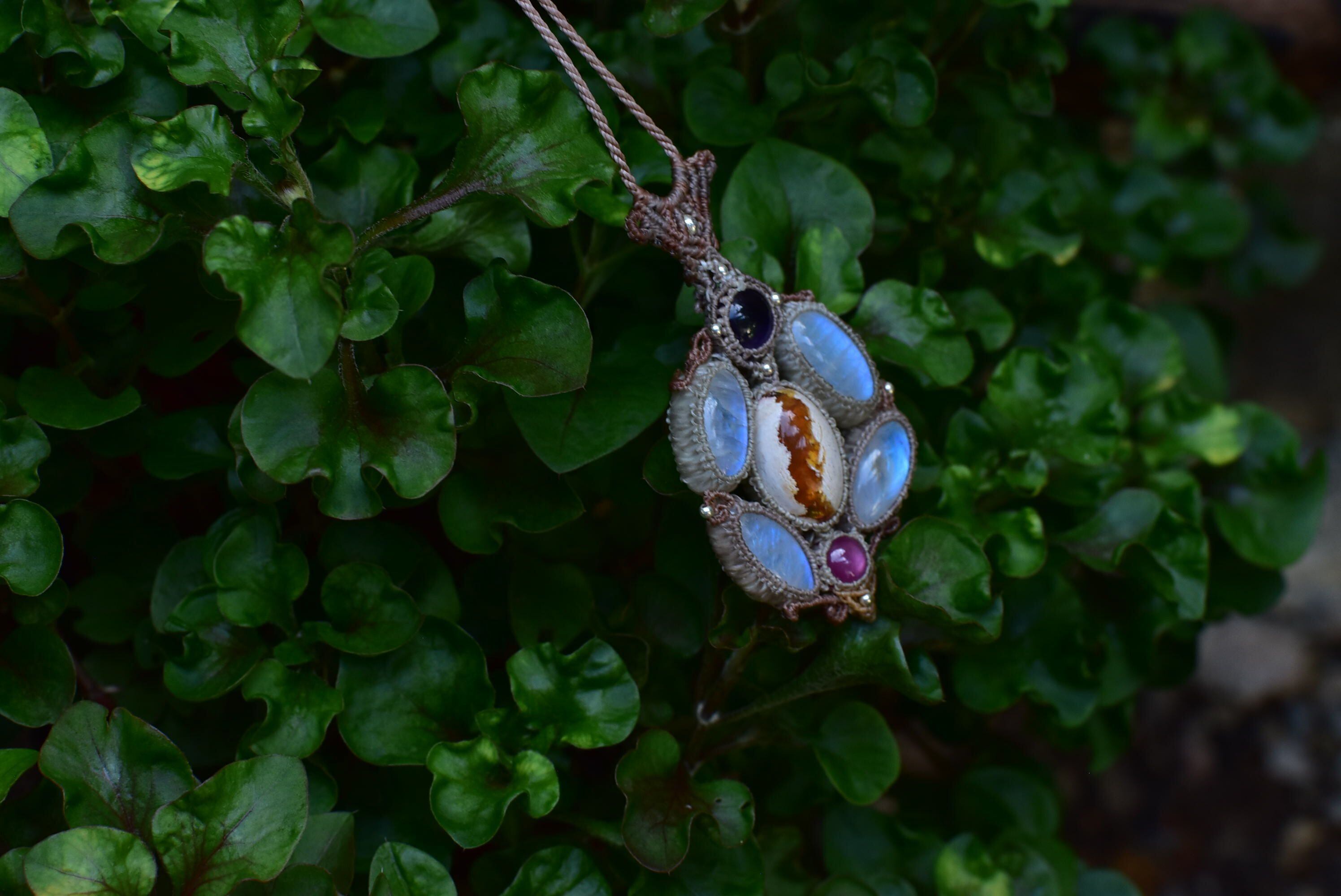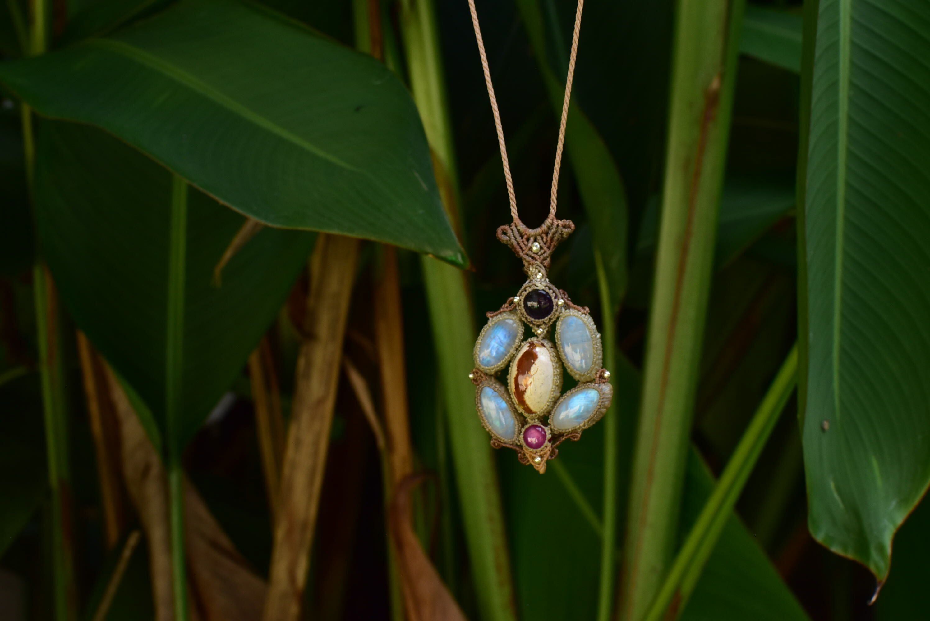 華と曼荼羅模様★カンテラオパール レインボームーンストーン ルビー マクラメペンダントopal021