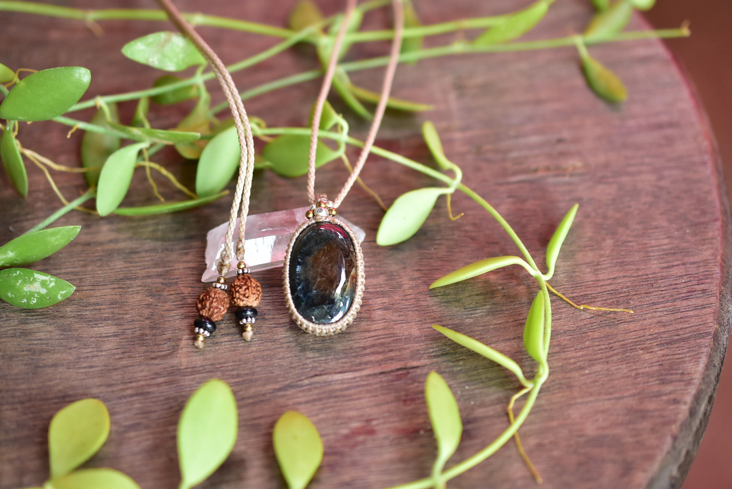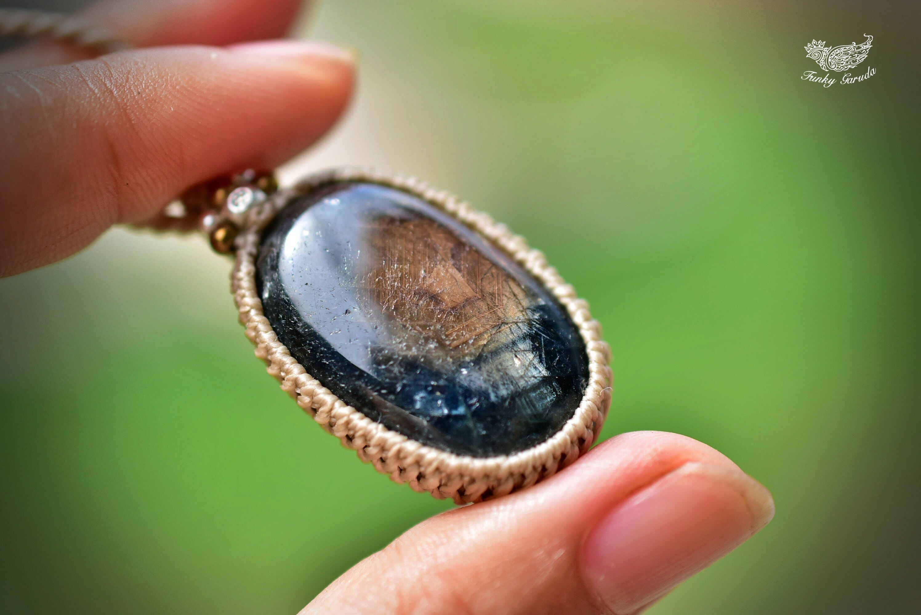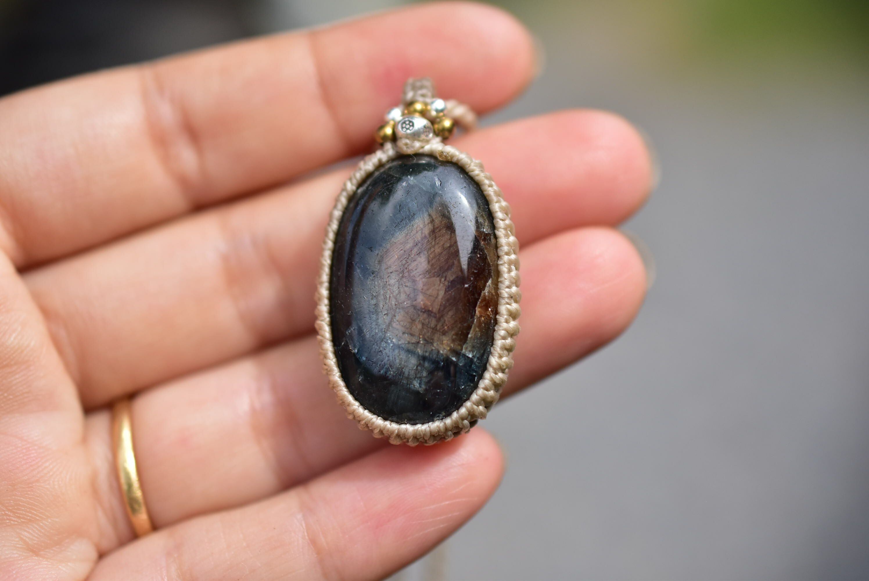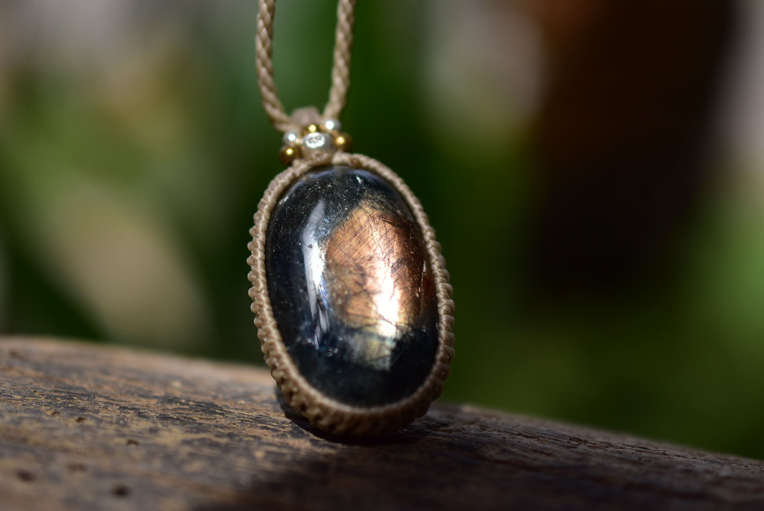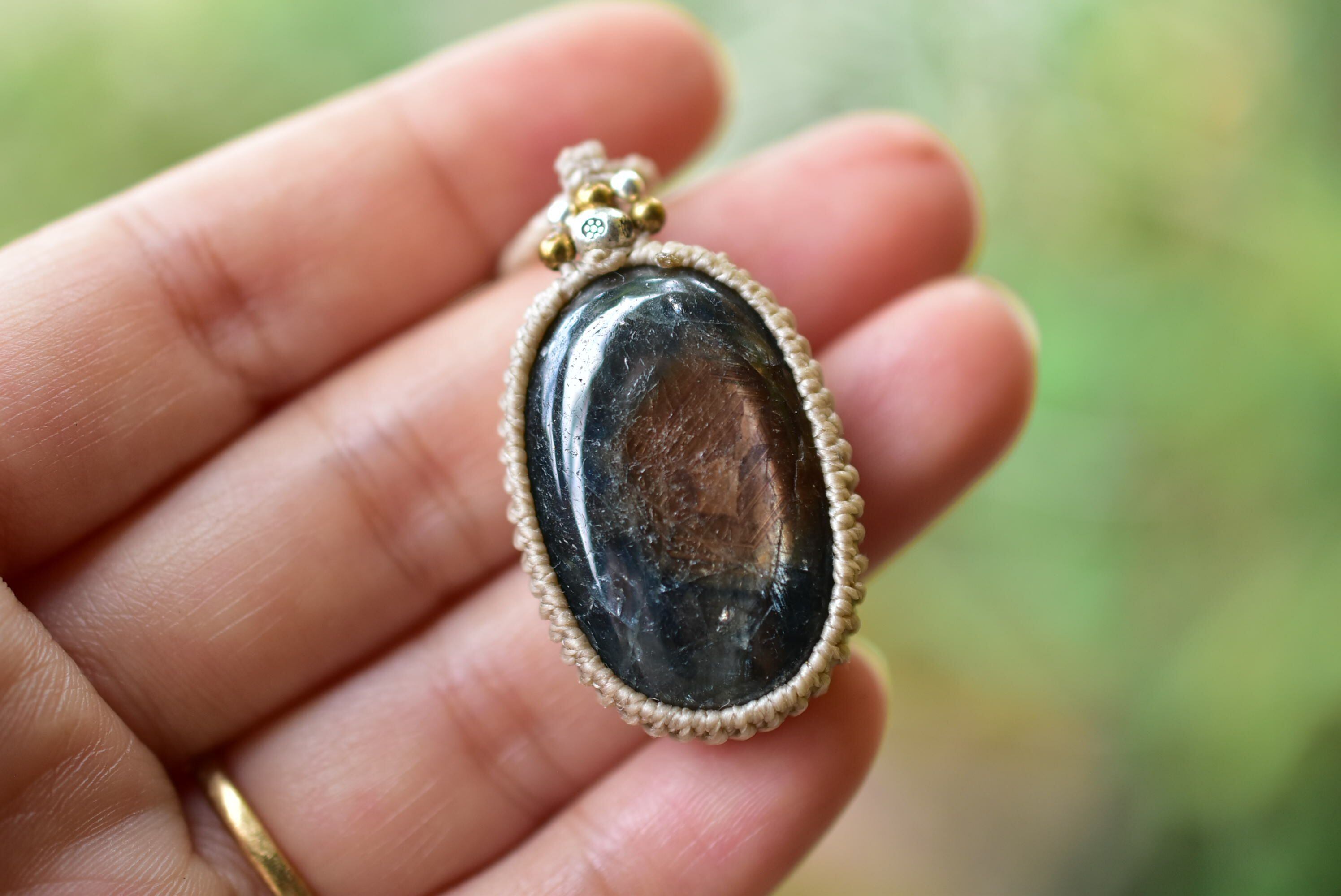 レアカラーとも言えるブラックサファイアをマクラメペンダントにして仕上げました。