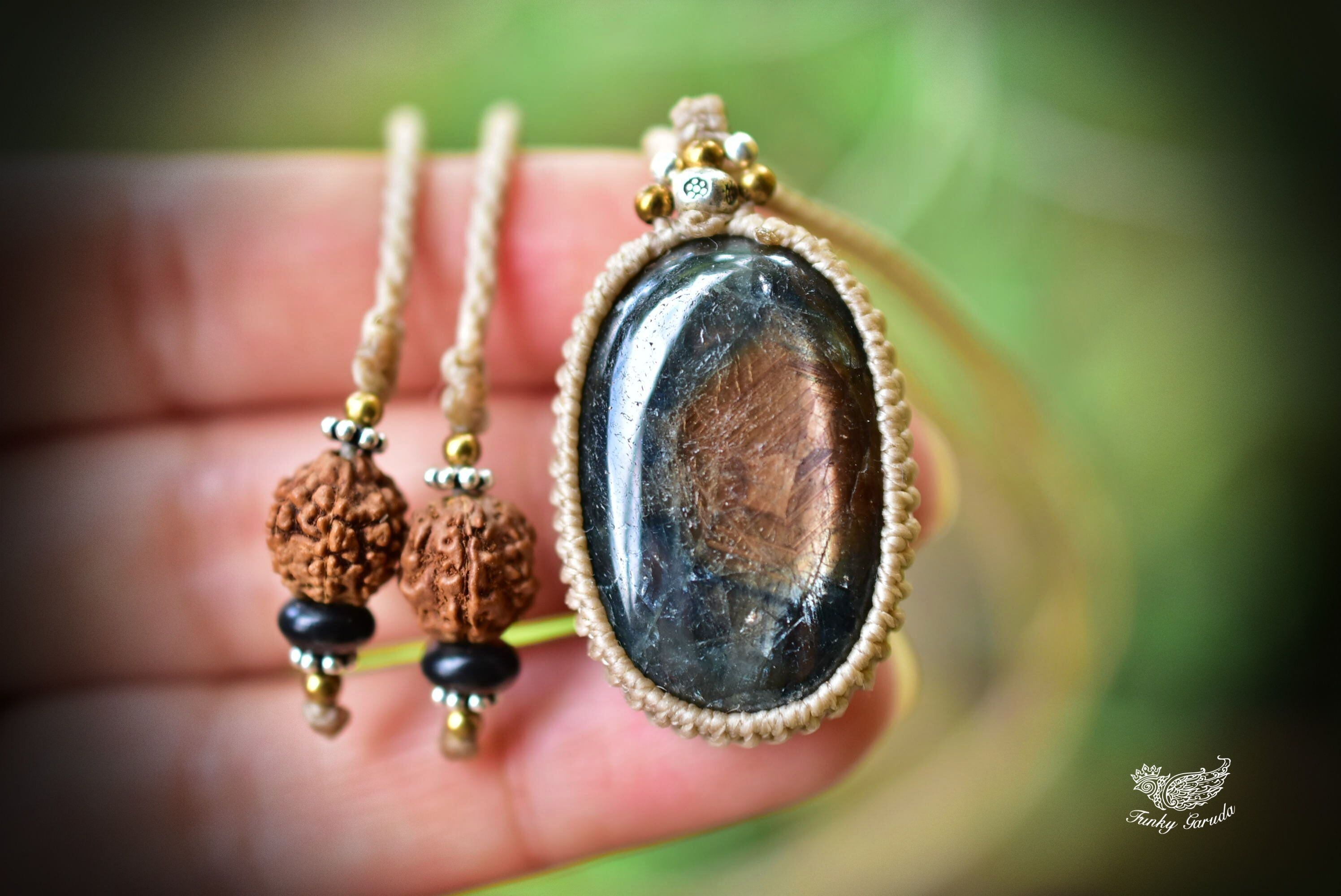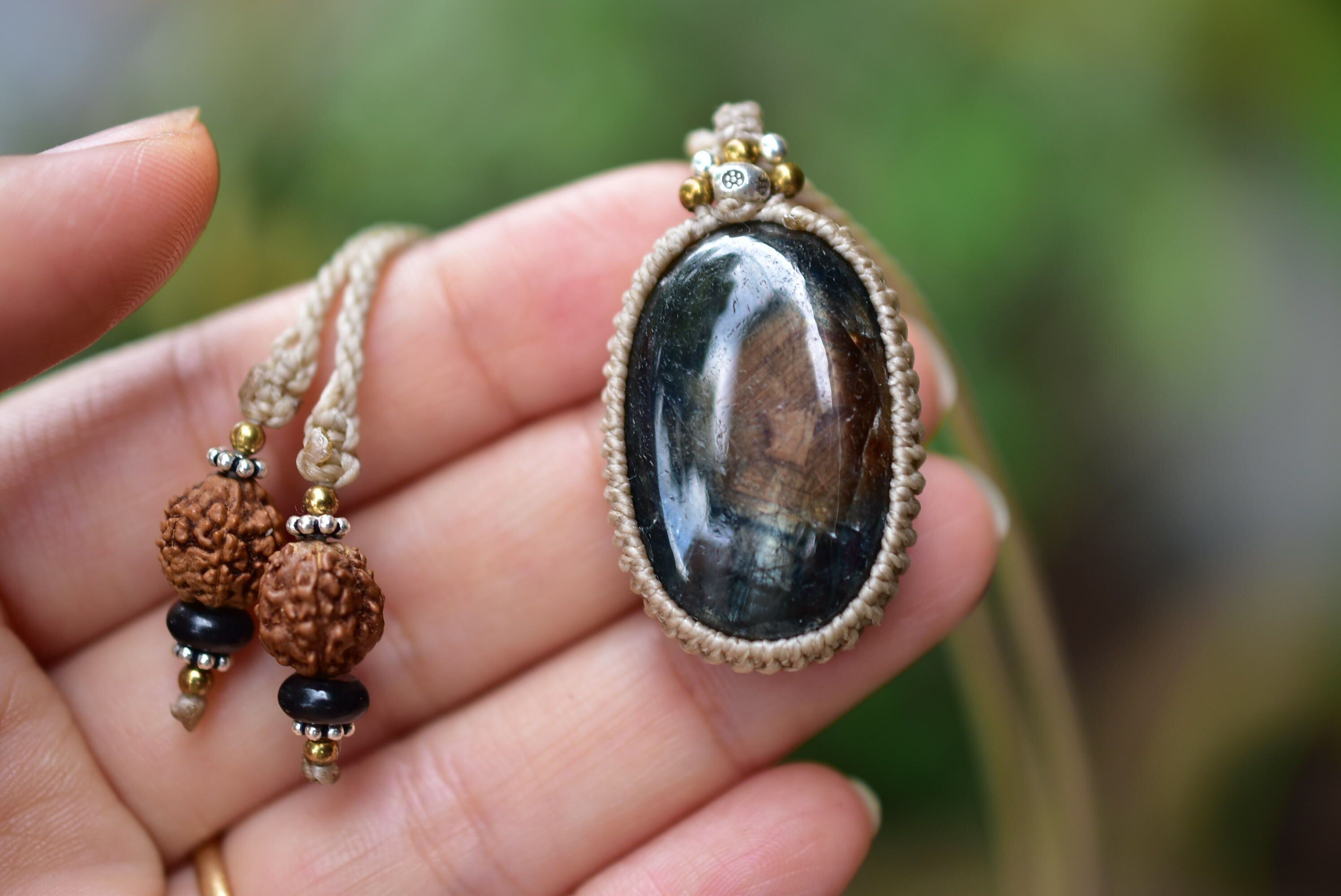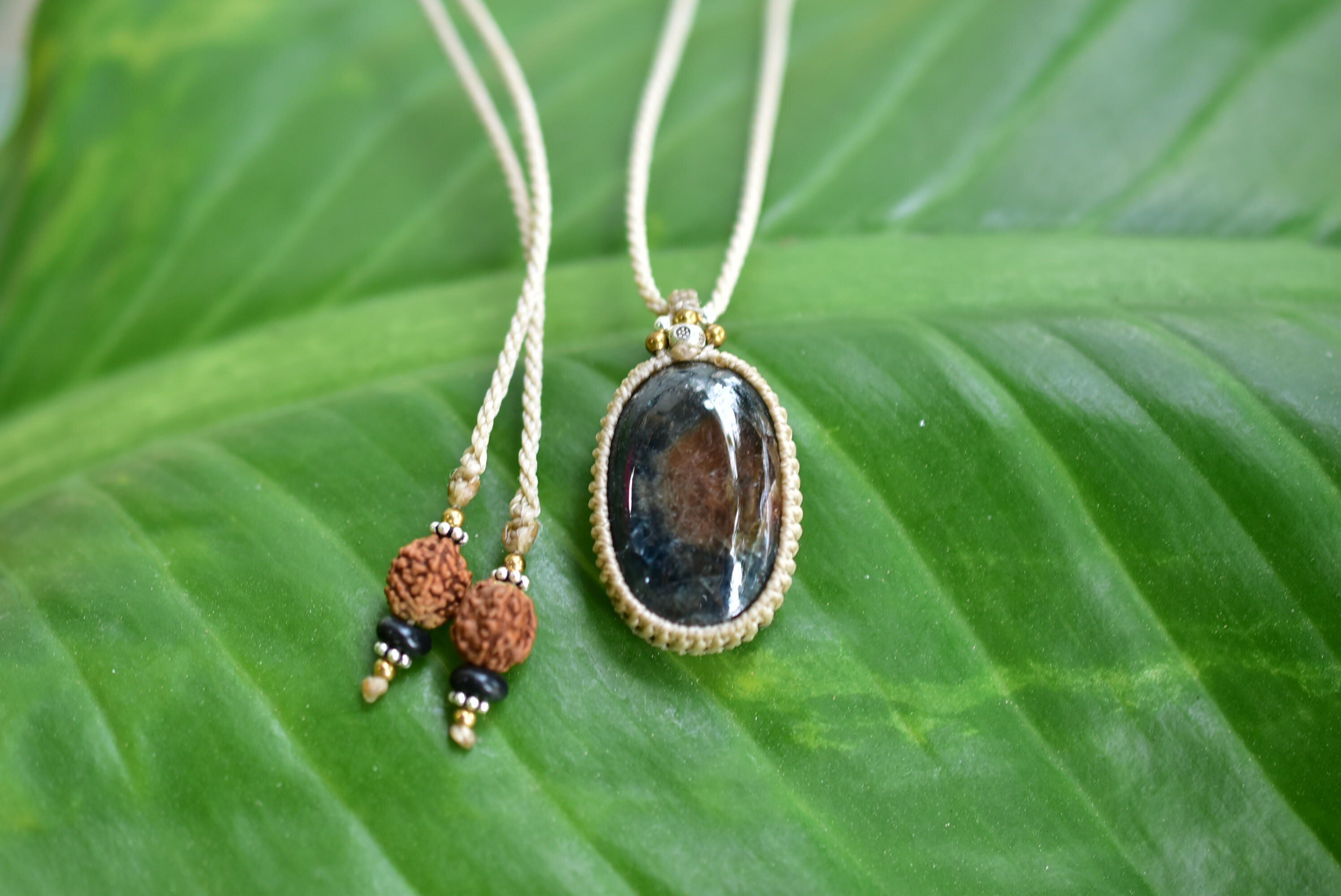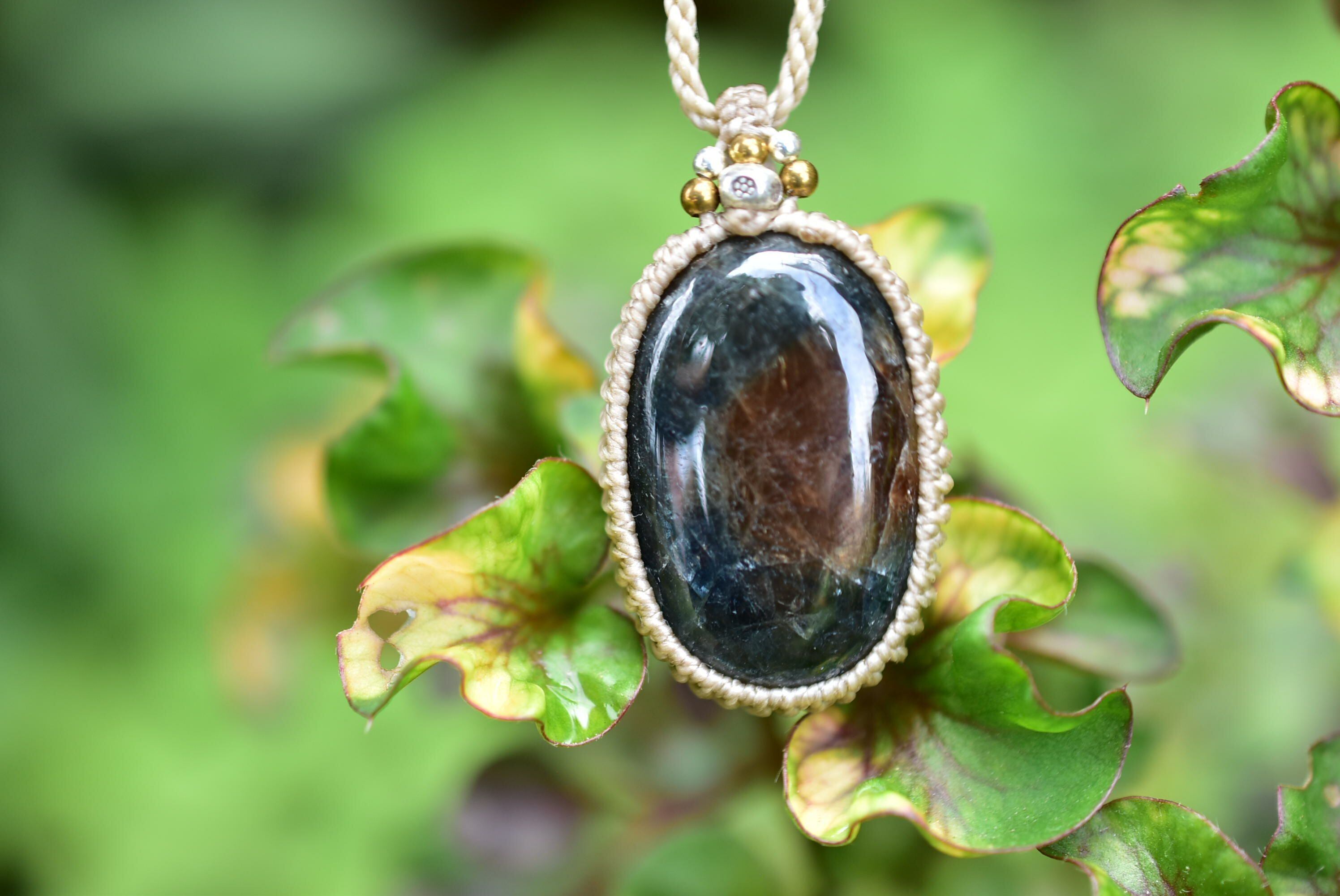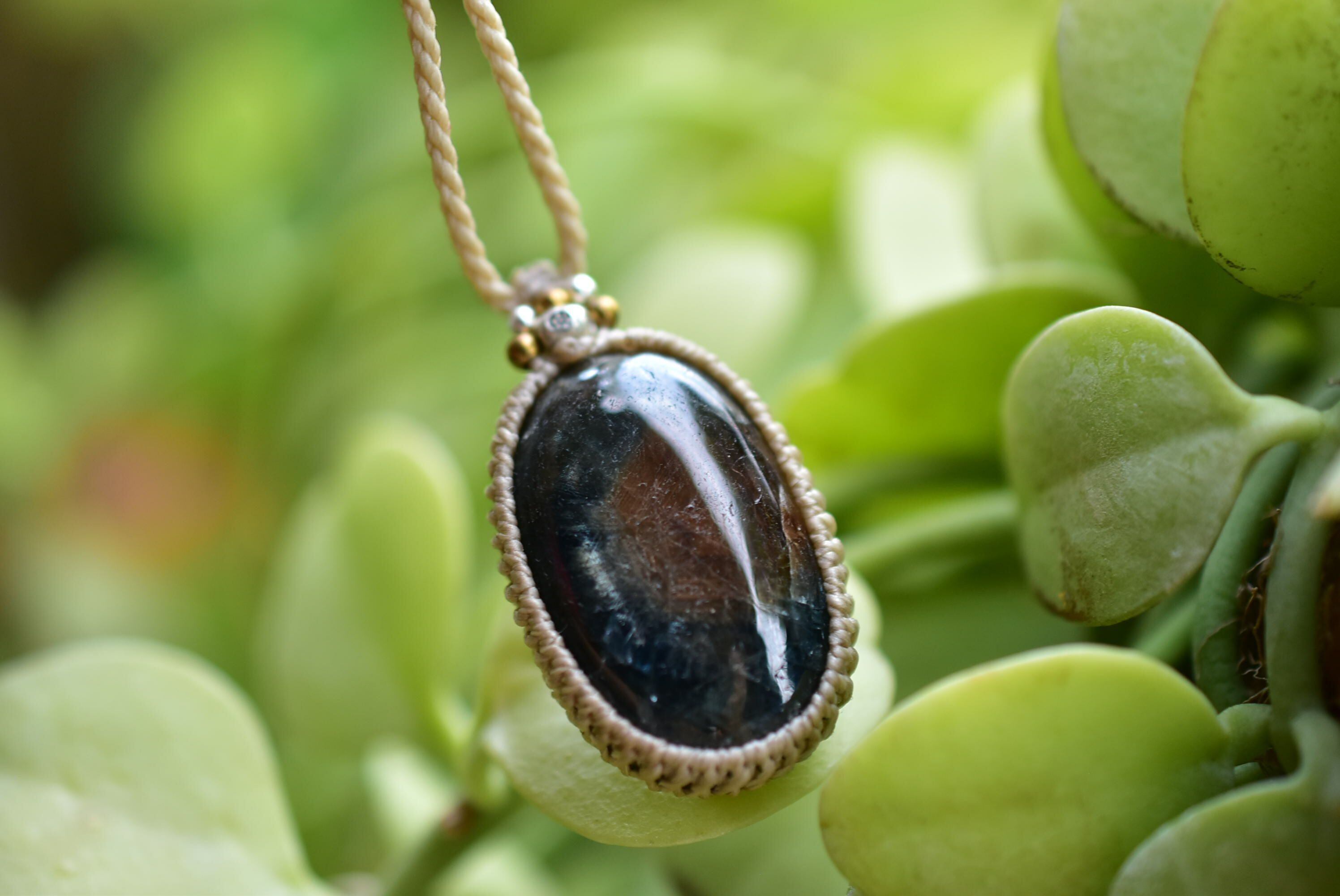 レアカラーとも言えるブラックサファイアをマクラメペンダントにして仕上げました。