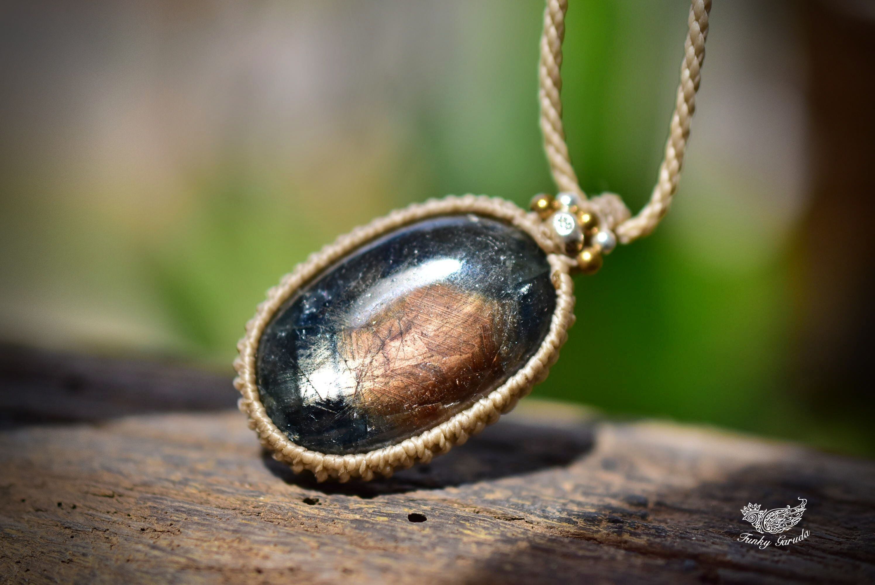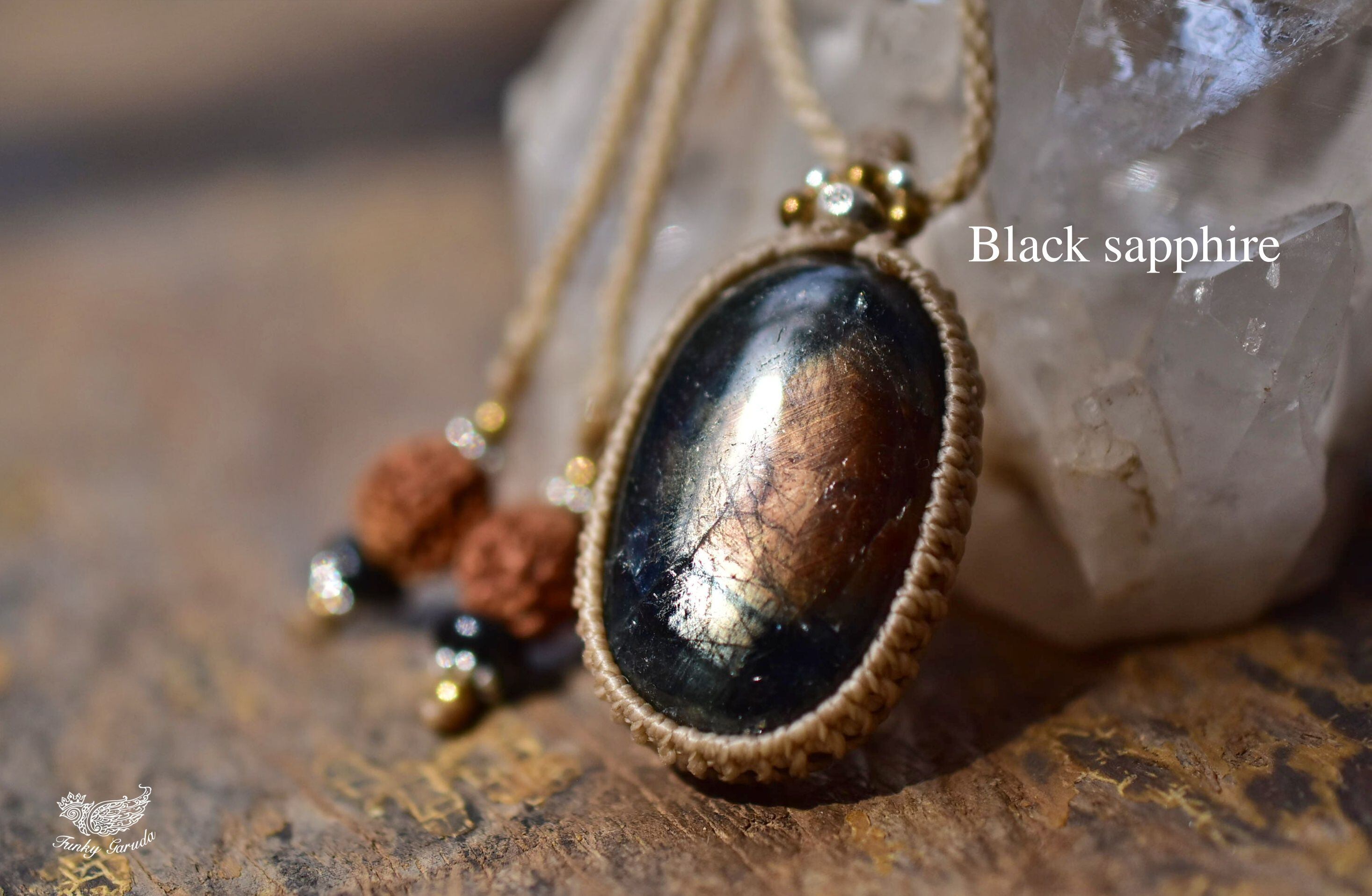 漆黒と金★ブラックサファイア マクラメペンダント safy005