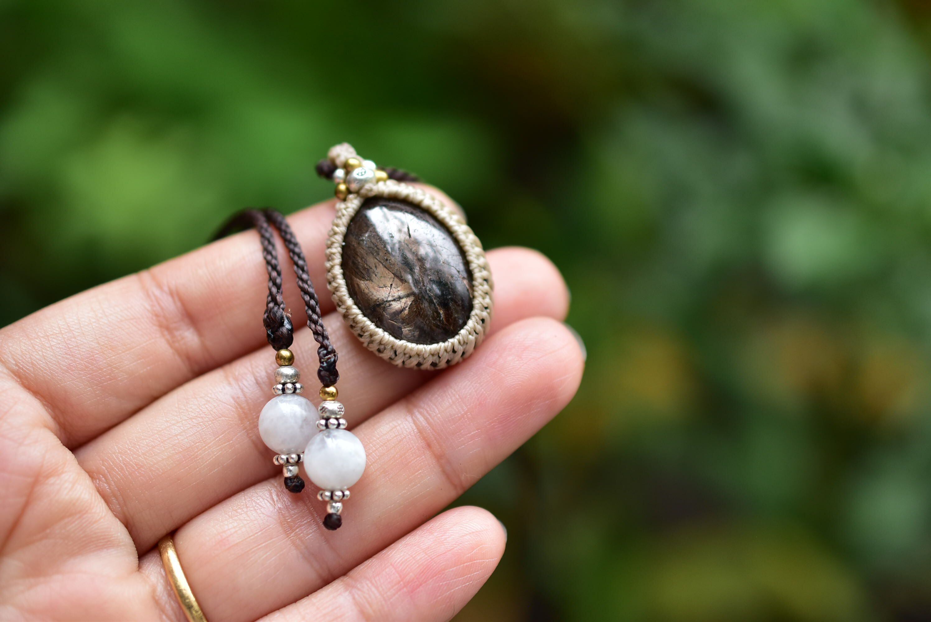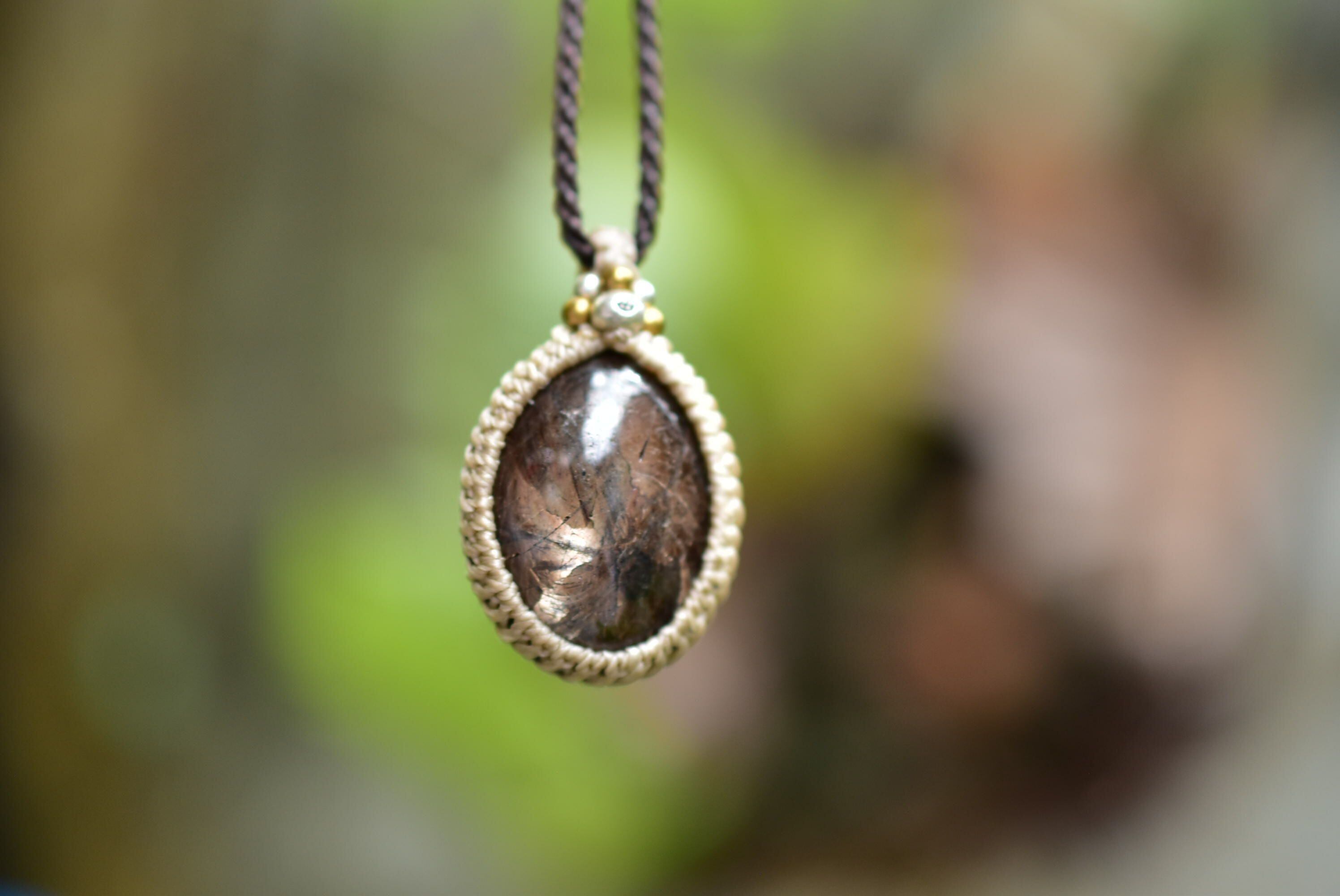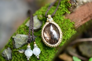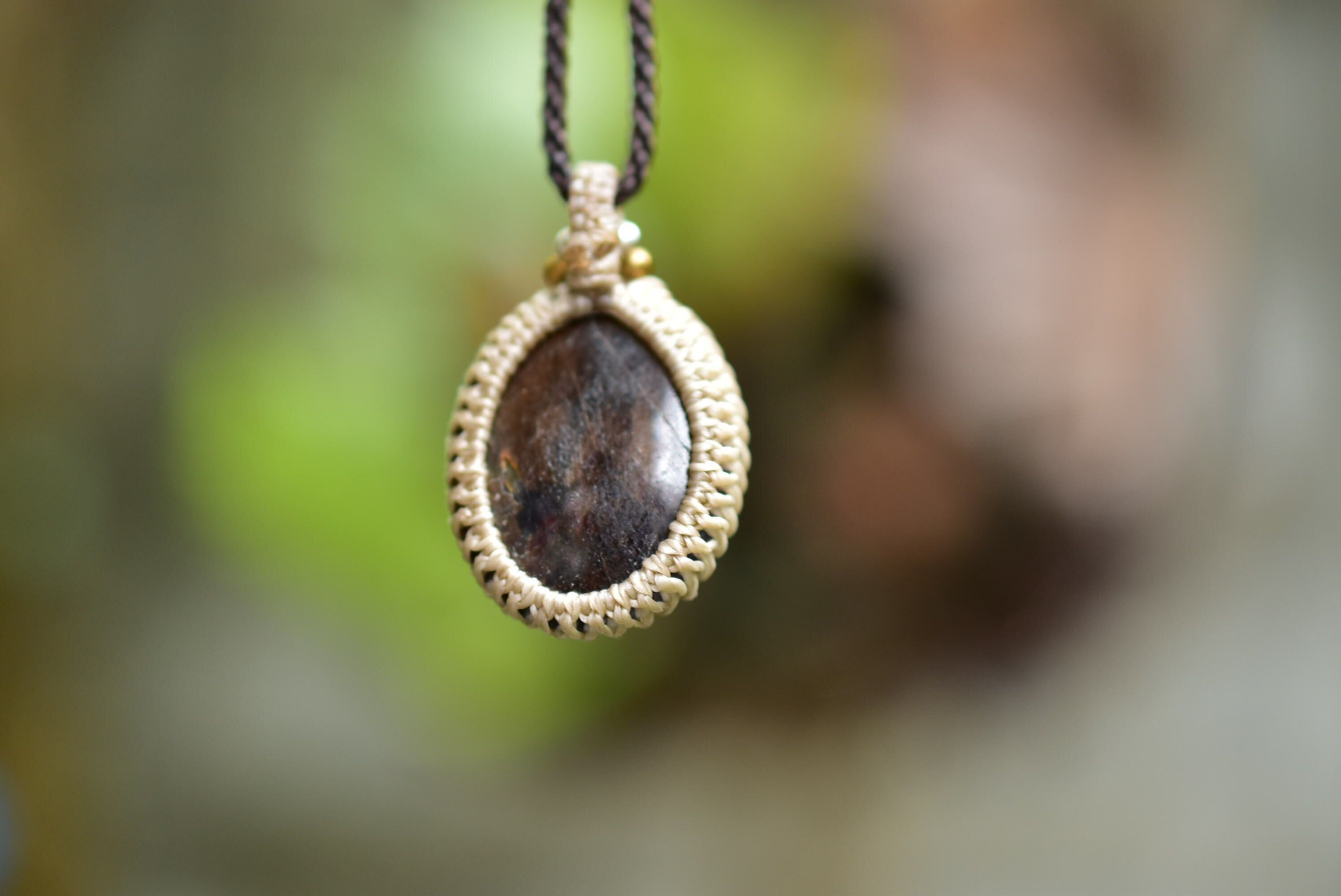 深みや渋みを感じるブラックサファイアを、マクラメペンダントにして仕上げました。