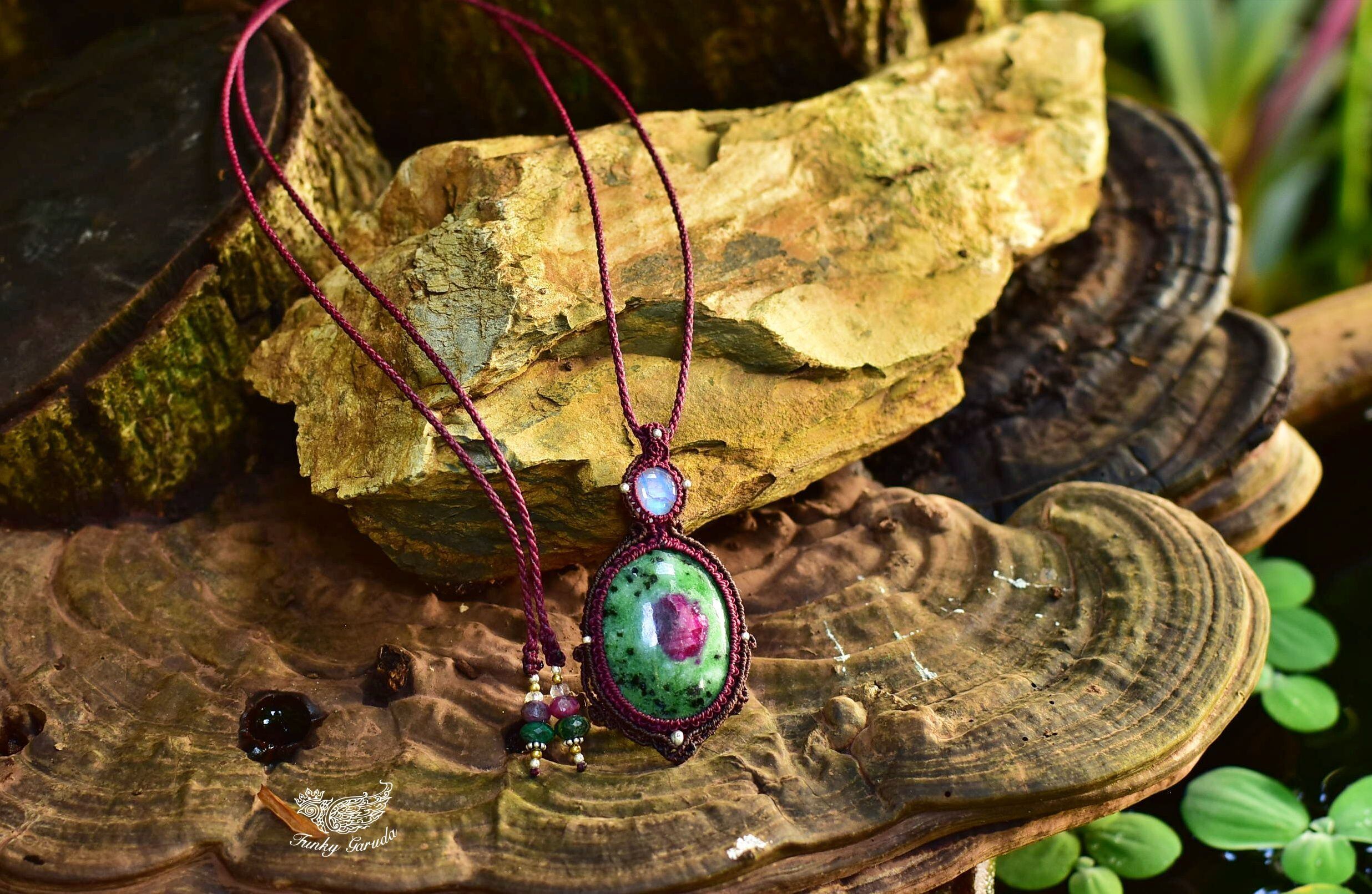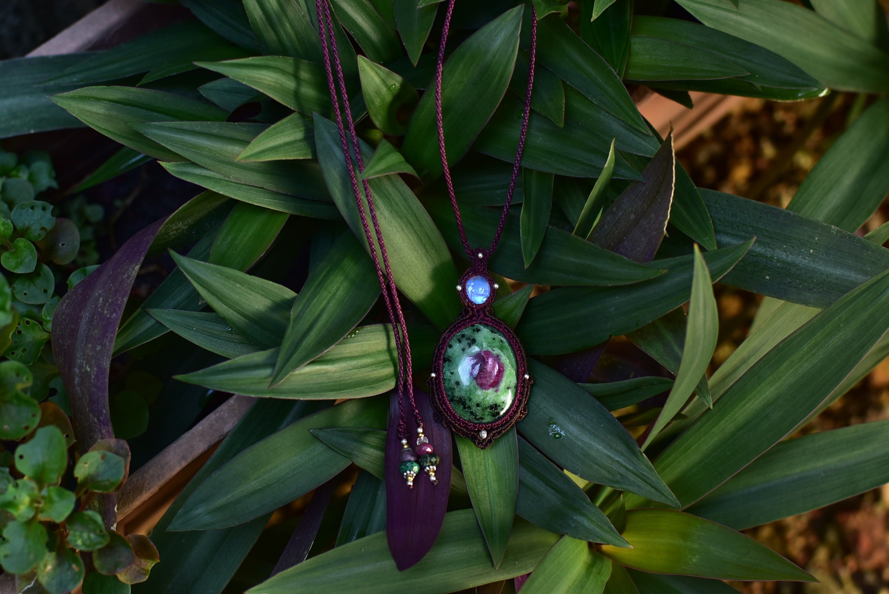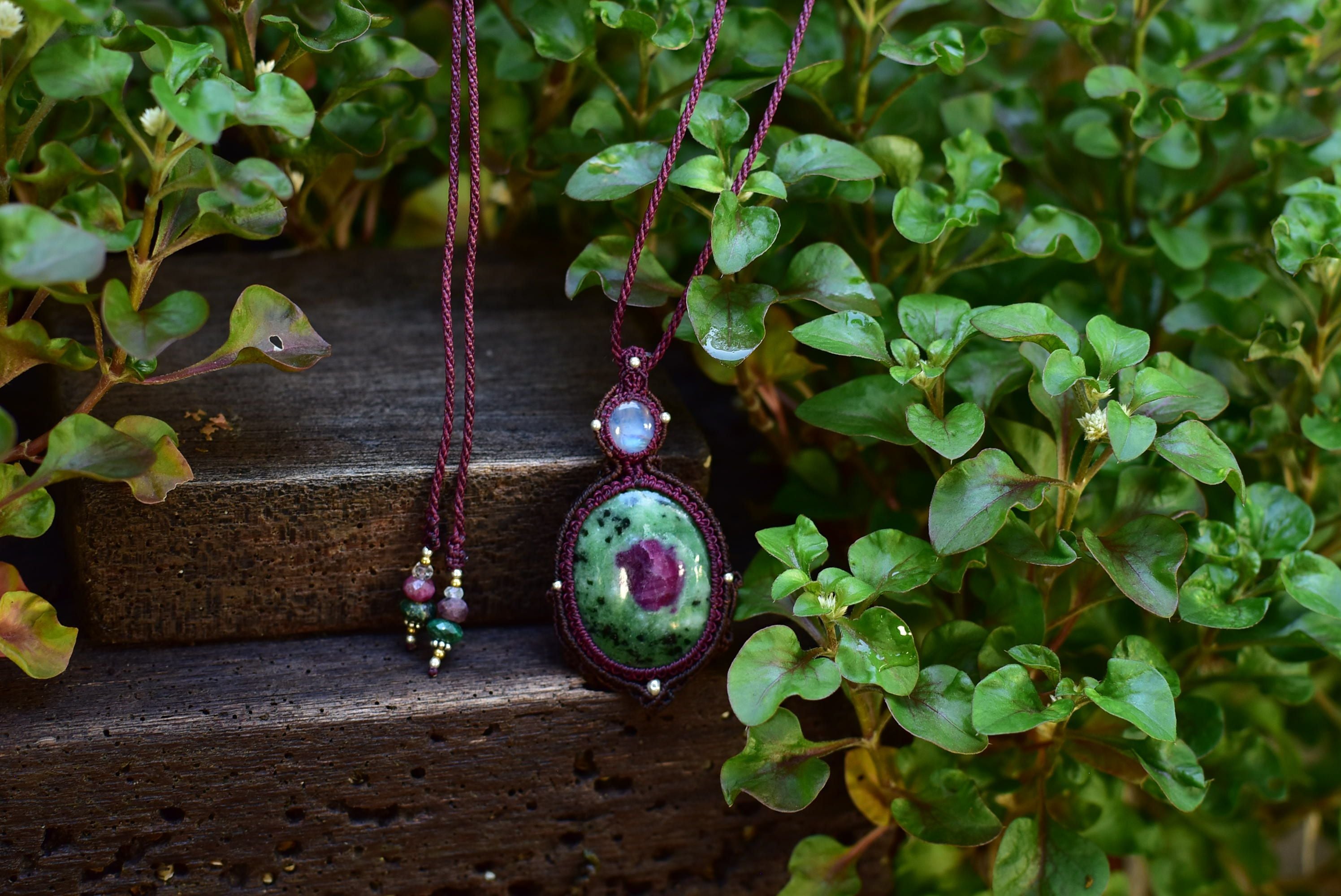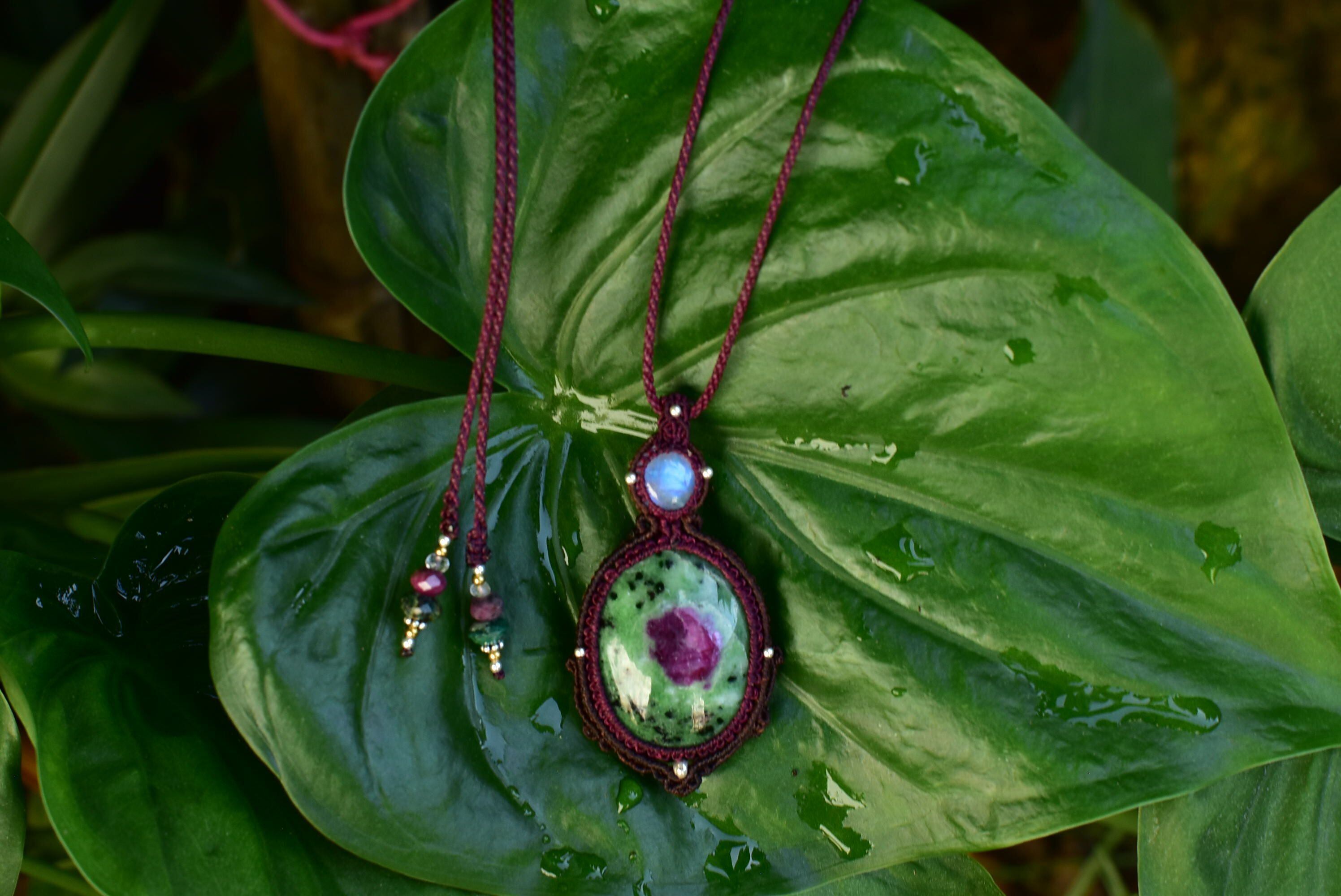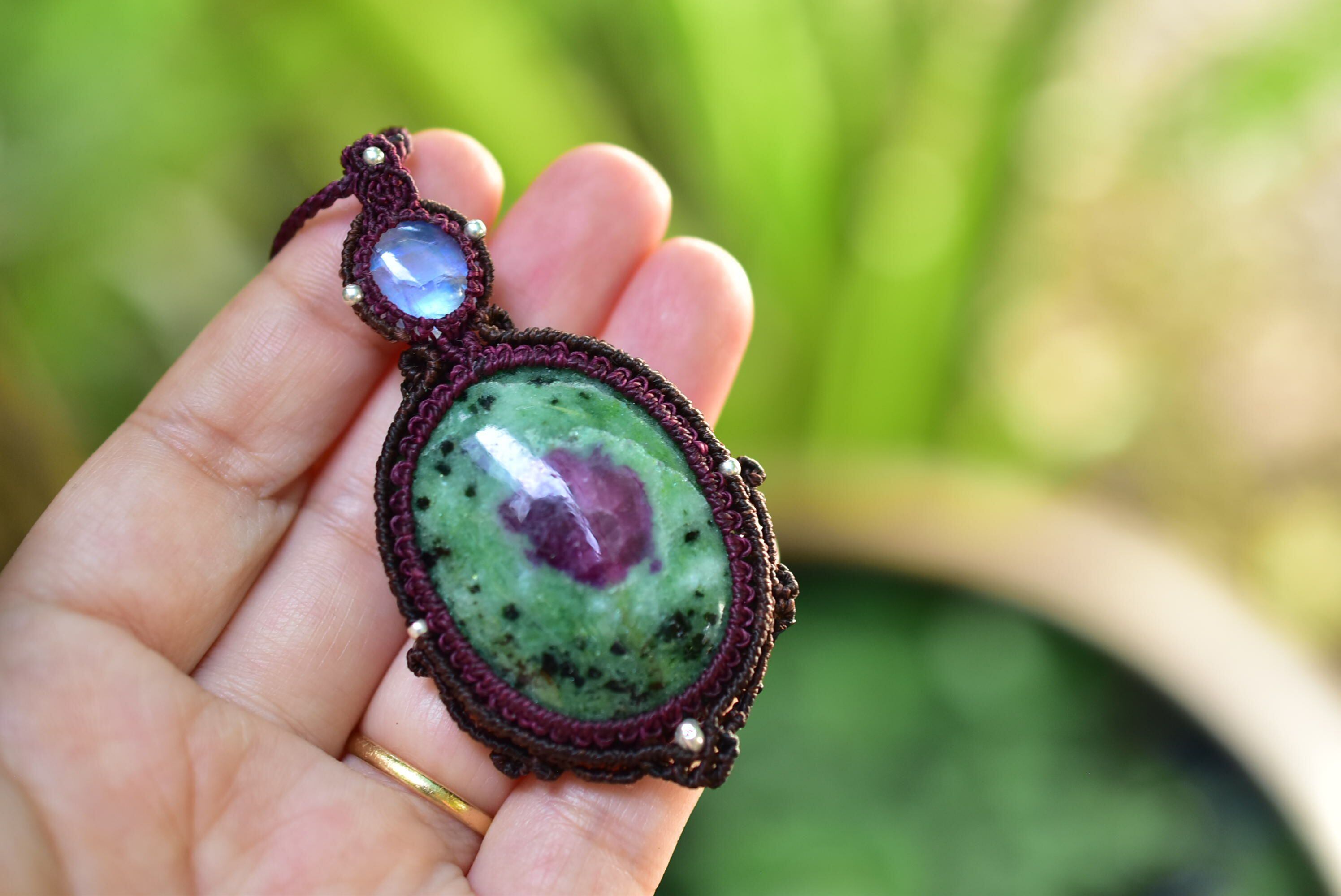 月と森林の宝石★ムーンストーン ルビーインゾイサイト マクラメペンダントrubz002