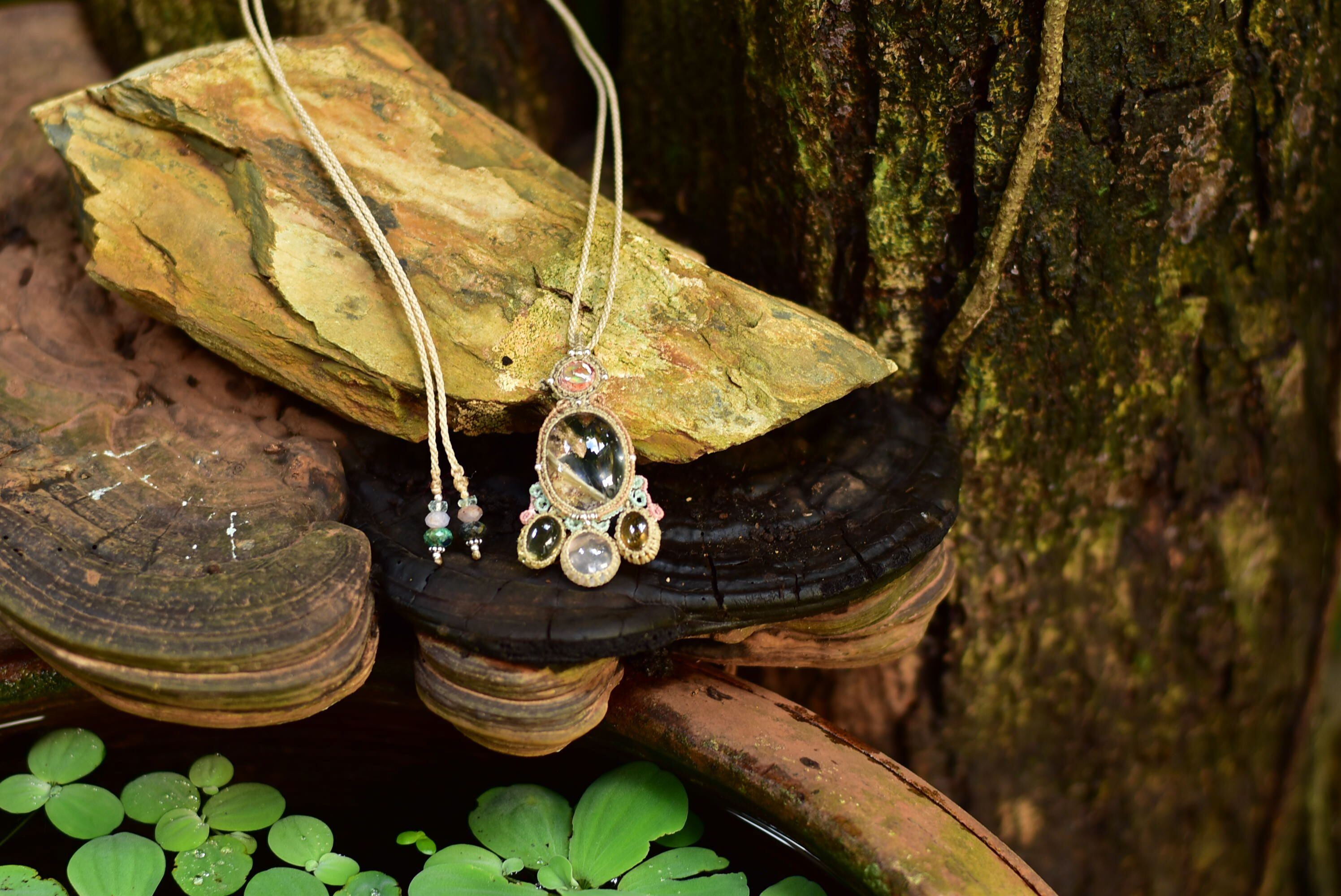 石の間を自由に動き、自然植物の動きを意識してマクラメ編み装飾を施しています。