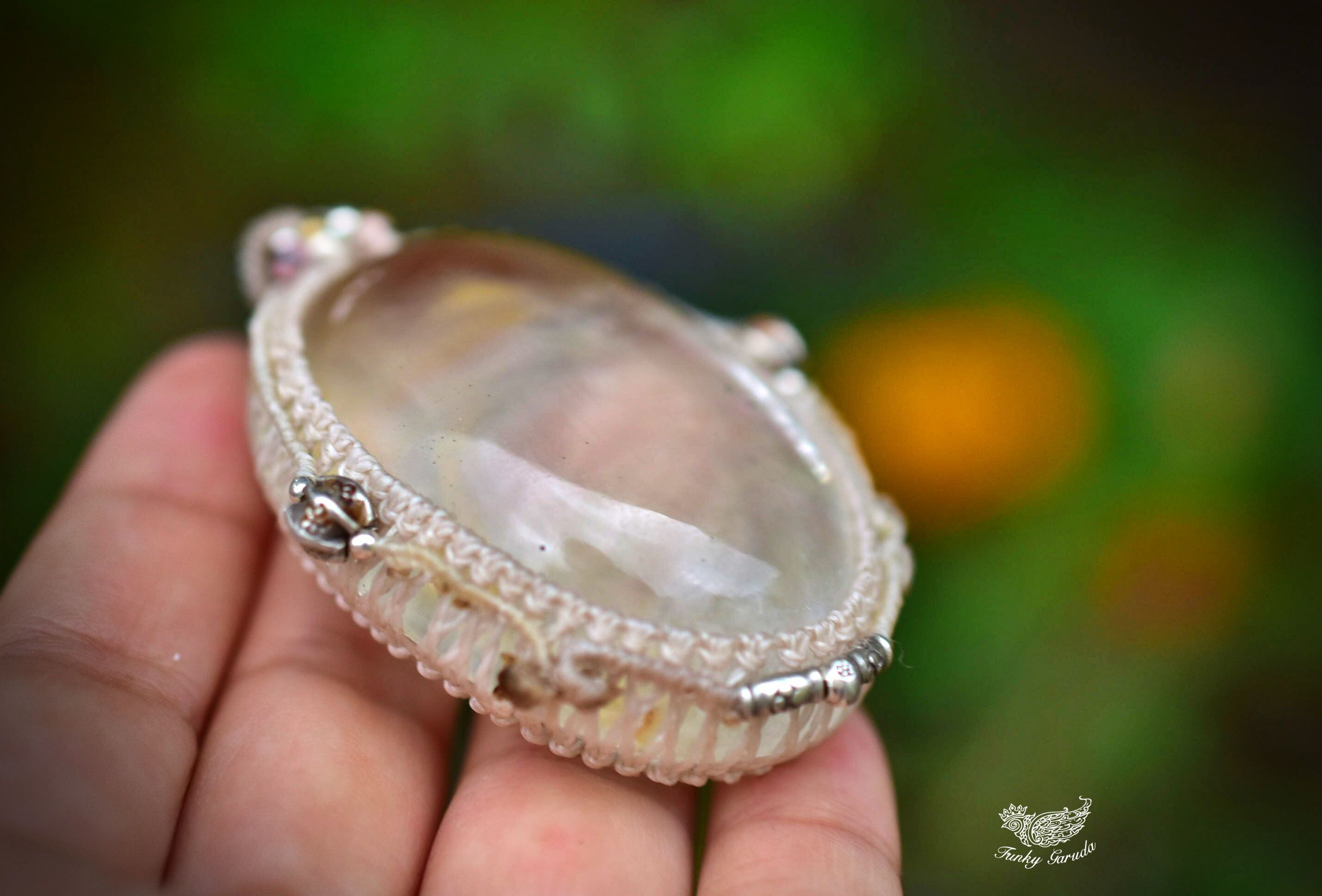◆このたびはナチュラルホワイト色の蝋引き糸を使用しマクラメ編み装飾を施しました。