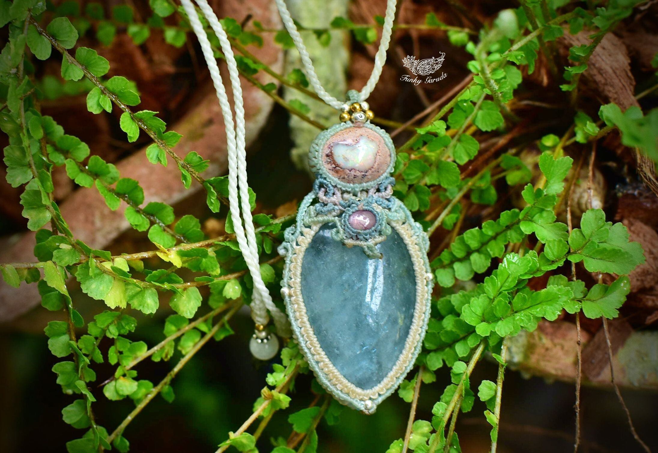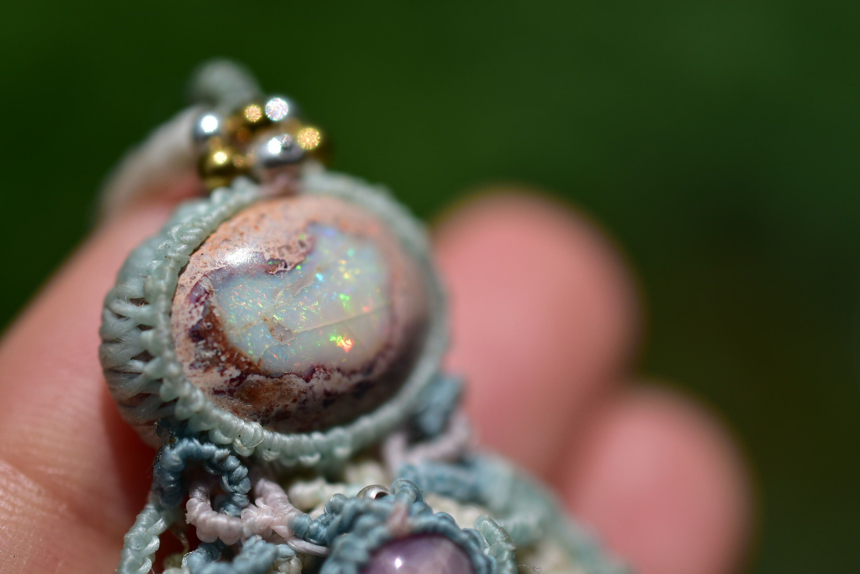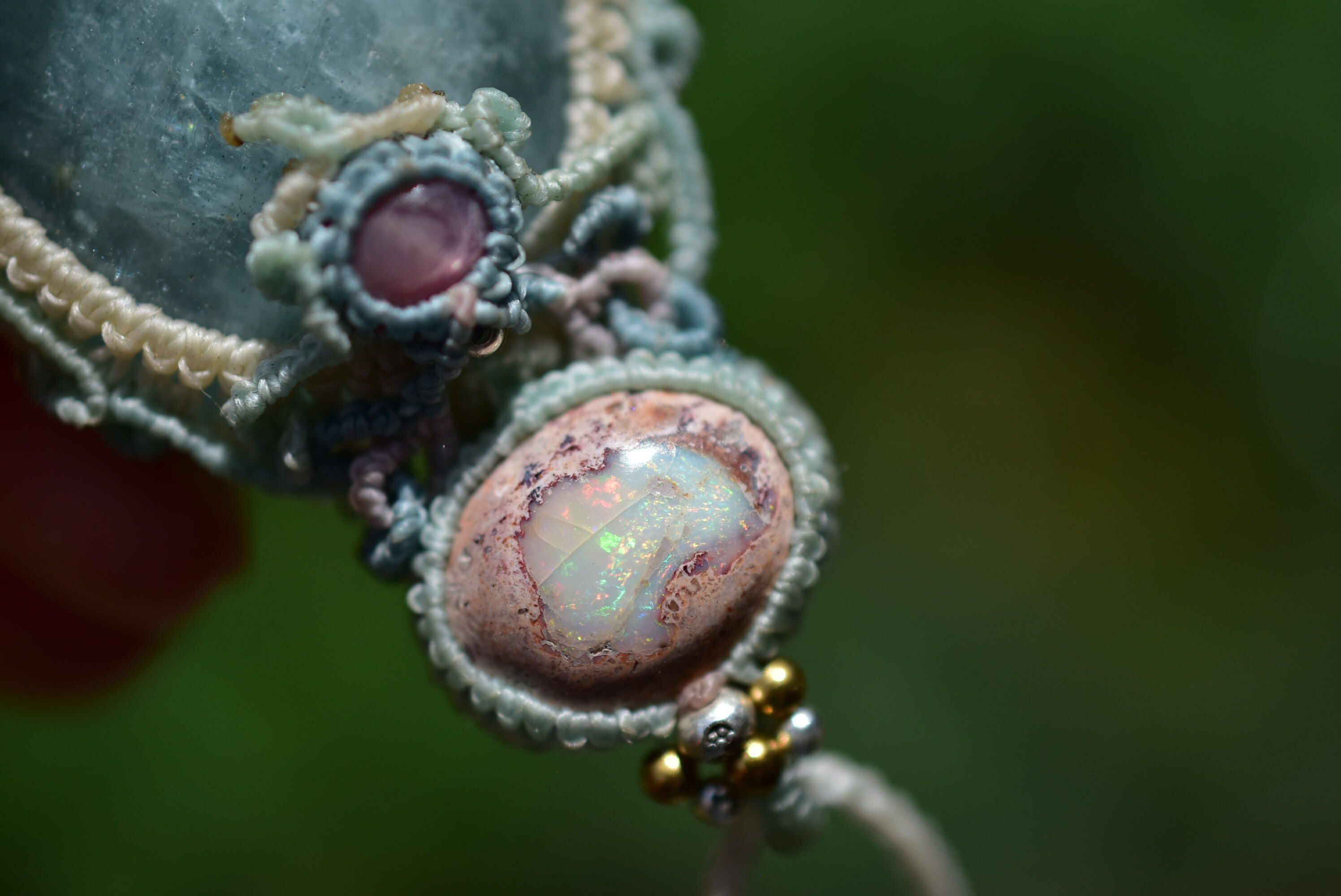 水とプリズムの花★カンテラオパール アクアマリン スタールビー マクラメペンダント opal024
