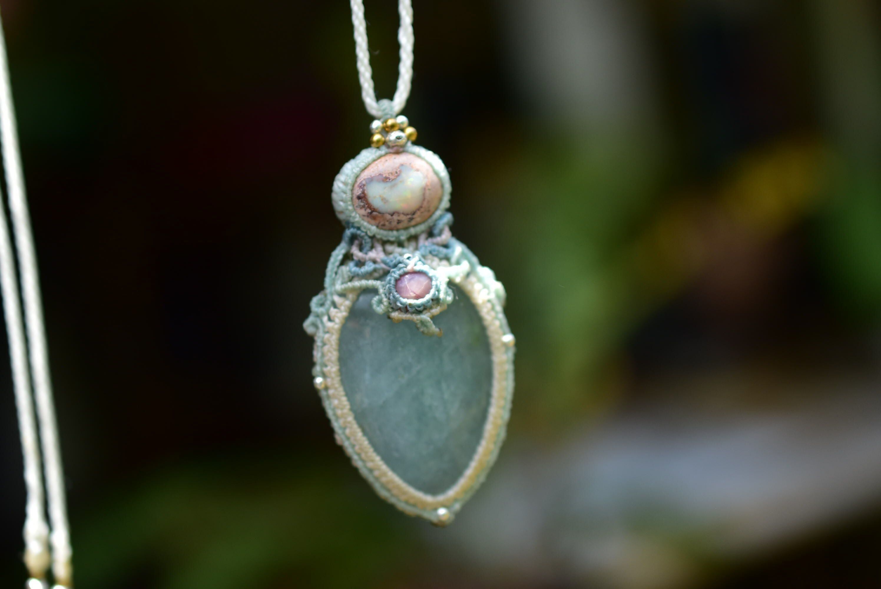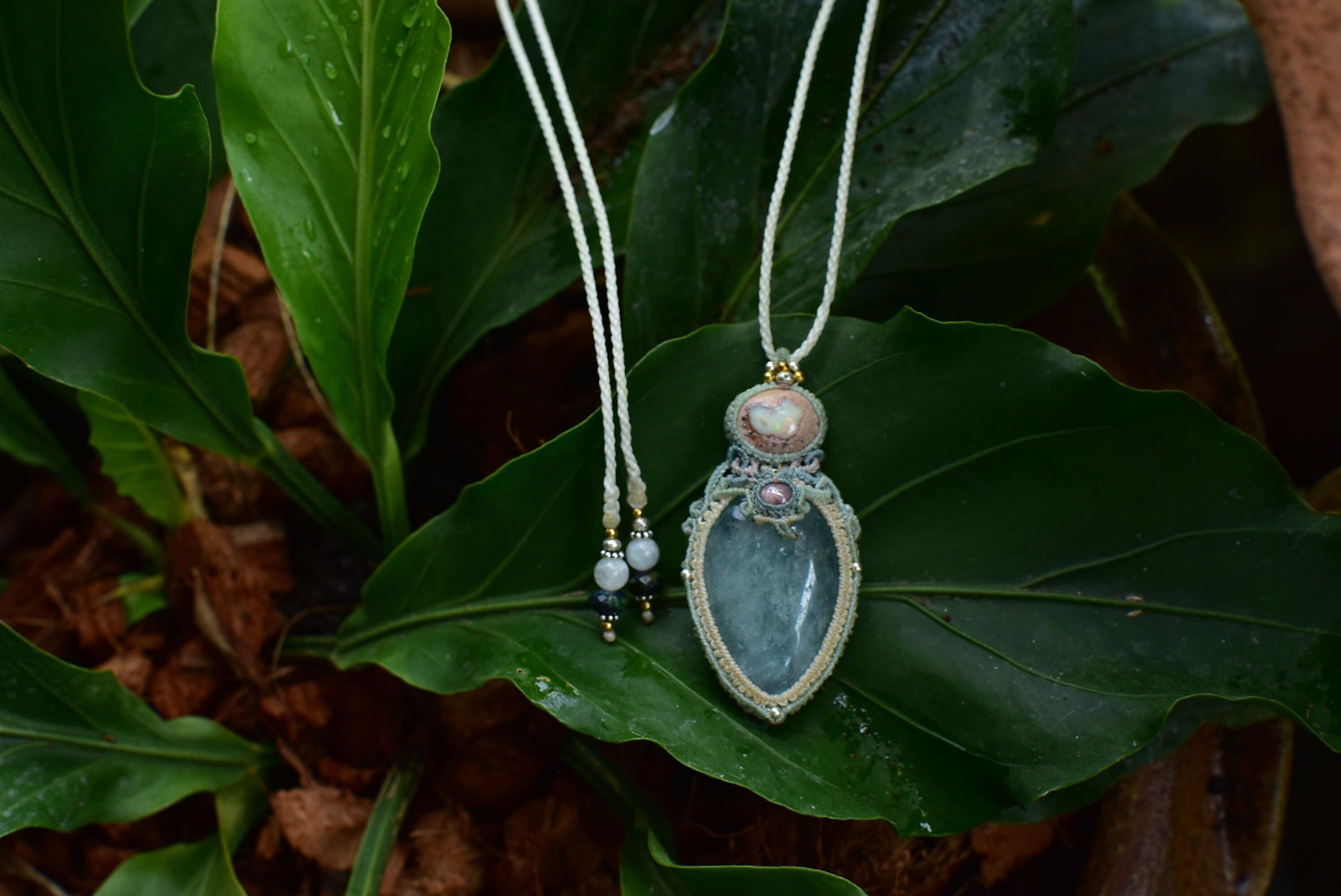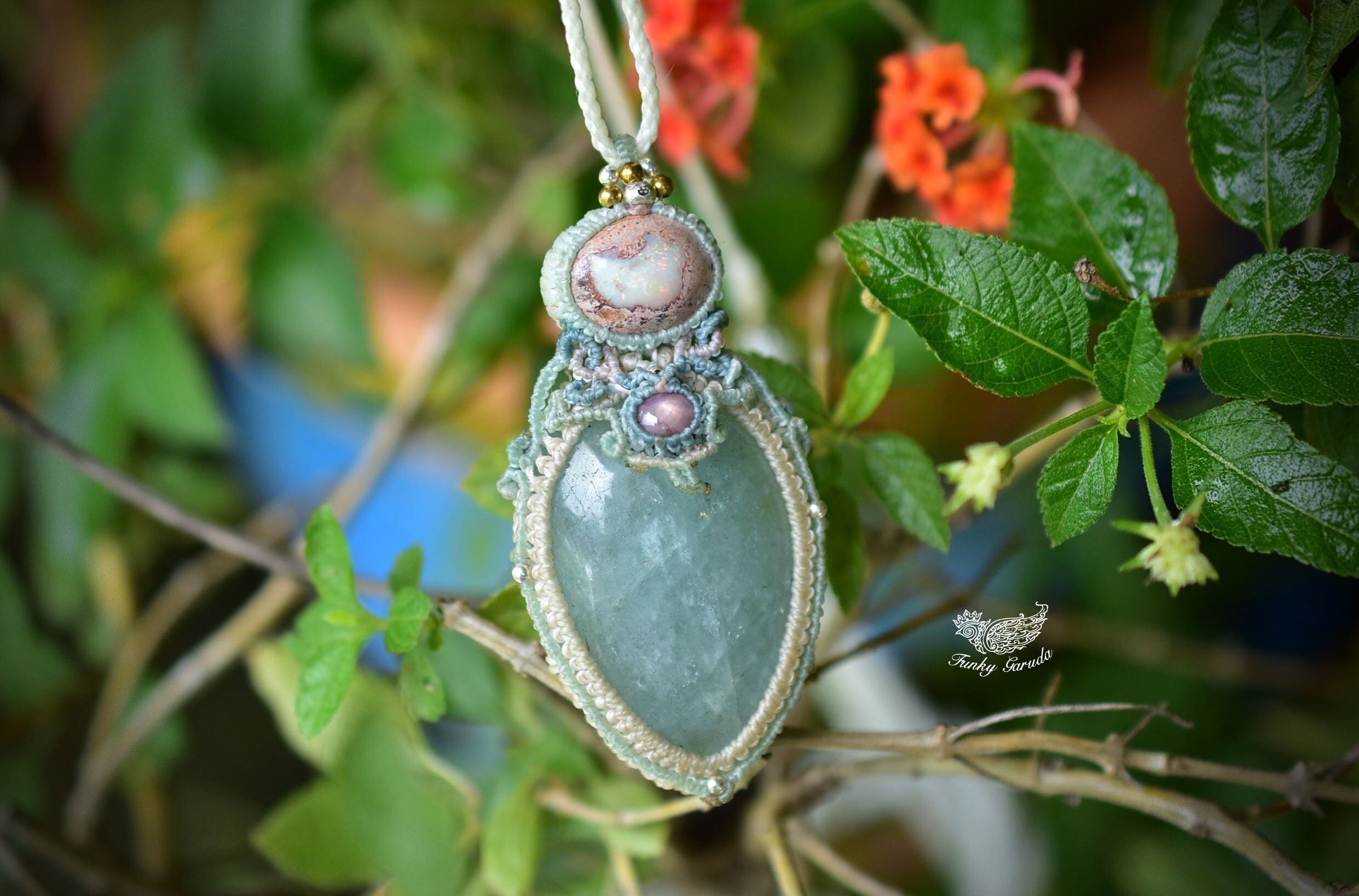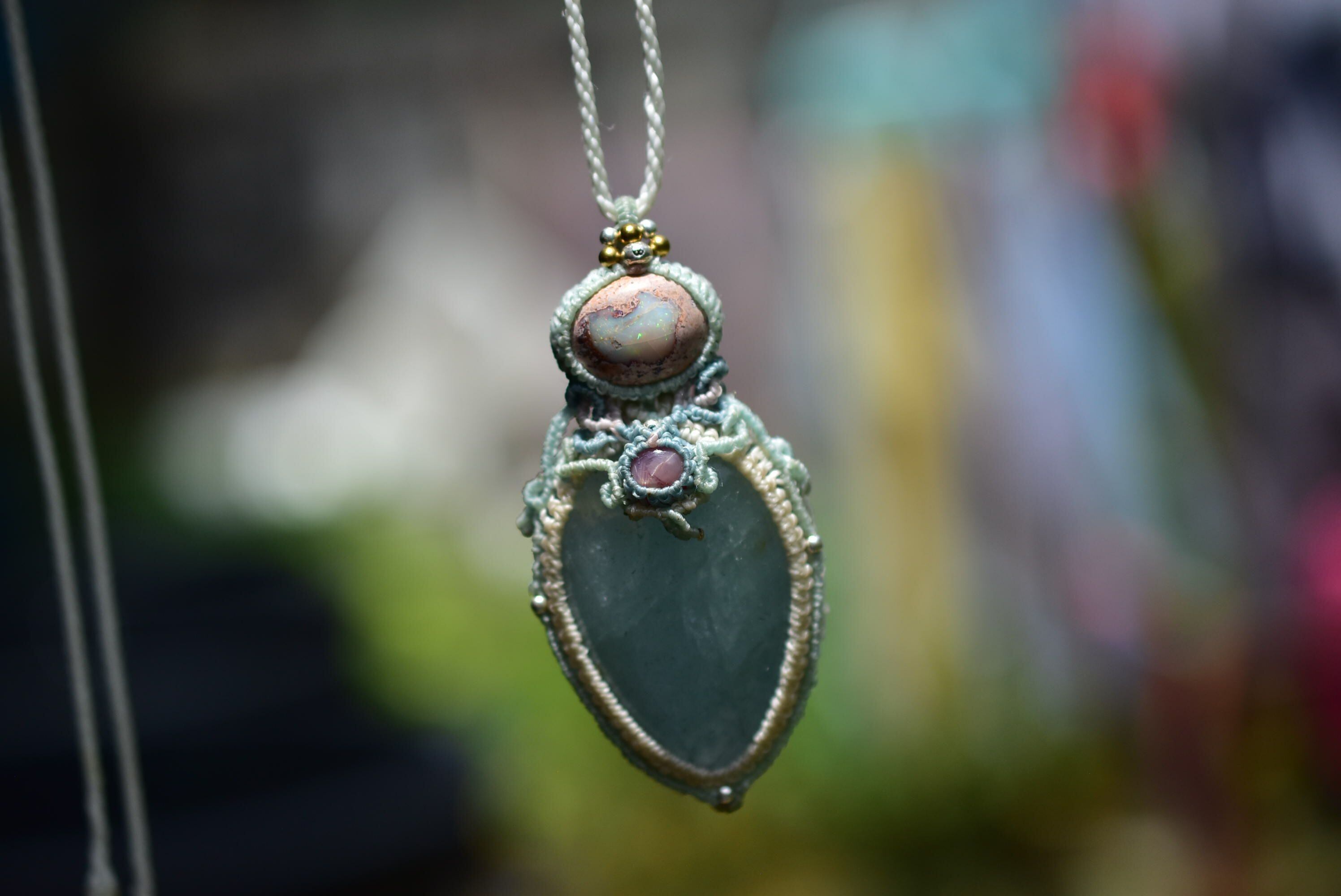 水とプリズムの花★カンテラオパール アクアマリン スタールビー マクラメペンダント opal024