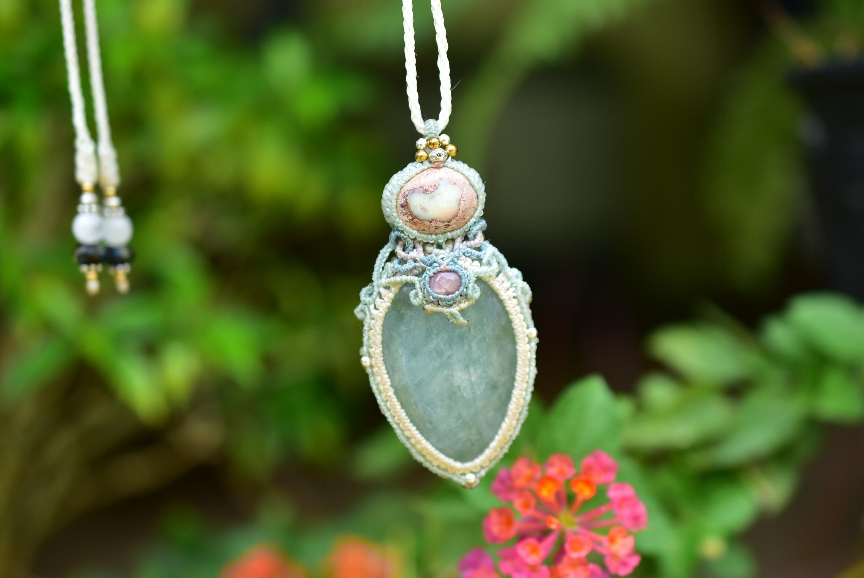 ◆このたびはホワイト、ミント、ブルー色の蝋引き糸を使用しマクラメ編み装飾を施しました。