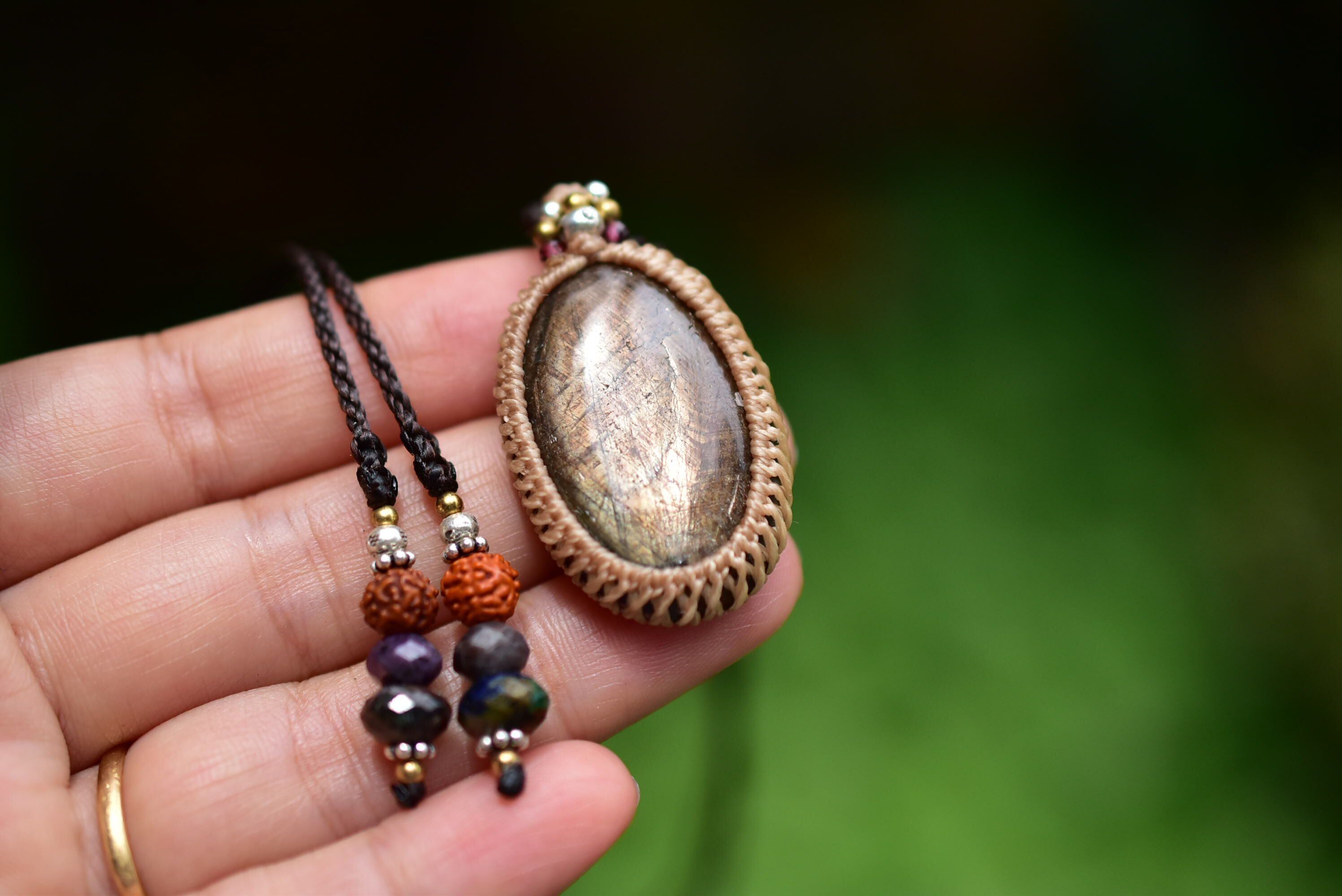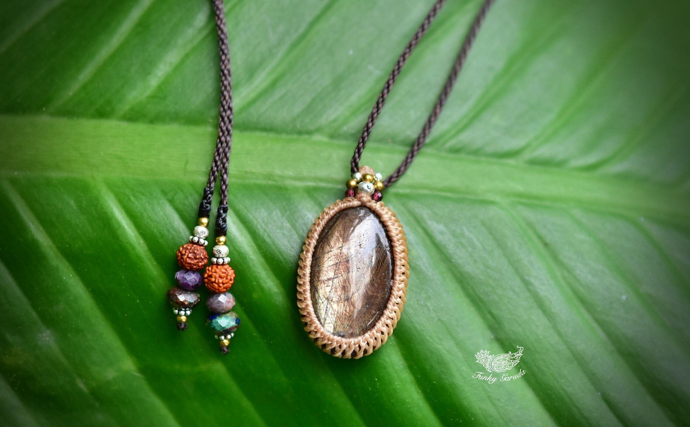 明るいゴールドシラーが印象的なサファイアを、シンプルなマクラメペンダントに仕上げました。