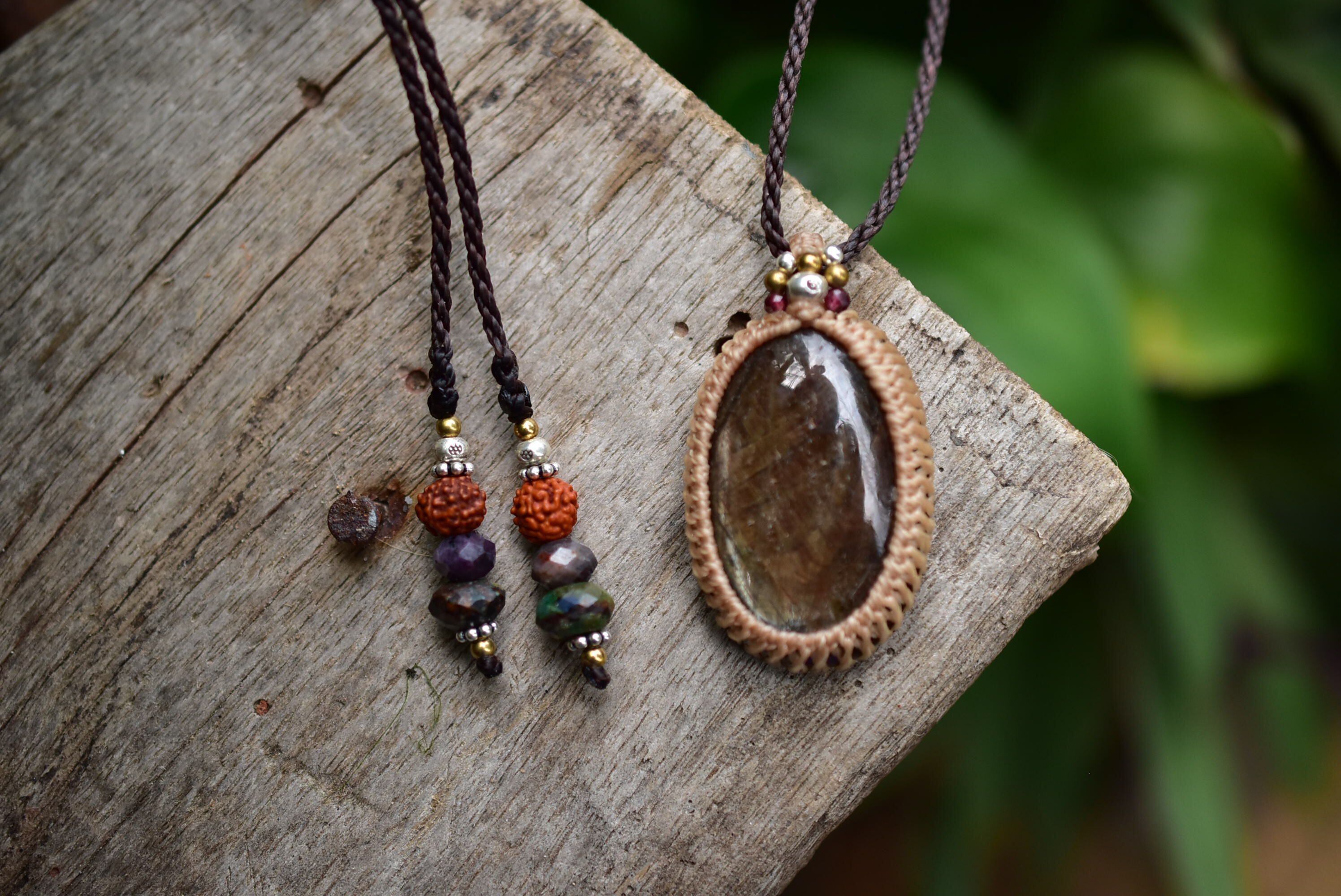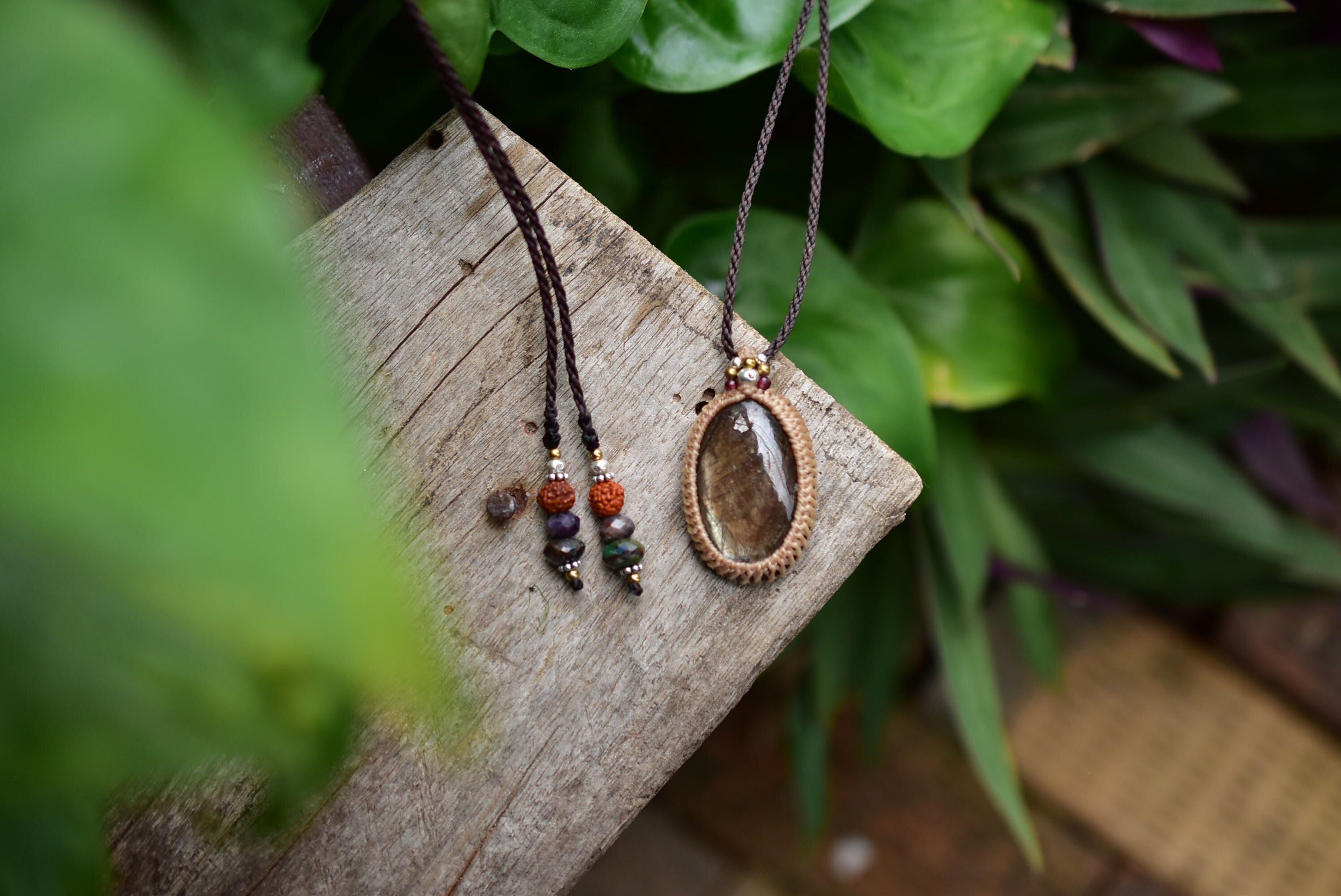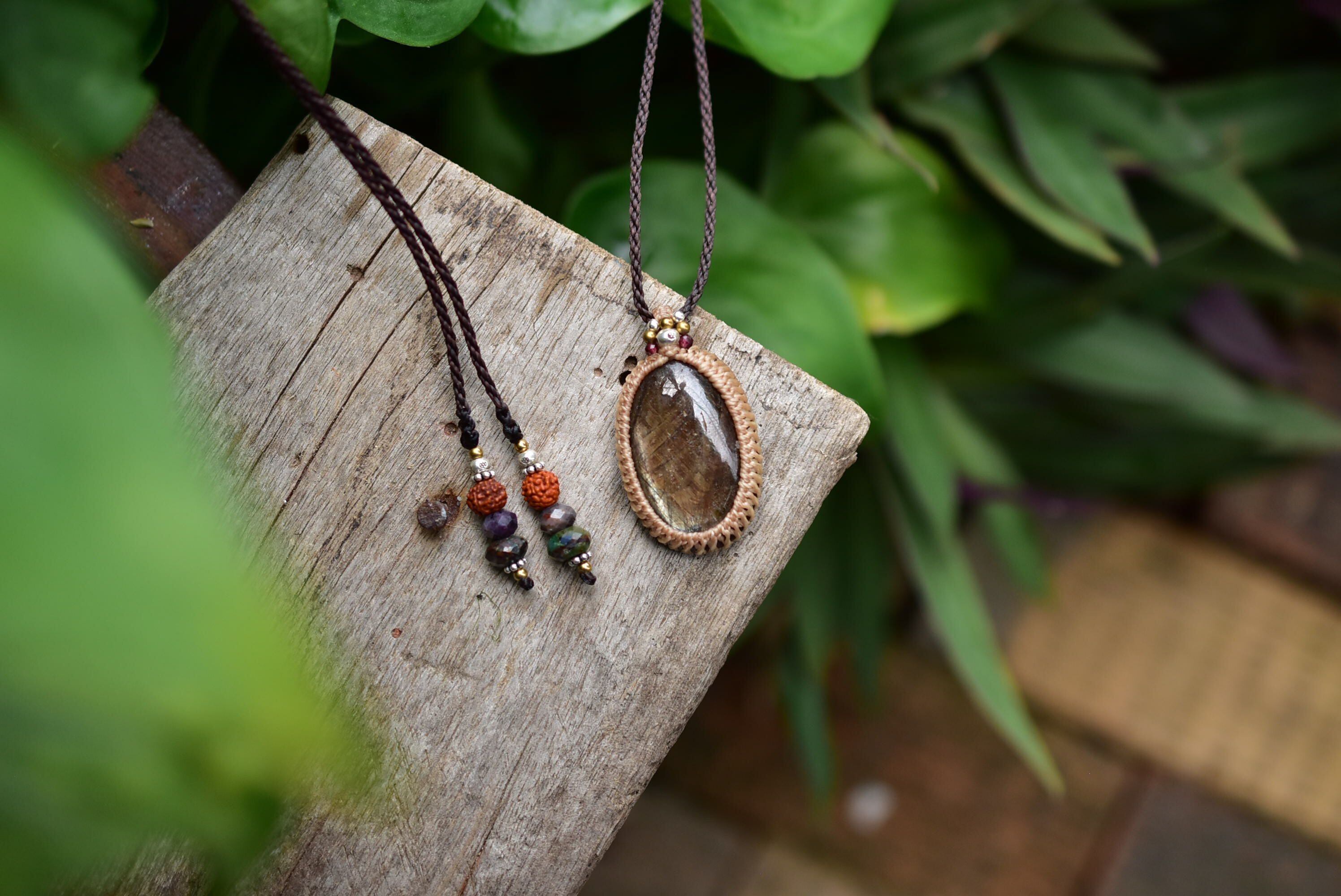 ◆このたびはキャラメル、ダークブラウン色の蝋引き糸を使用しマクラメ編み装飾を施しました。