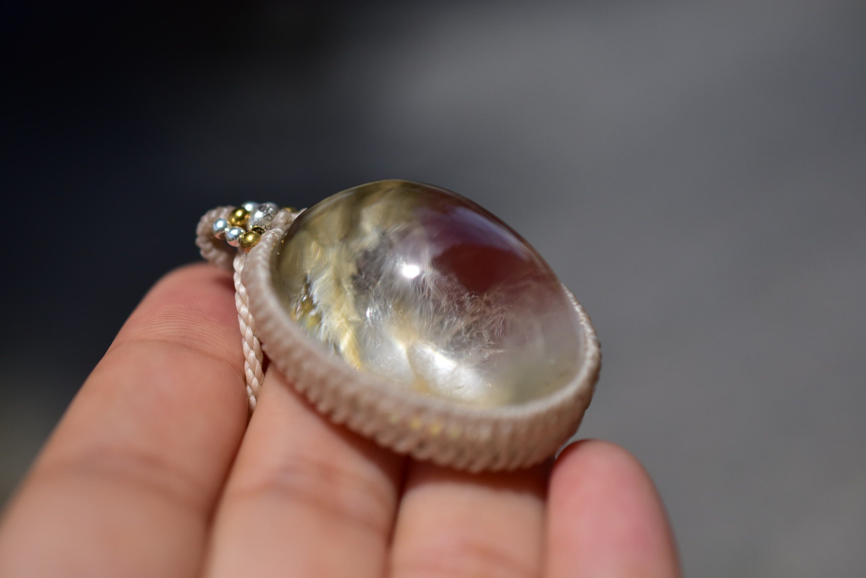 ◆このたびはナチュラルホワイト色の蝋引き糸を使用しマクラメ編み装飾を施しました。