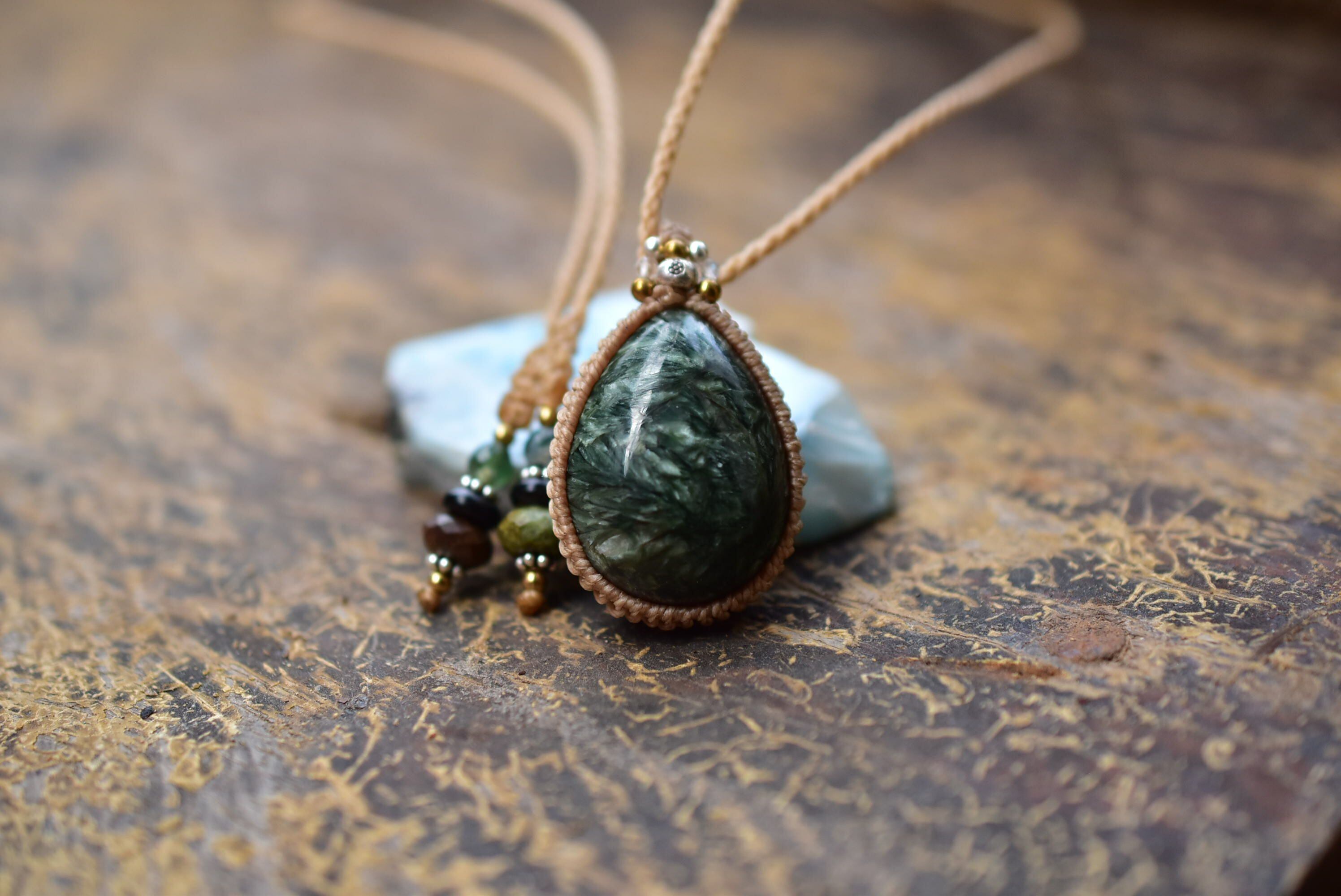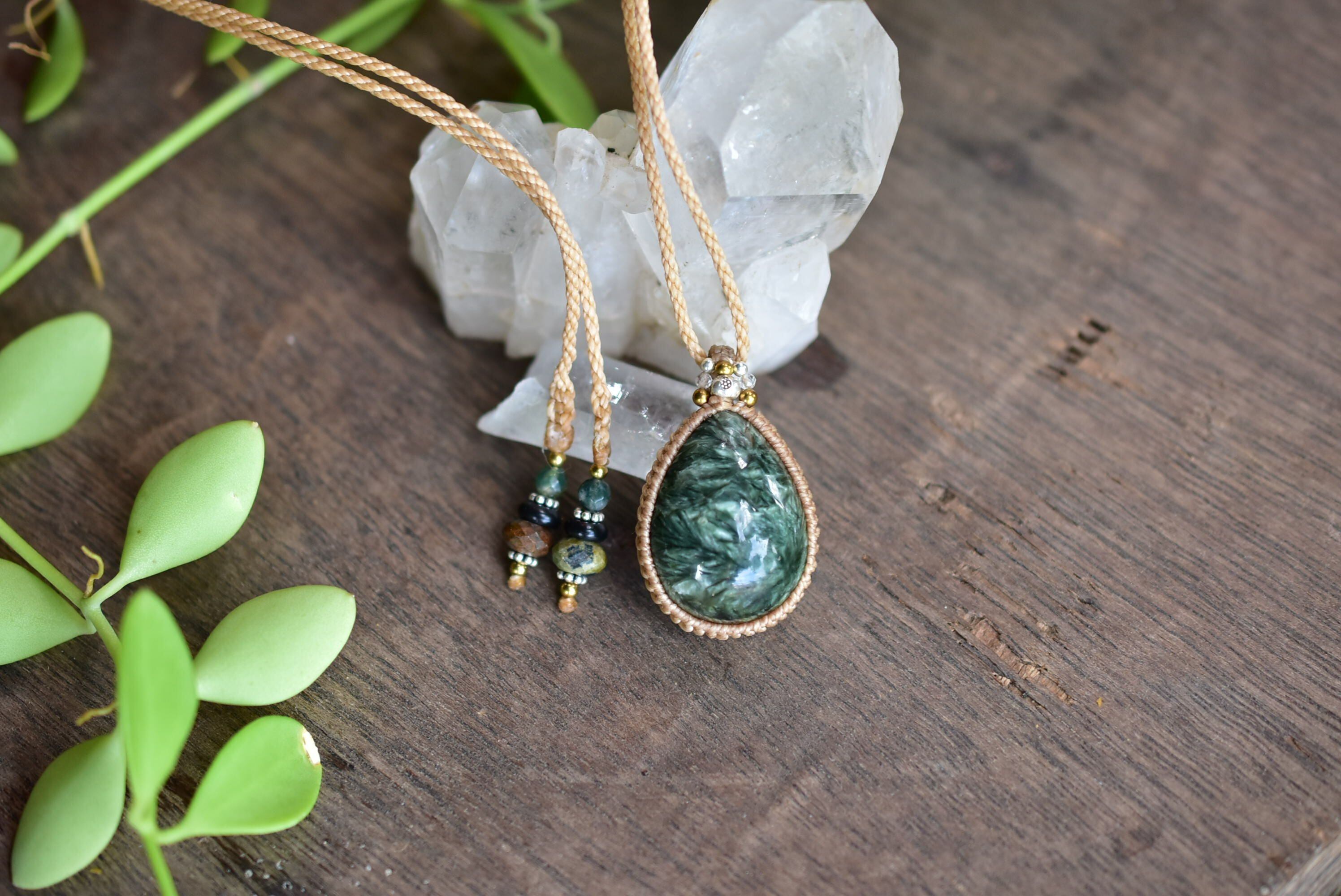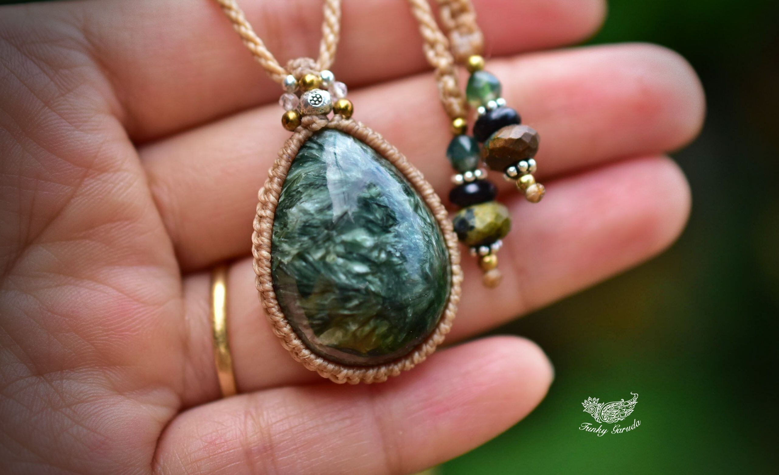 グリーンフェザー★セラフィナイト マクラメペンダント sery004