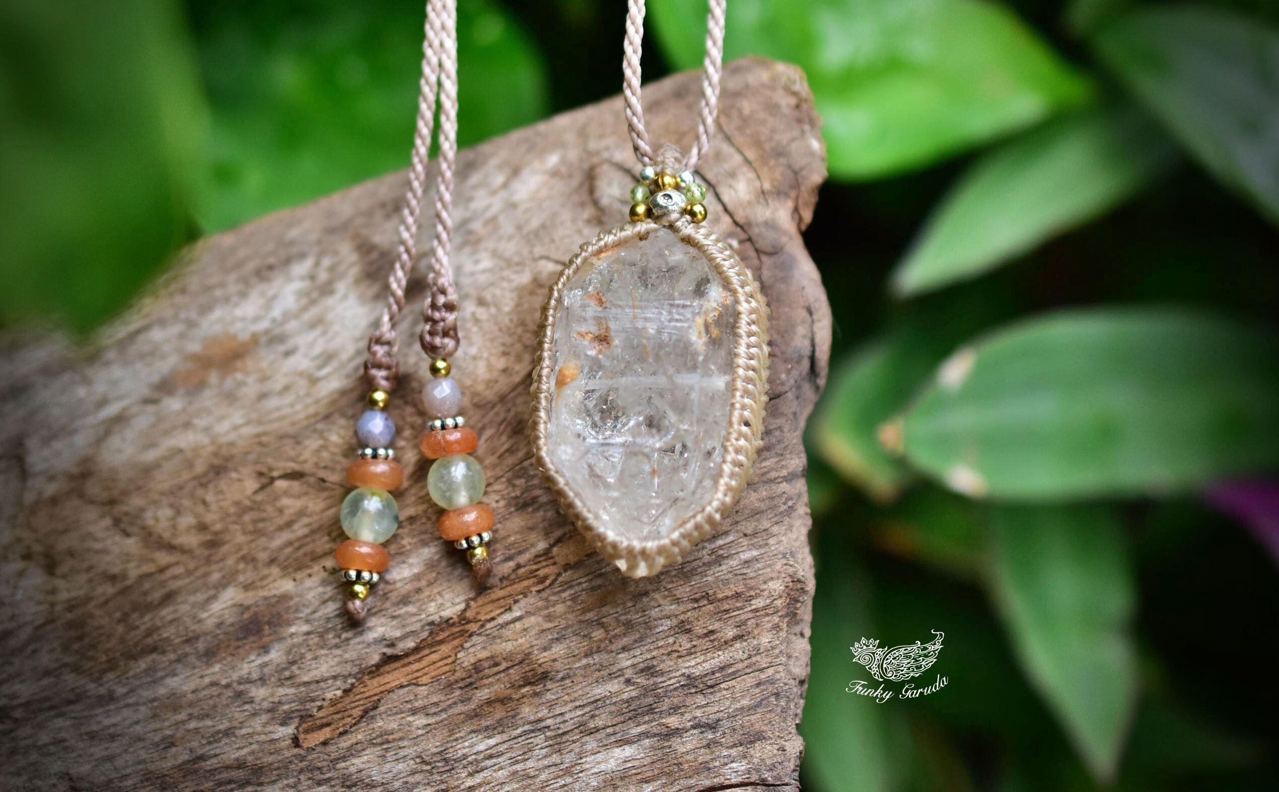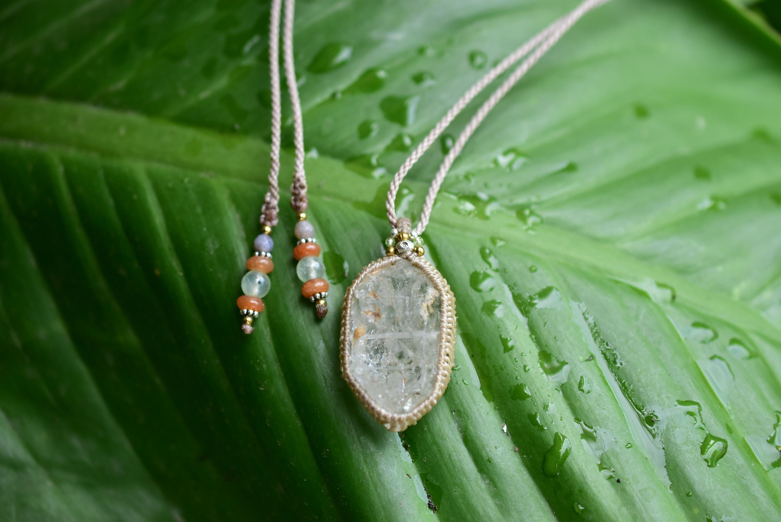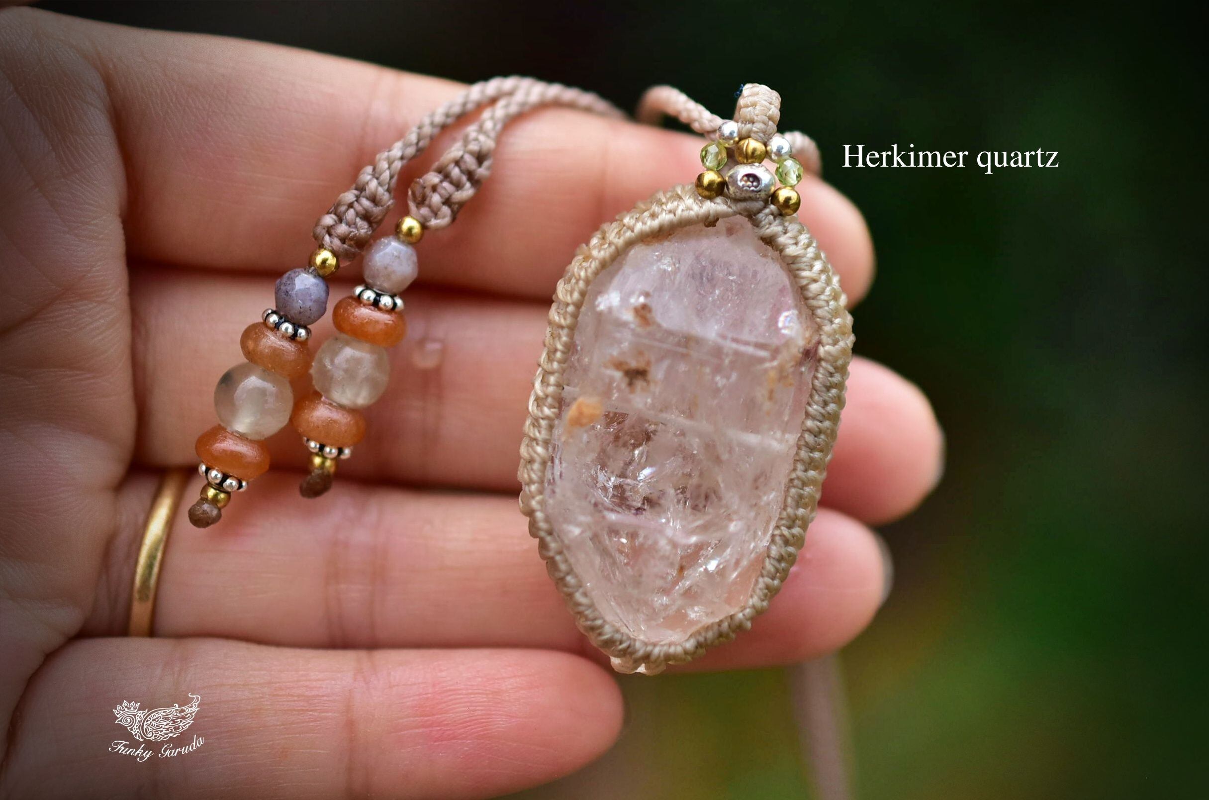 煌めく世界★虹入り★ハーキマー水晶 原石 マクラメペンダントhky003