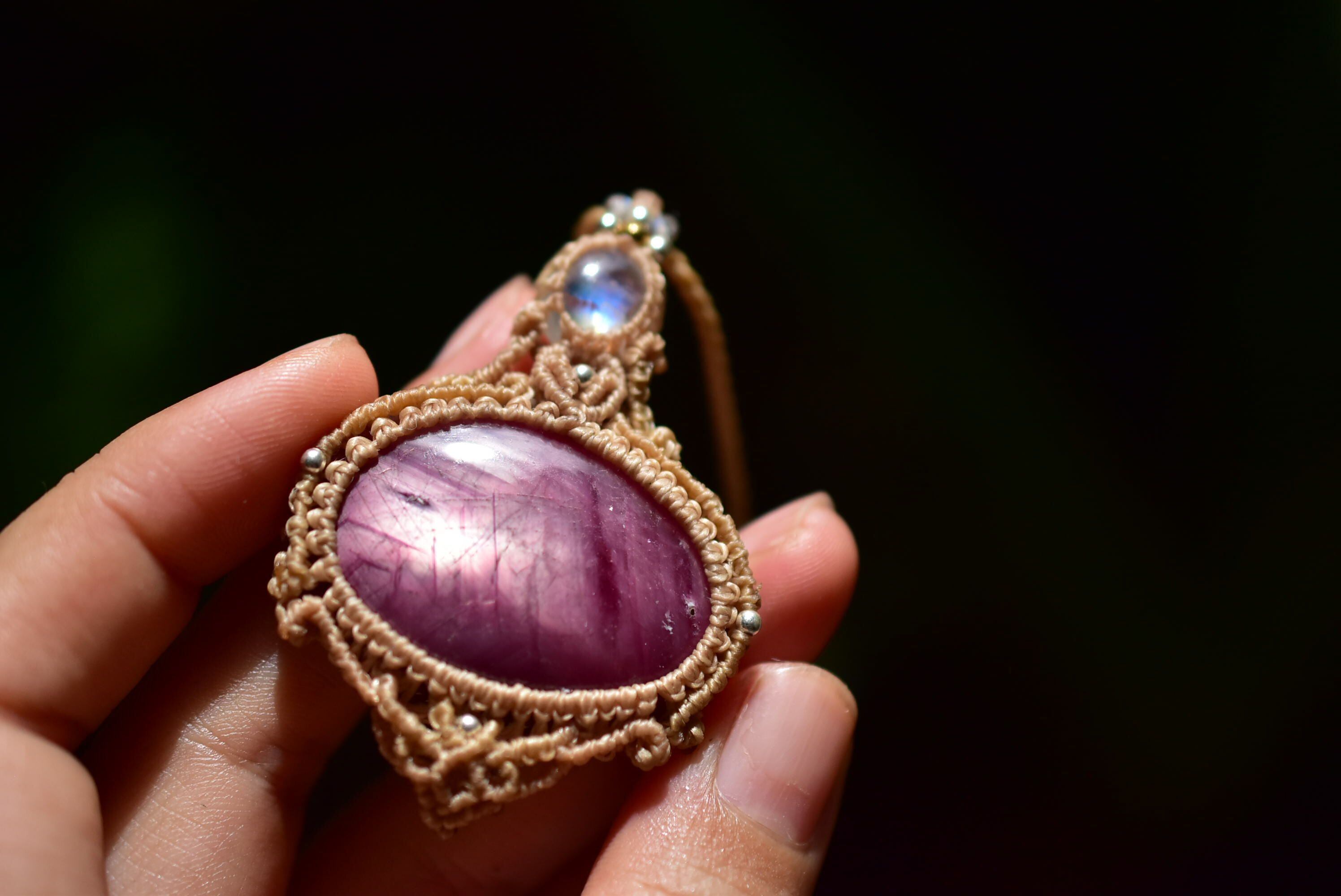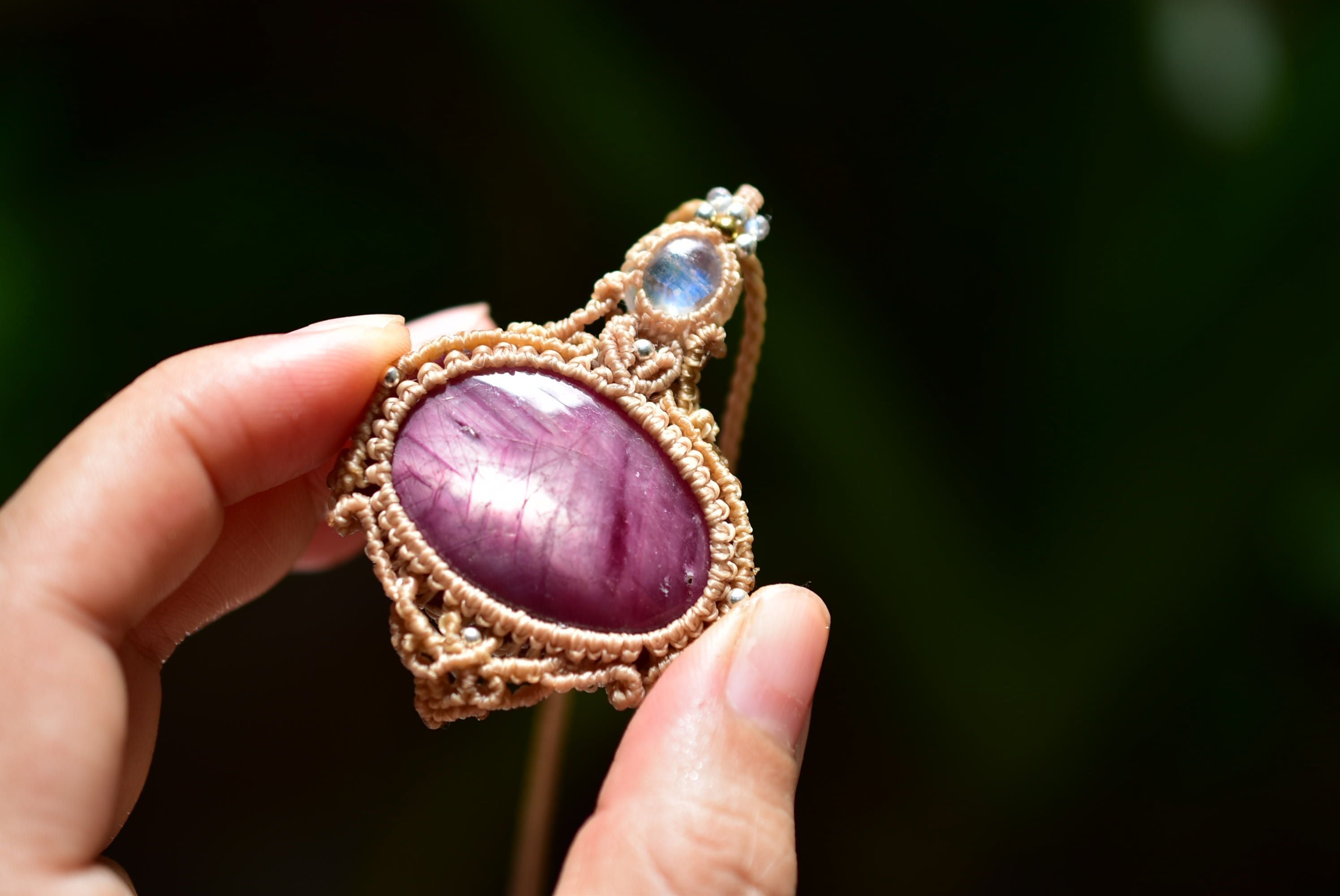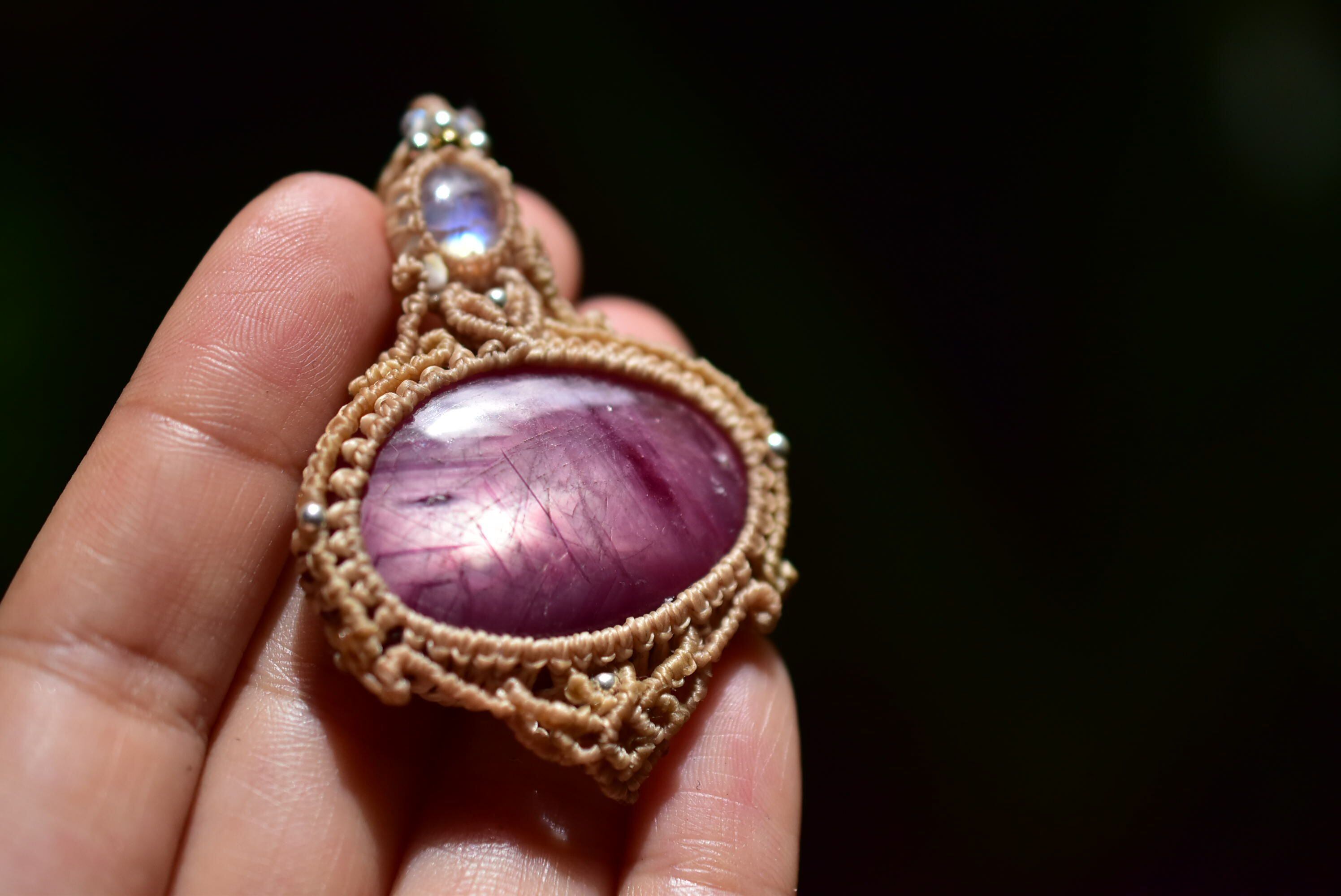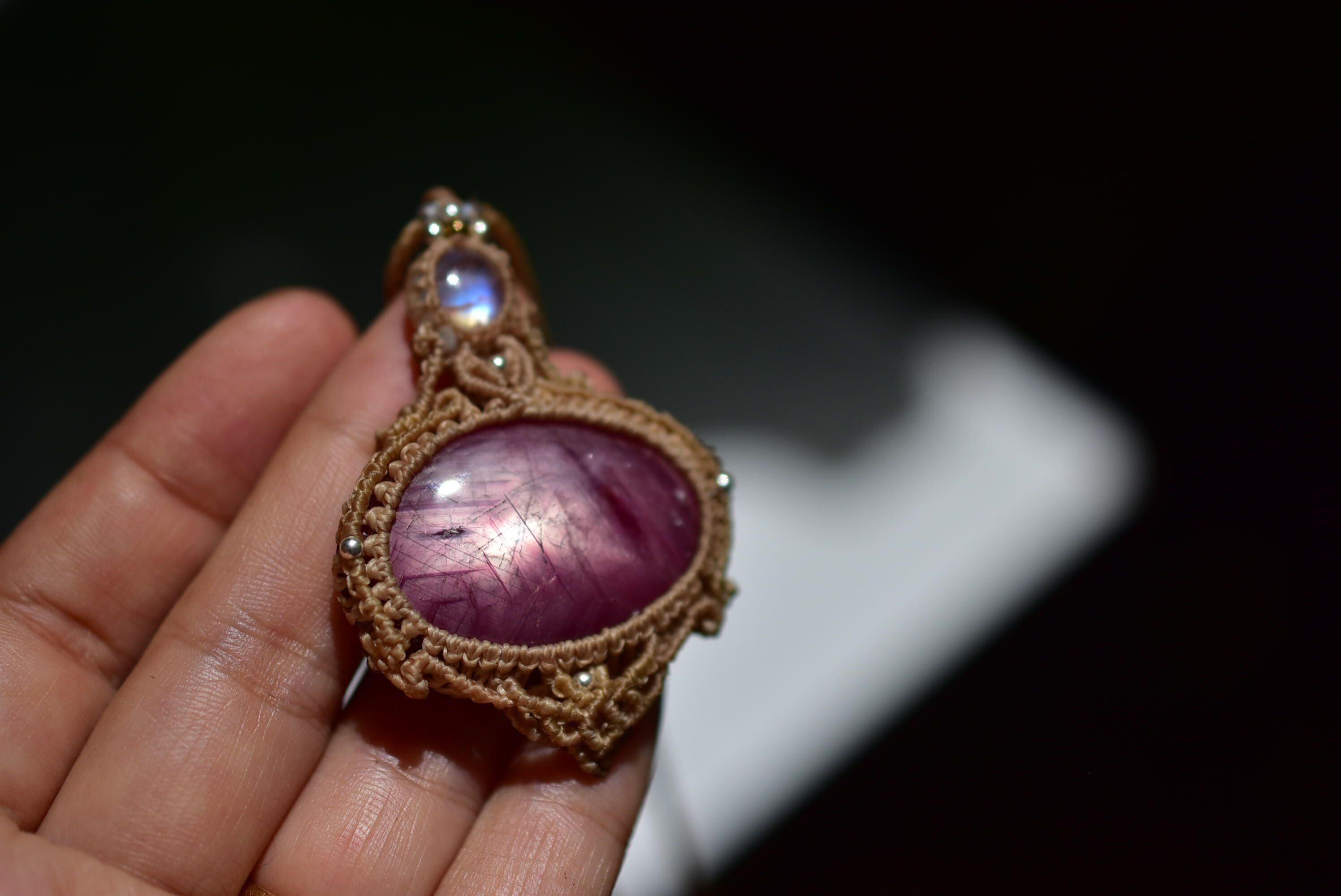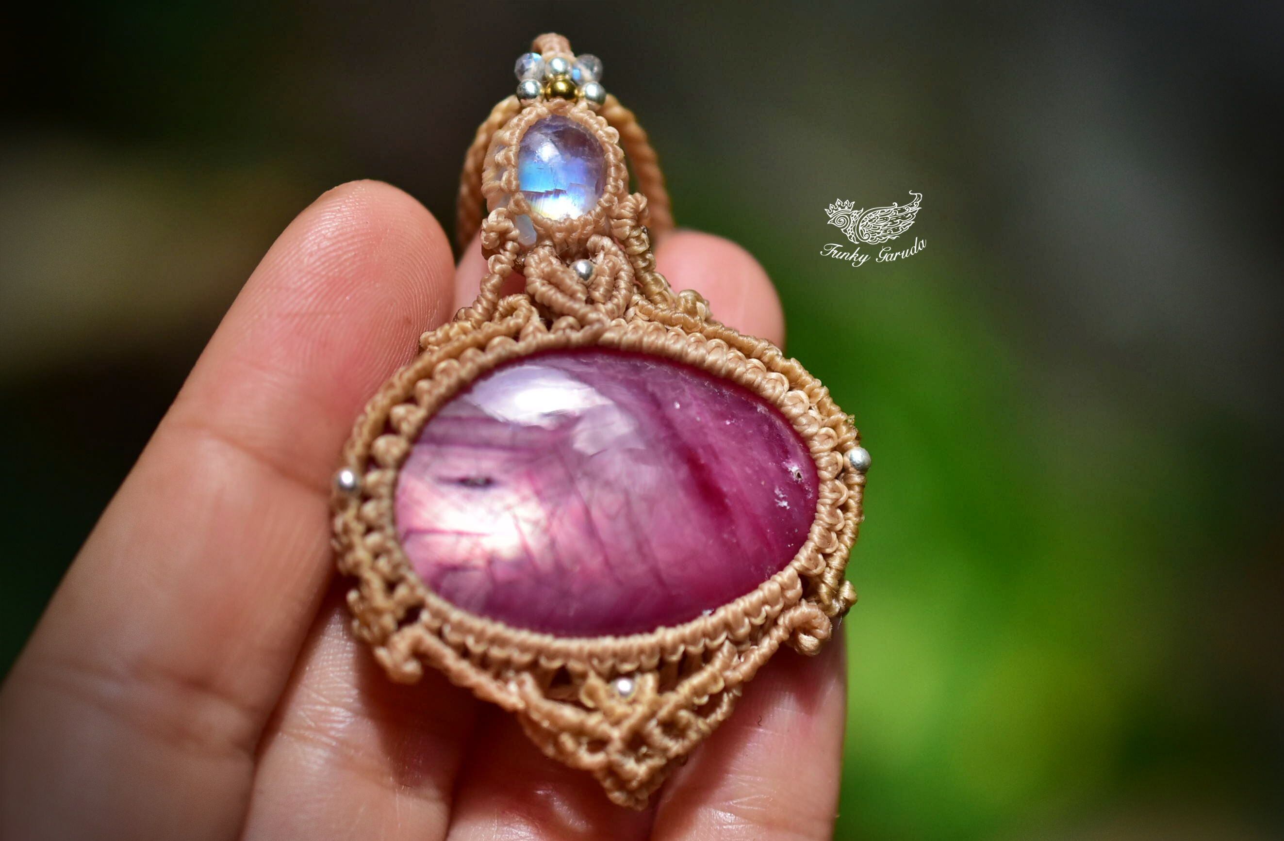 月と宝石果実★レインボームーンストーンとスタールビー マクラメペンダントruby046