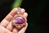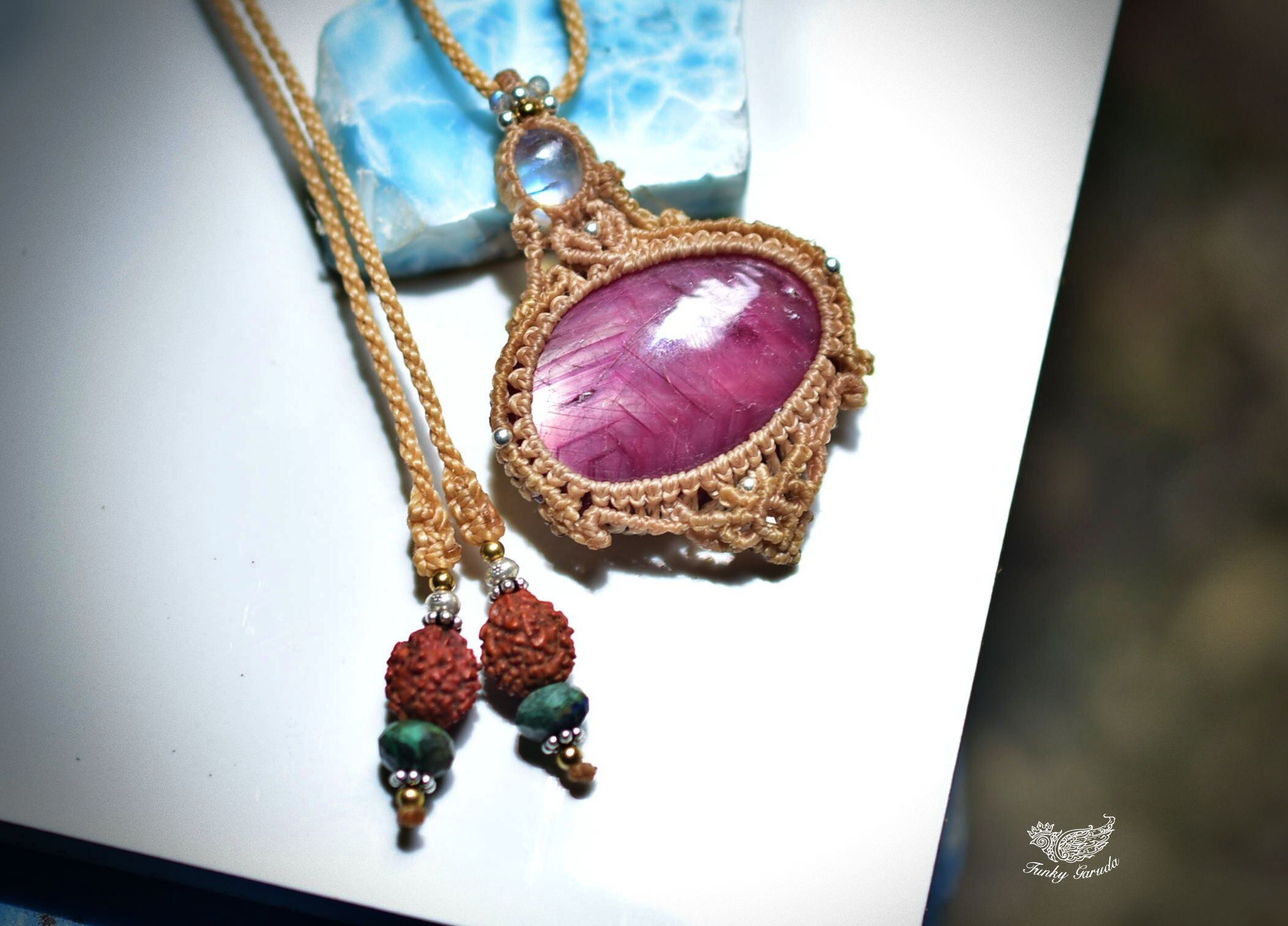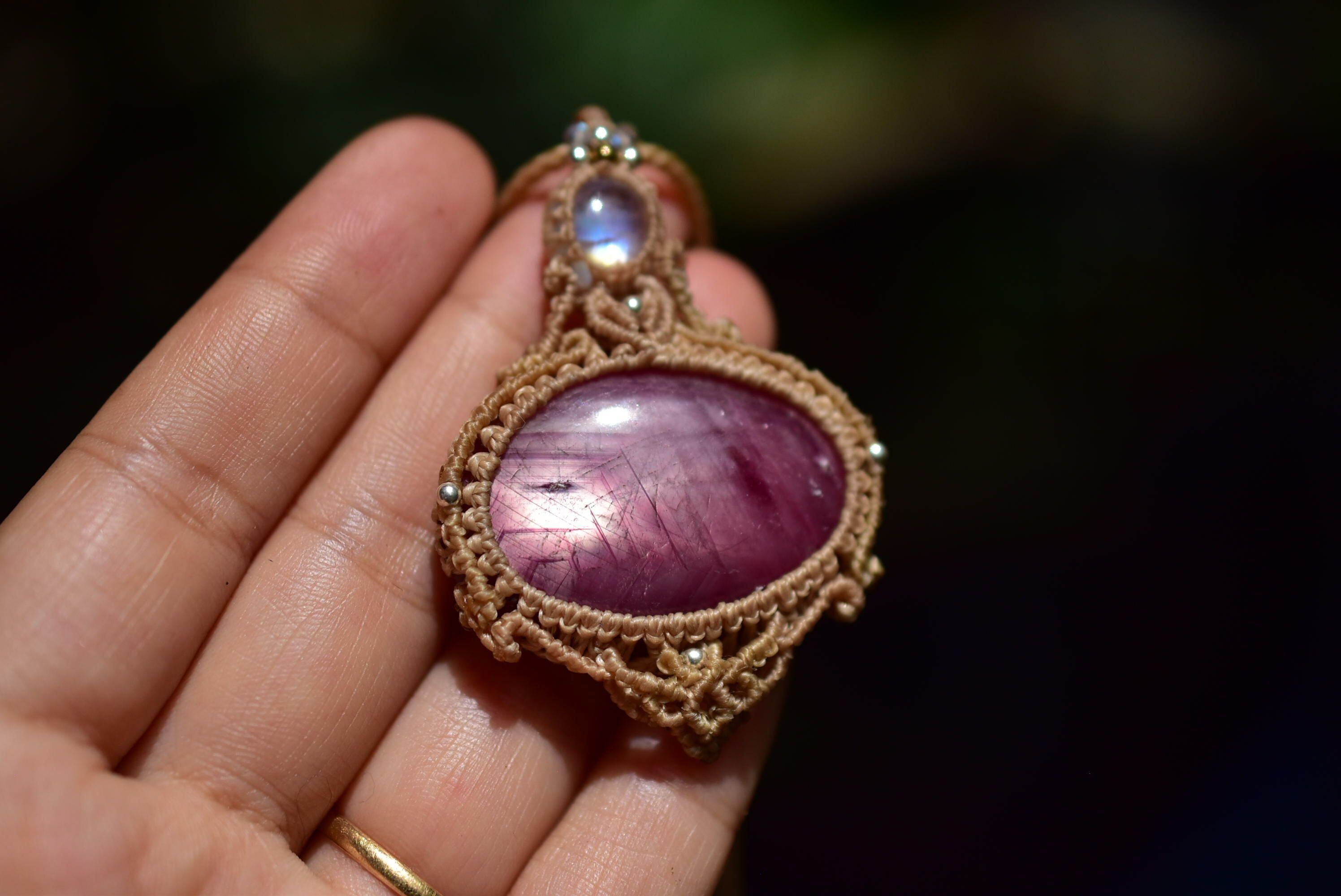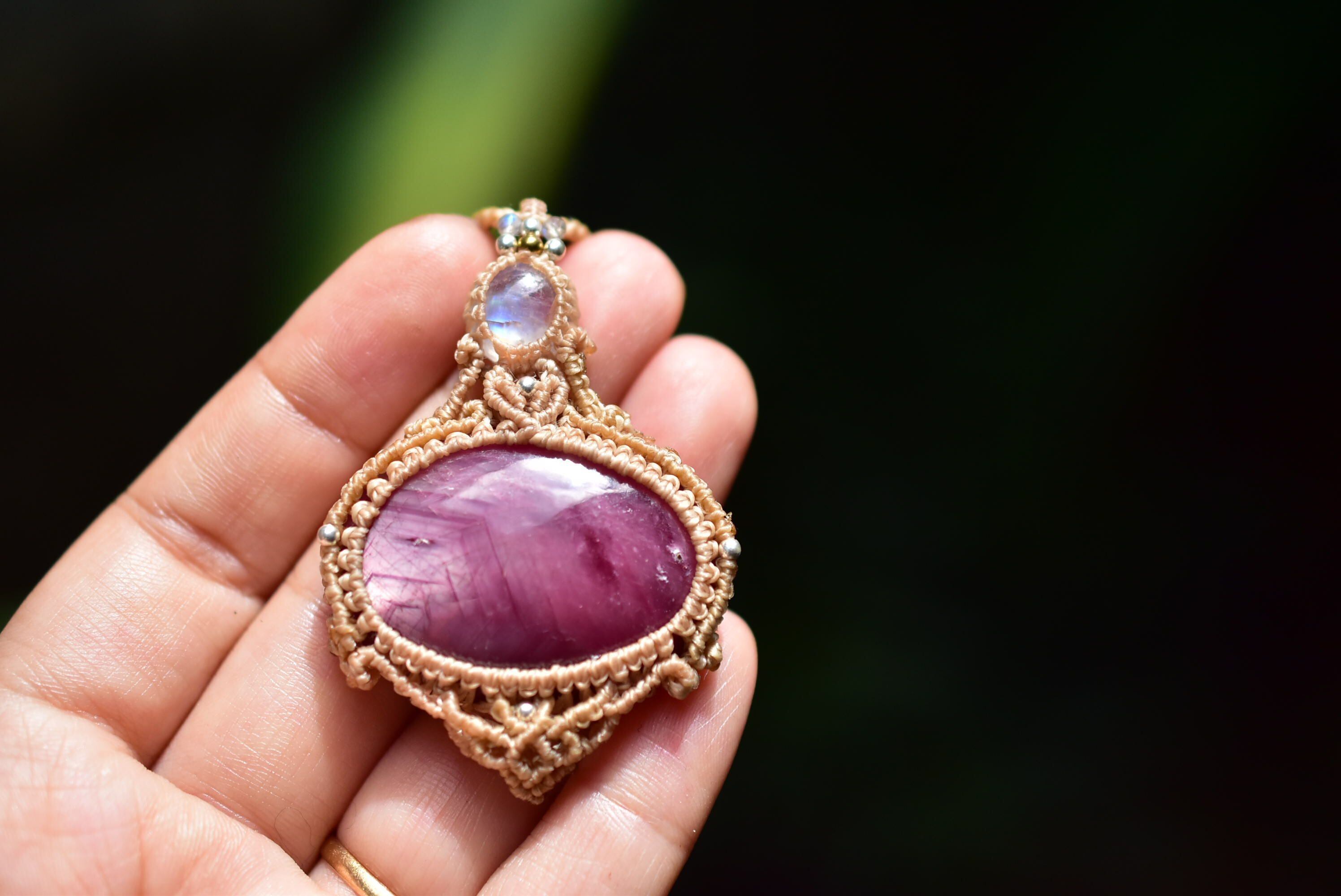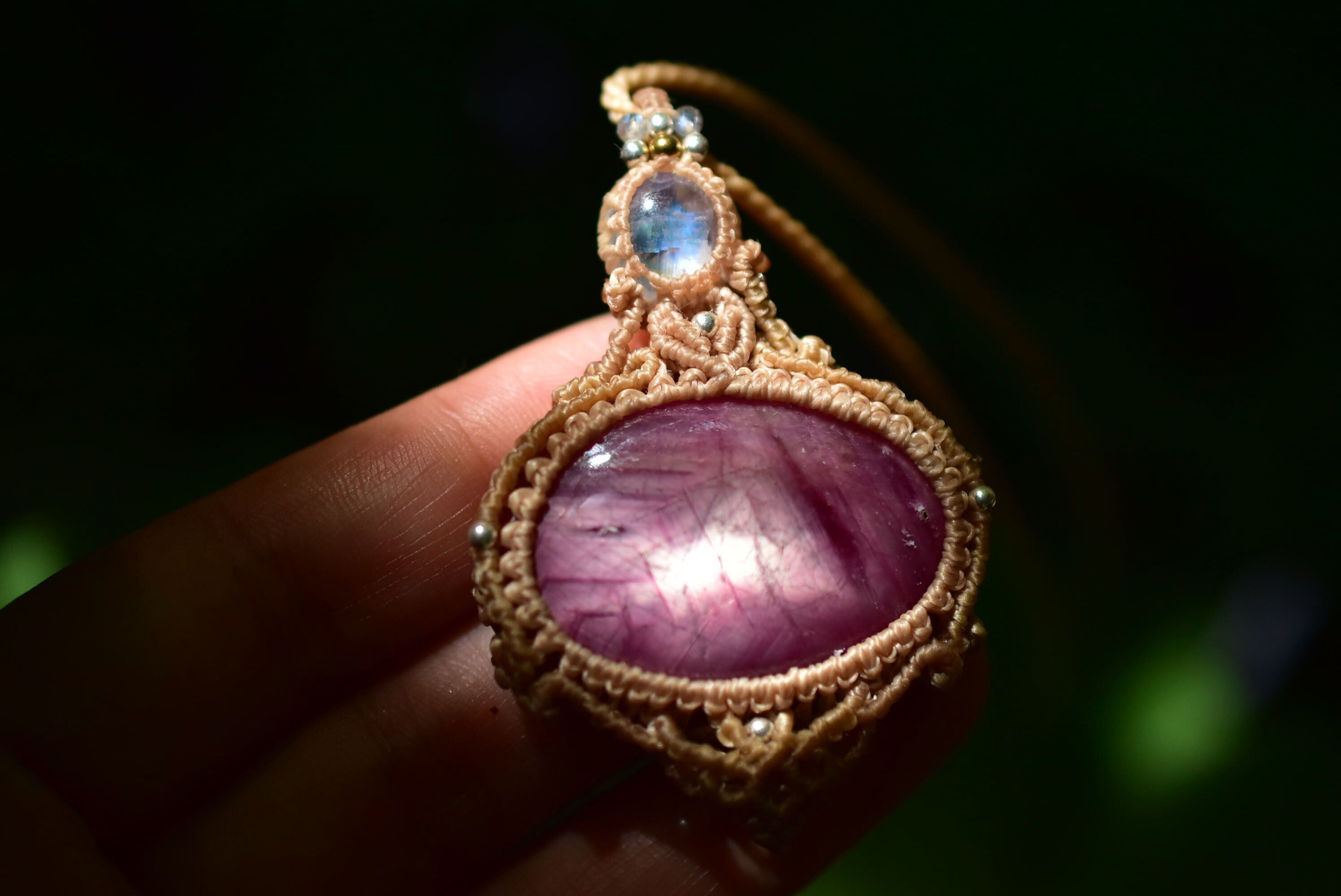 月と宝石果実★レインボームーンストーンとスタールビー マクラメペンダントruby046