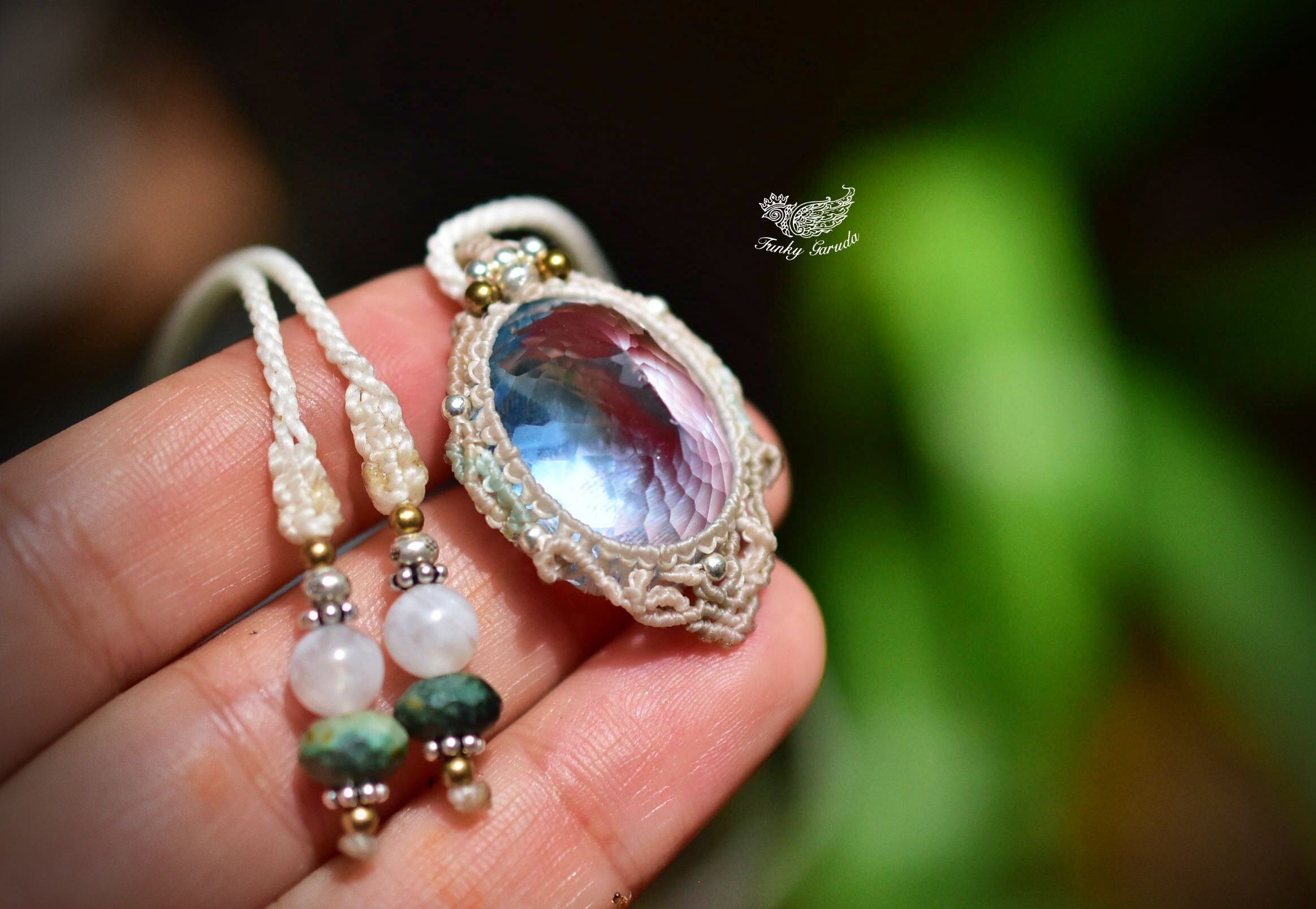 ◆このたびはナチュラルホワイト、ミント色の蝋引き糸を使用しマクラメ編み装飾を施しました。