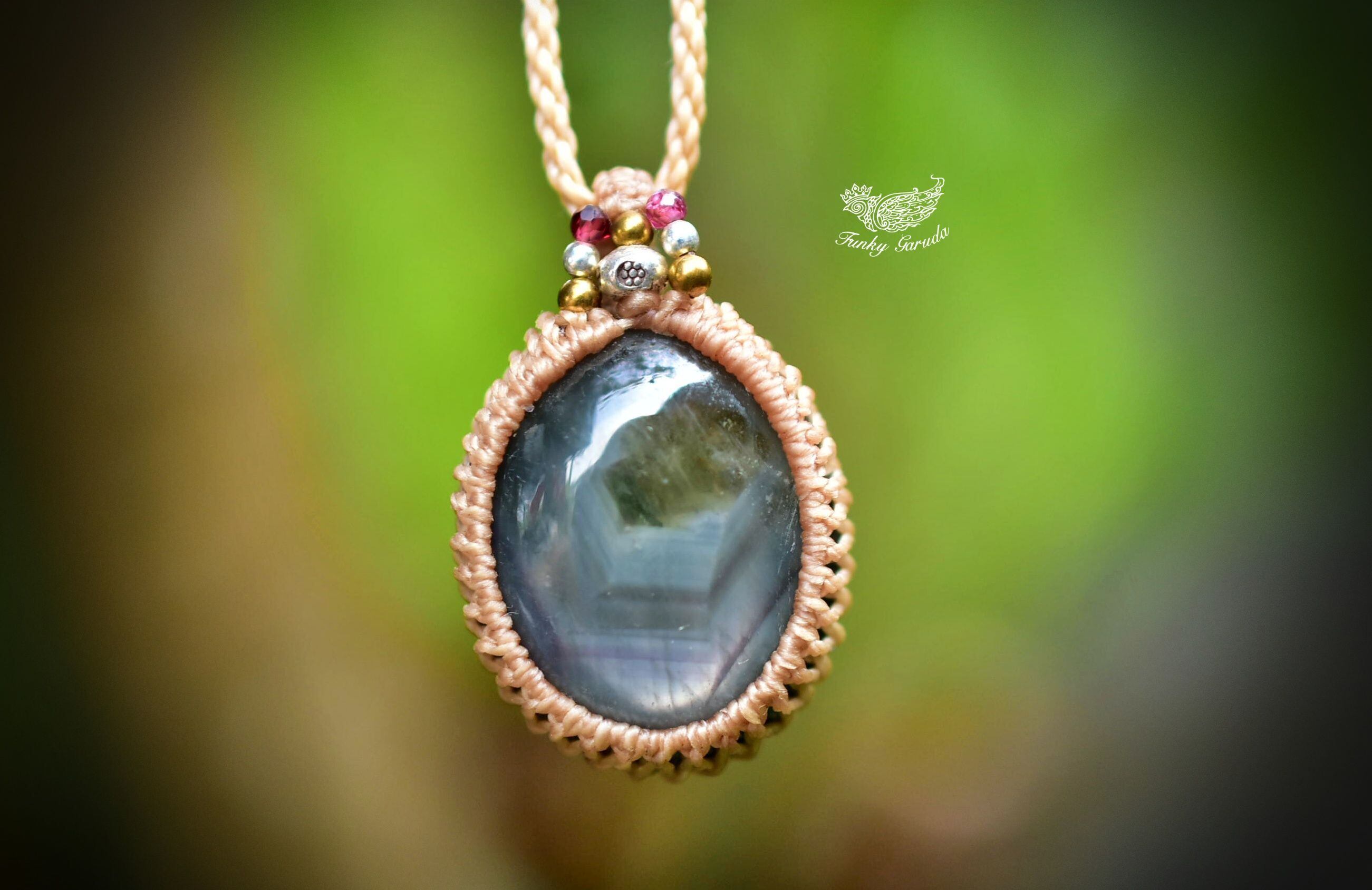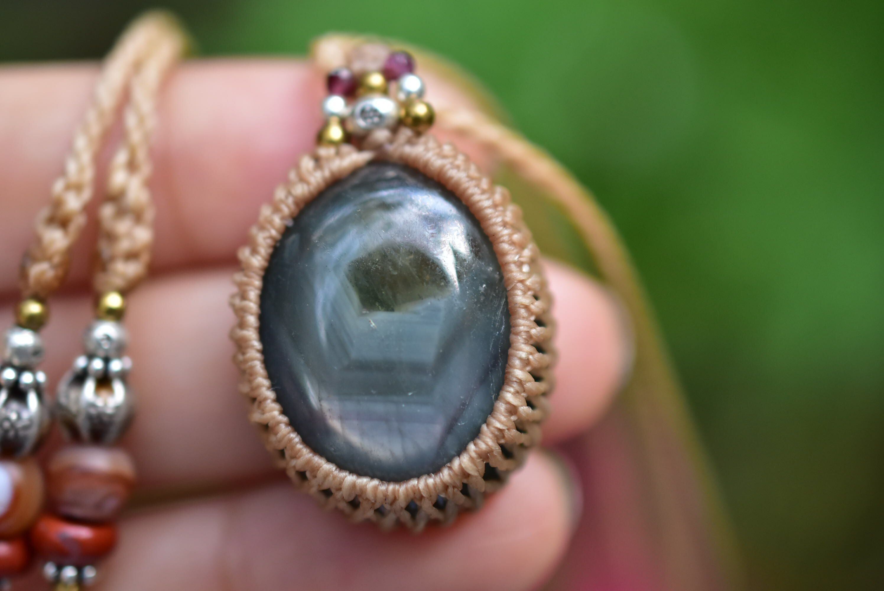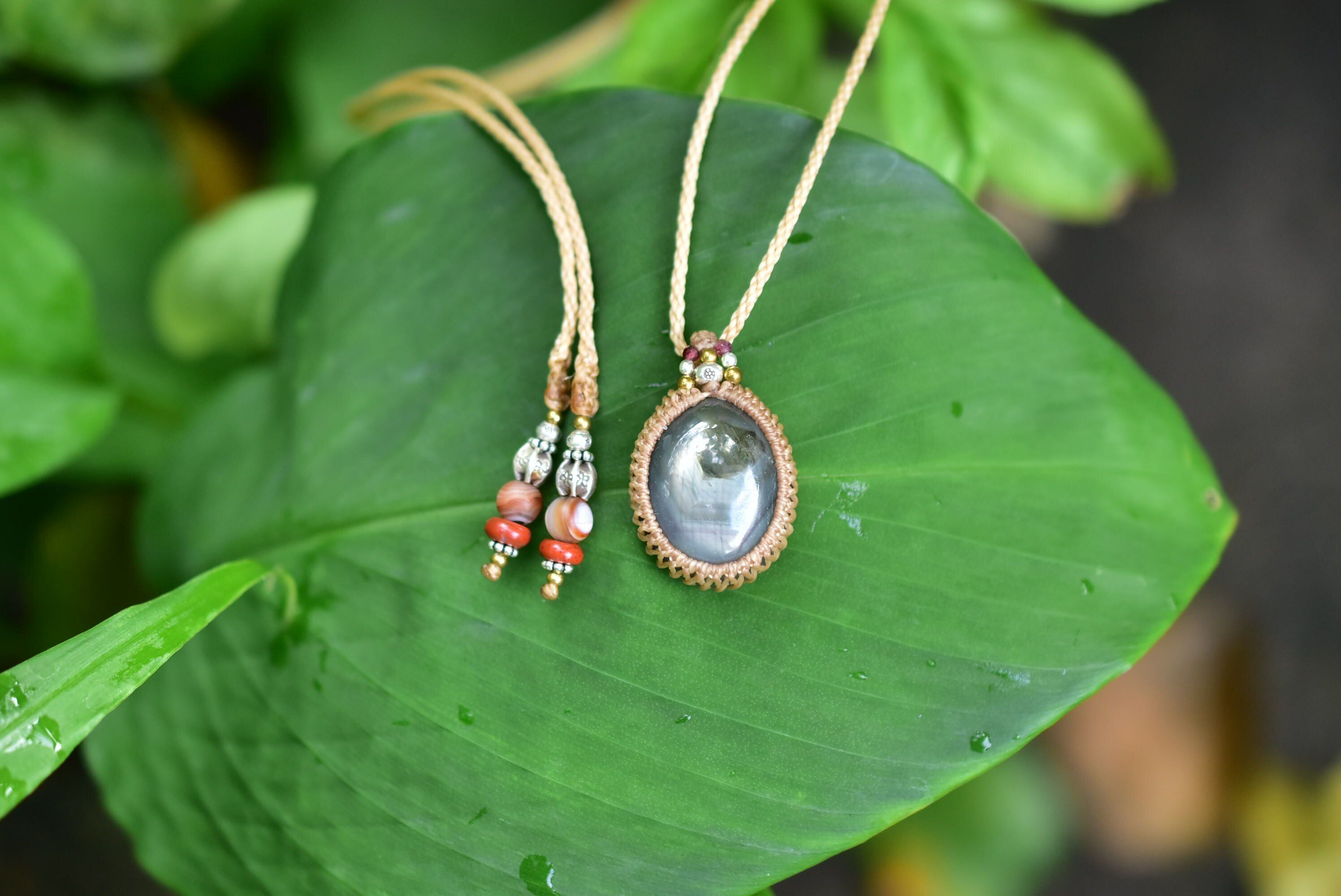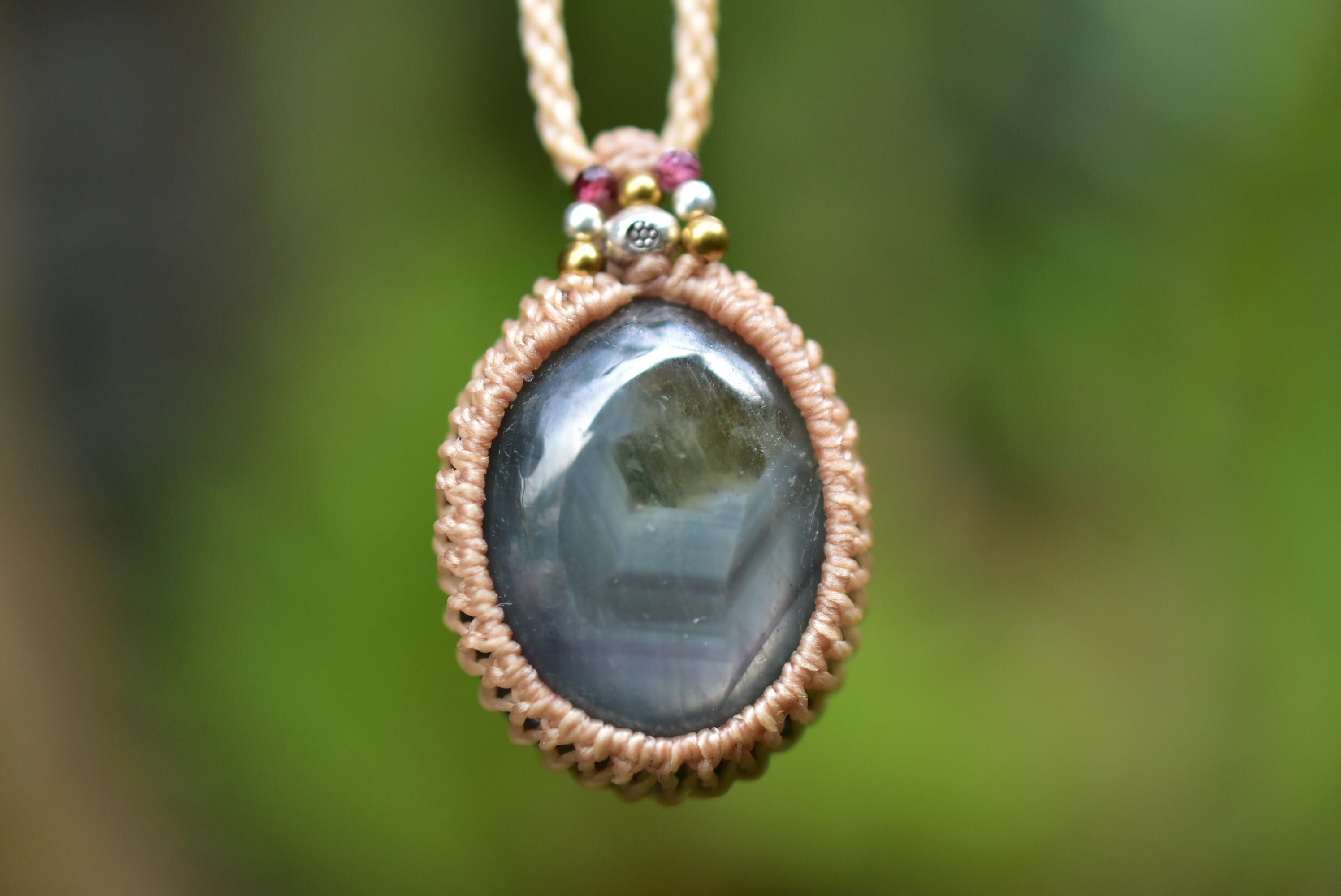 良質な半貴石 シルバーサファイアを、シンプルなマクラメペンダントに仕上げました。