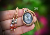 ◆このたびはキャラメル色の蝋引き糸を使用しマクラメ編み装飾を施しました。