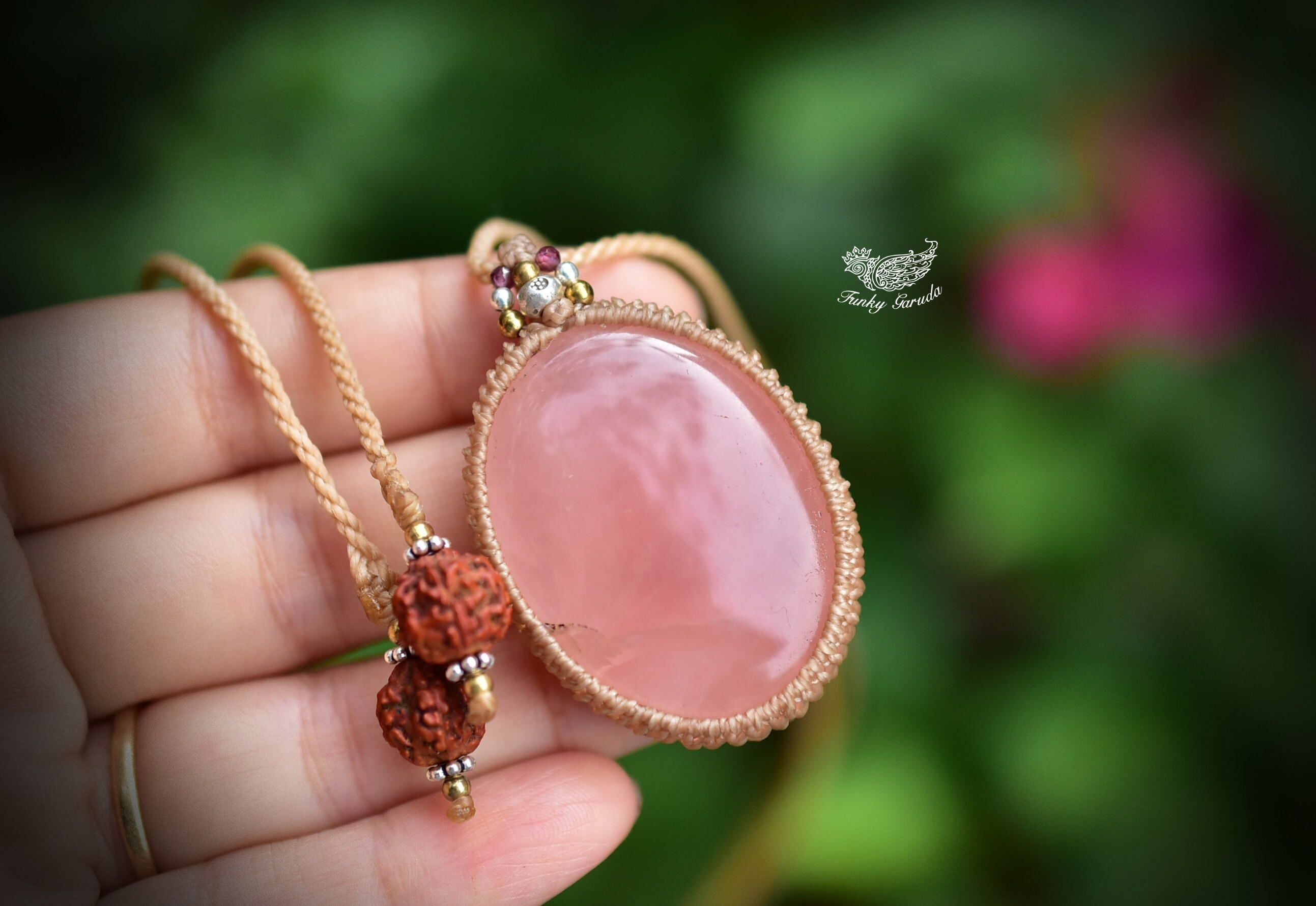 女性らしい魅力あふれるピースをシンプルなマクラメペンダントに仕上げました。