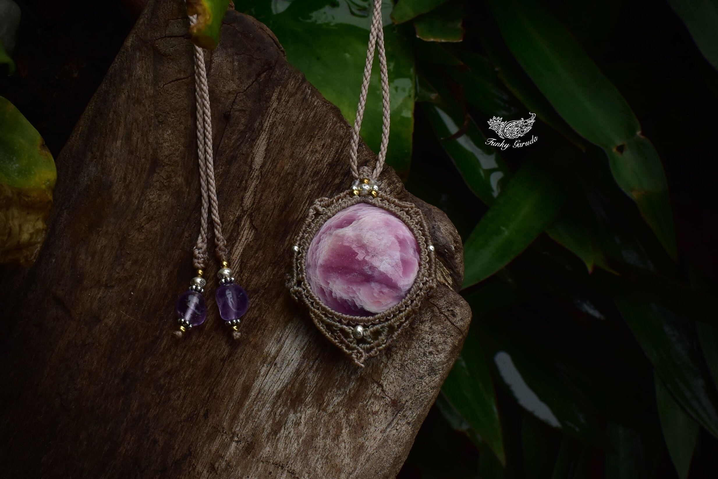 石の周りをマクラメ編み装飾・シルバーパーツをあしらって仕上げました。