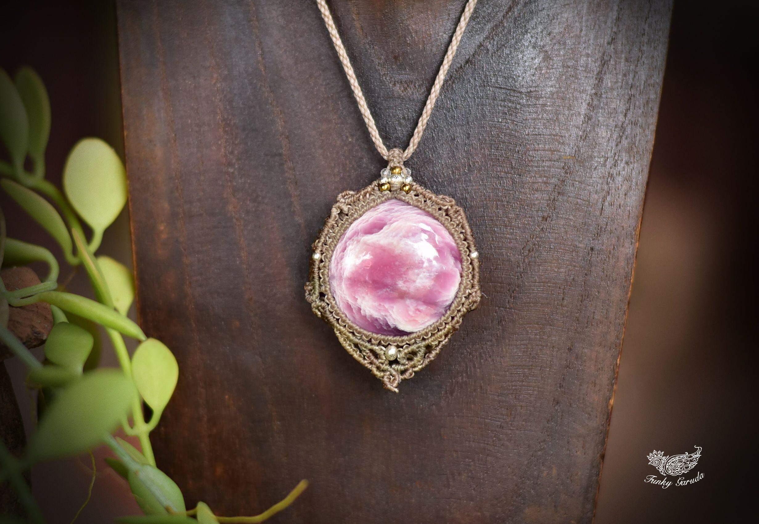 ◆このたびはカフェオレ色の蝋引き糸を使用しマクラメ編み装飾を施しました。