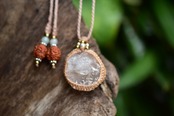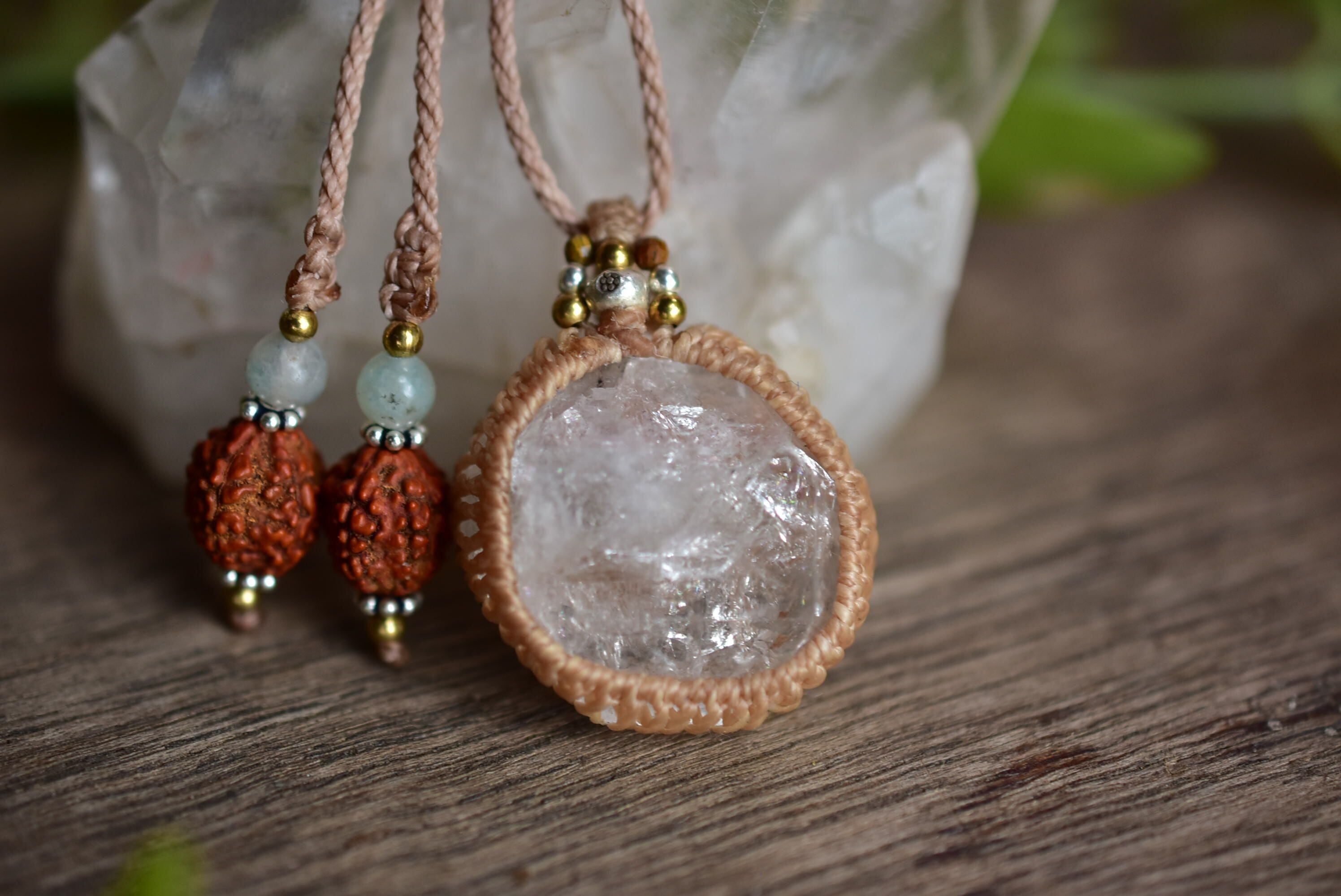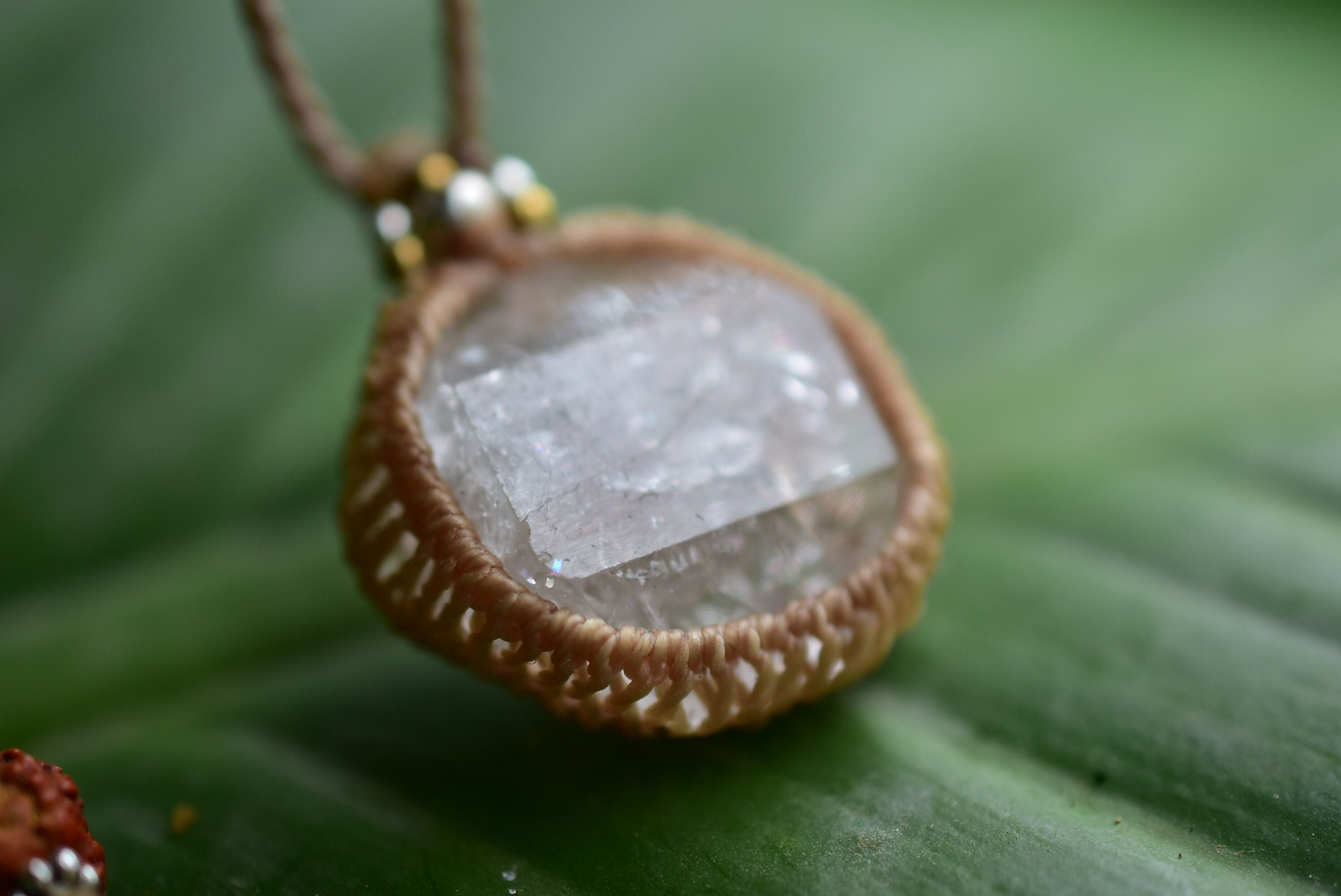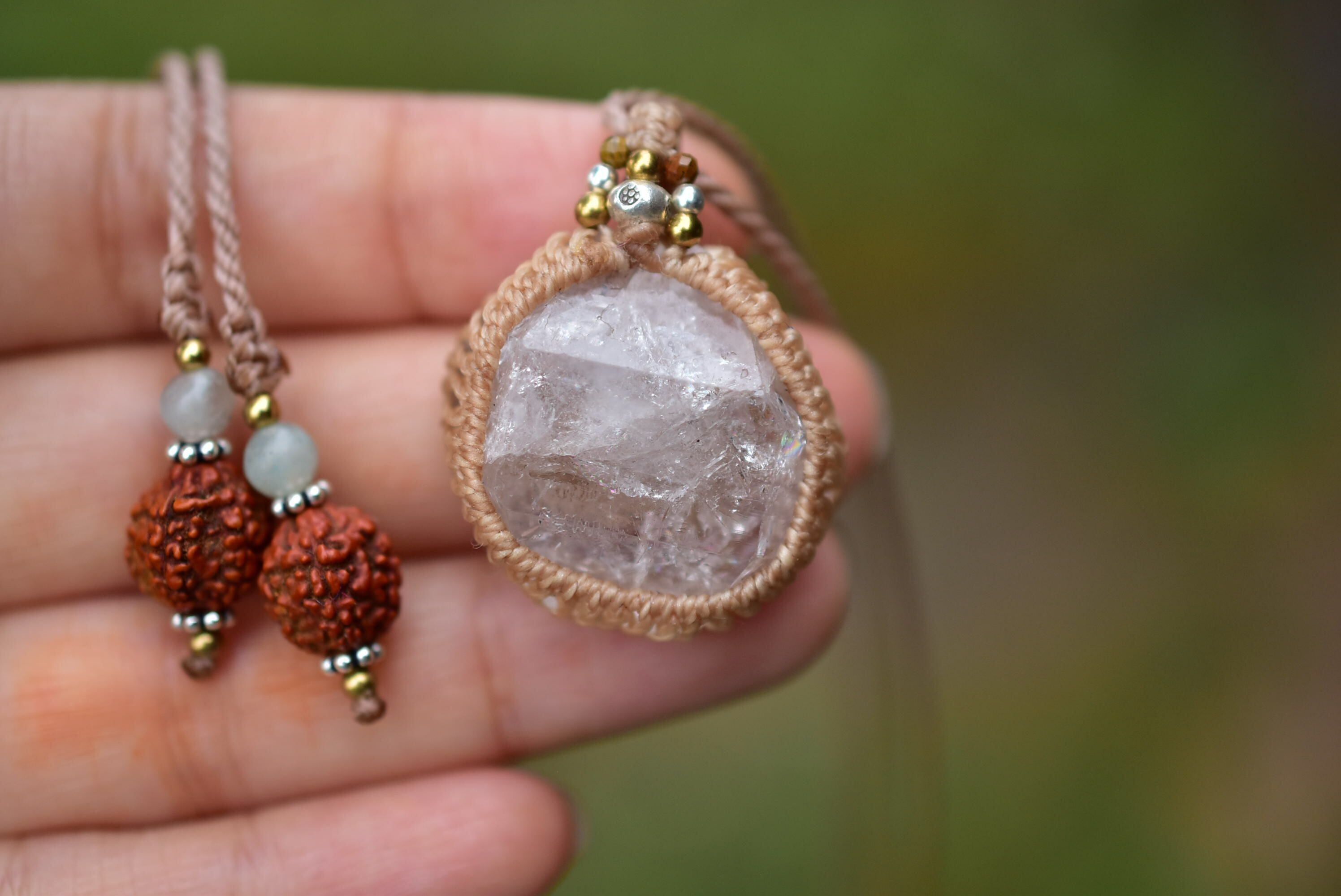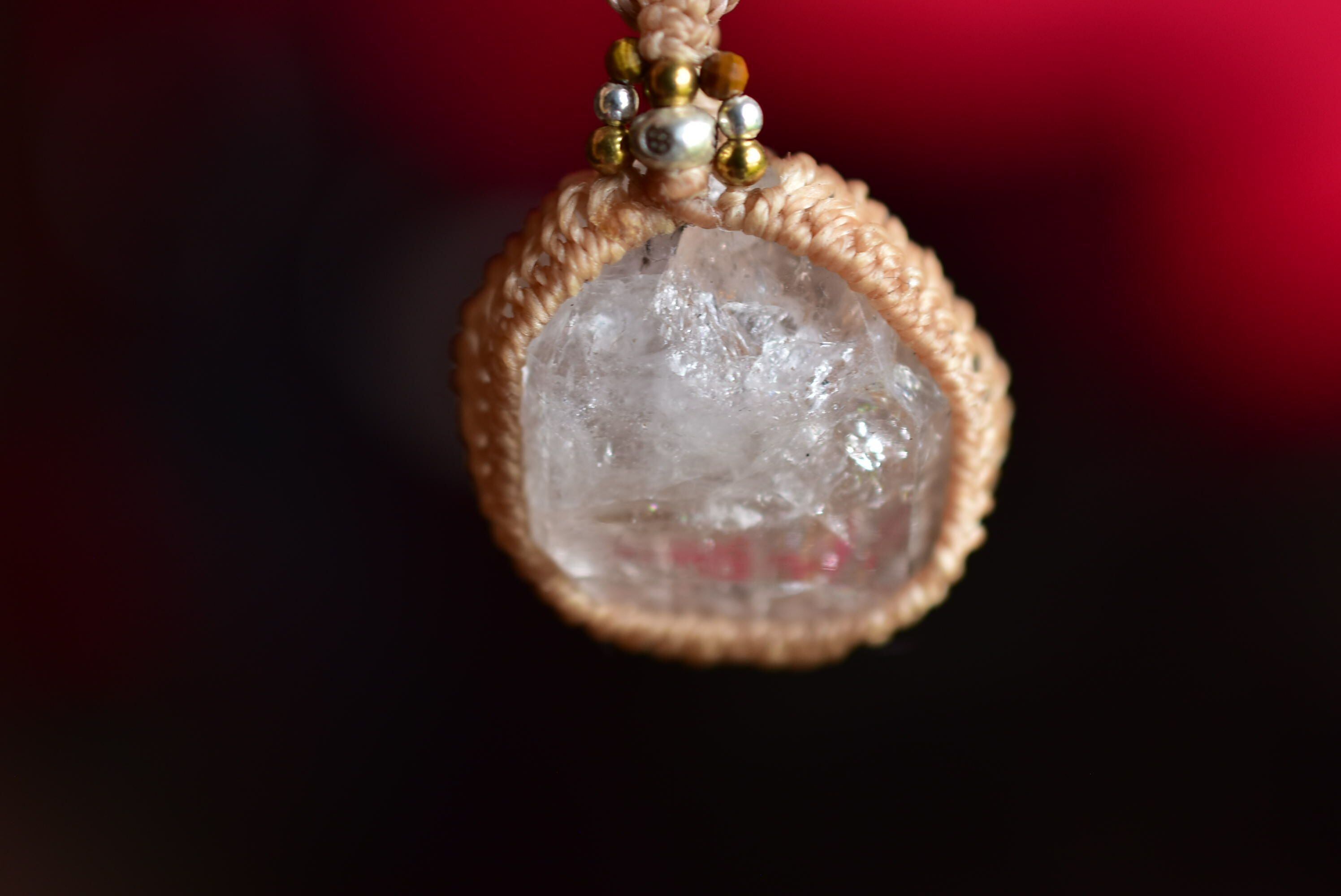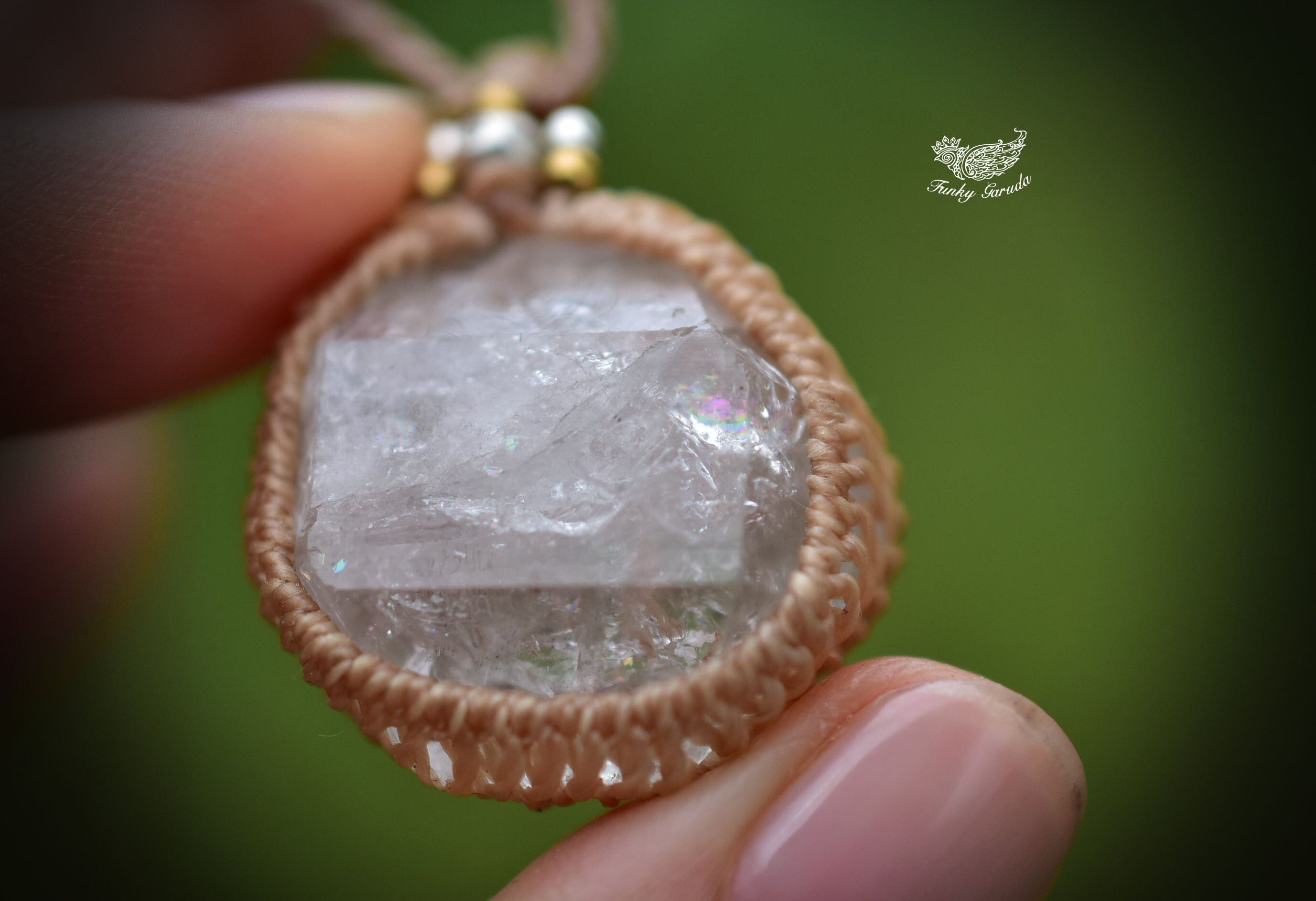 純白の煌めき★虹入り★ハーキマー水晶 原石 マクラメペンダントhky004