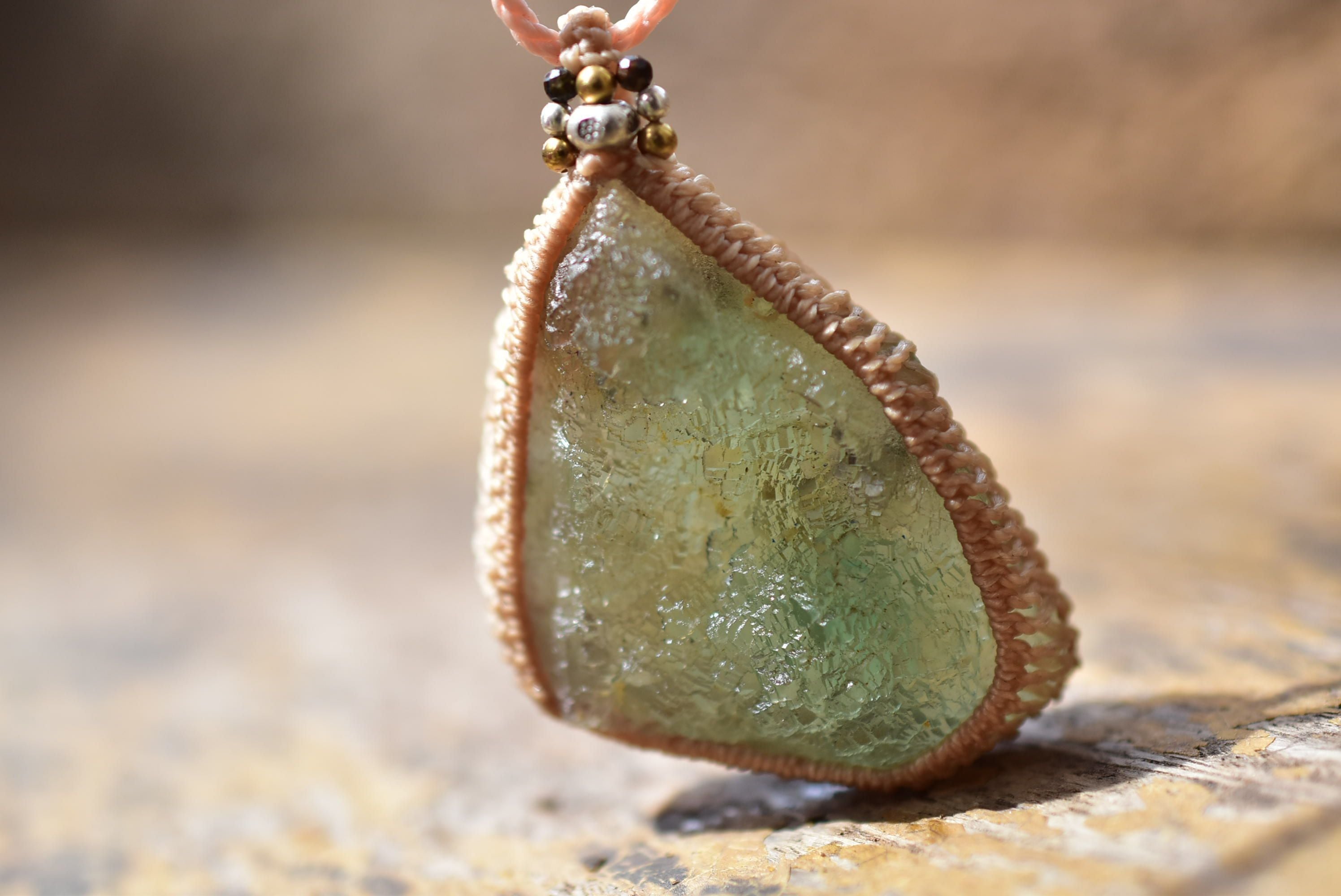 ◆このたびはキャラメル色の蝋引き糸を使用しマクラメ編み装飾を施しました。