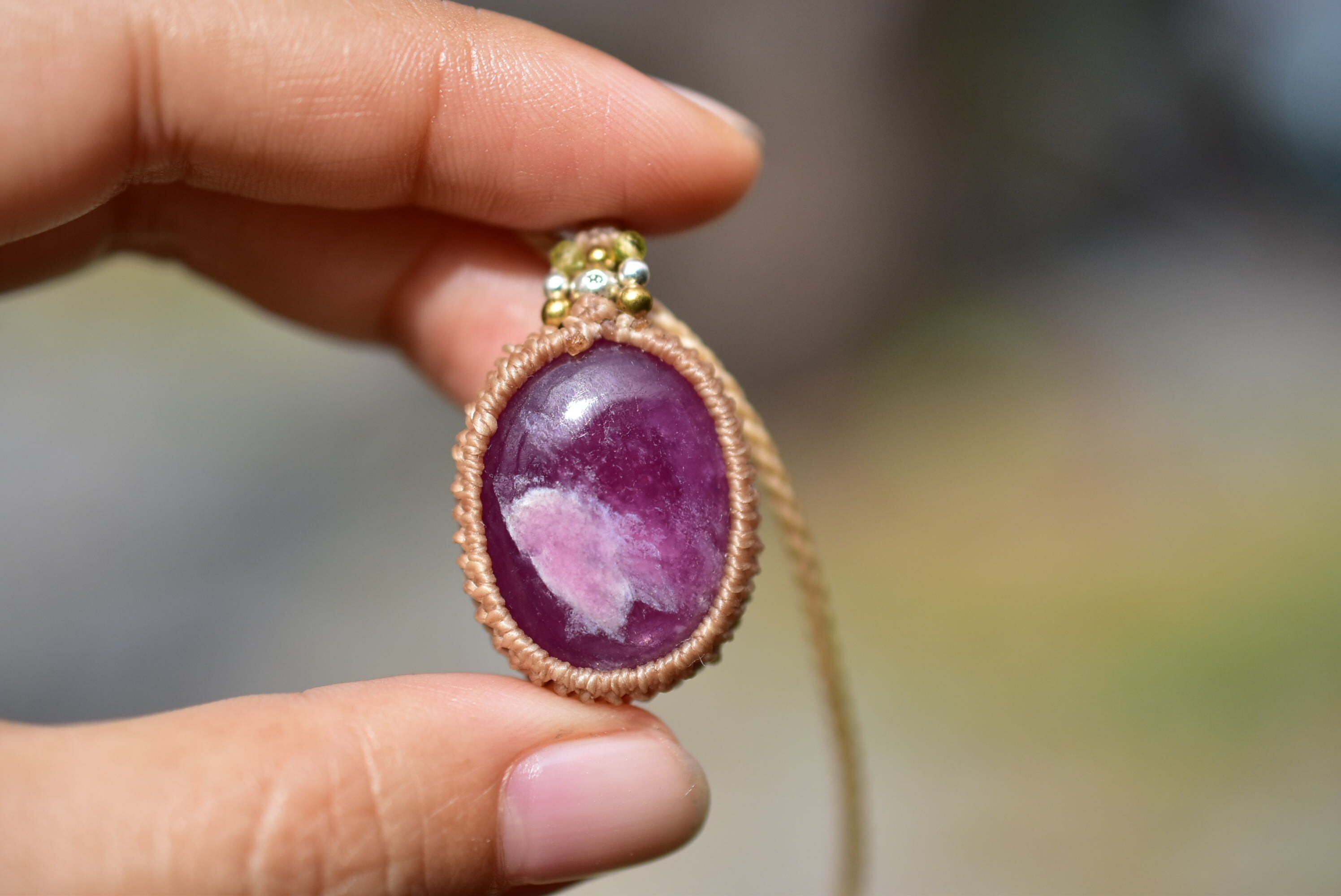 ホワイト内包物★ディープローズ ルビー マクラメペンダント rubyy022