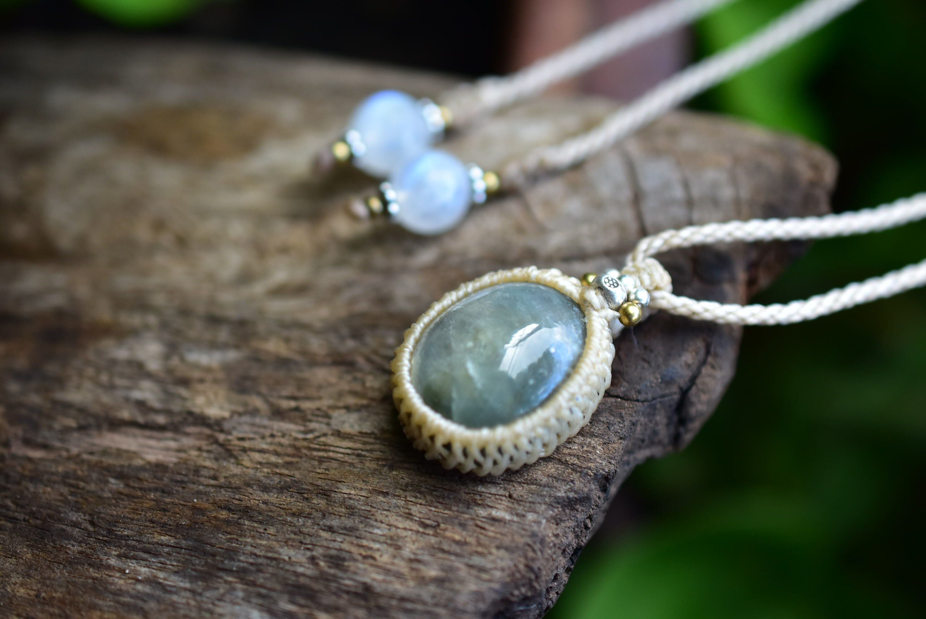 ◆このたびはヘンプ色の蝋引き糸を使用しマクラメ編み装飾を施しました。